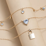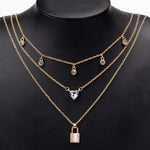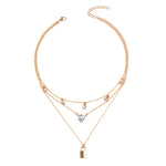 Three Layer Stacking Necklace Gold Plated Rhinestone Heart Lock Charm Necklace