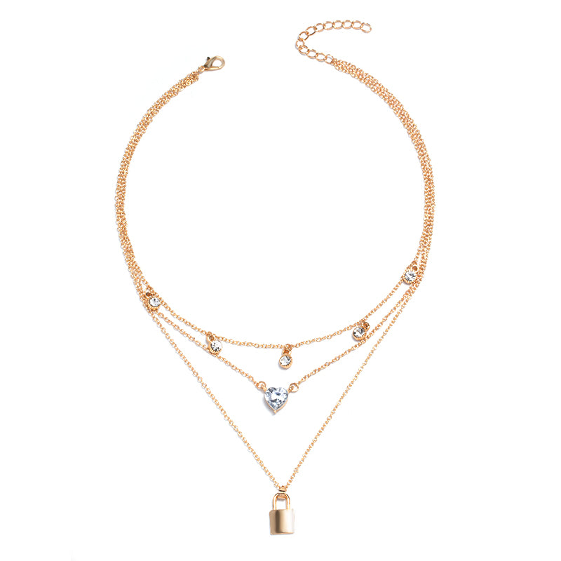 Item Name - Three Layer Stacking Necklace Gold Plated Rhinestone Heart Lock Charm Necklace