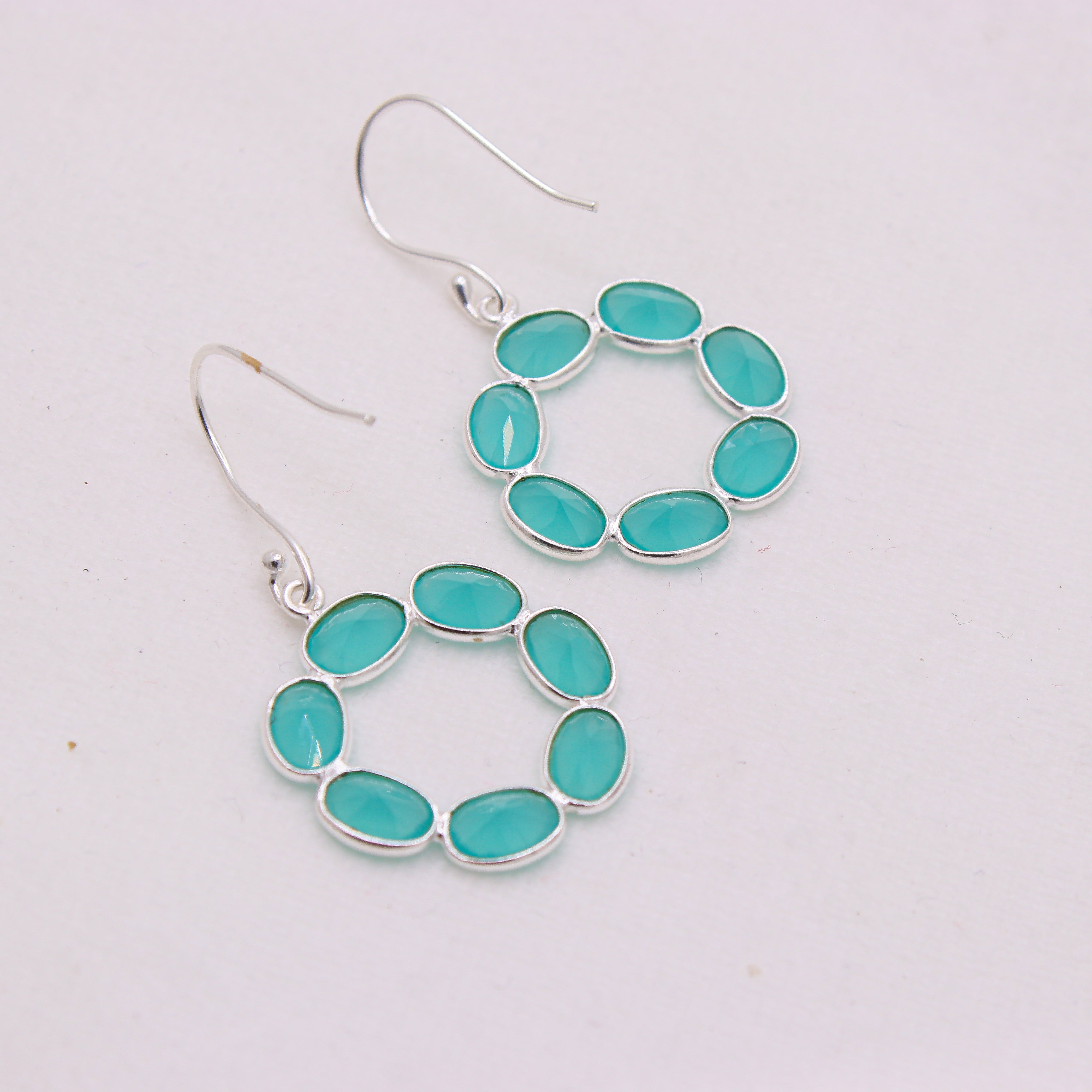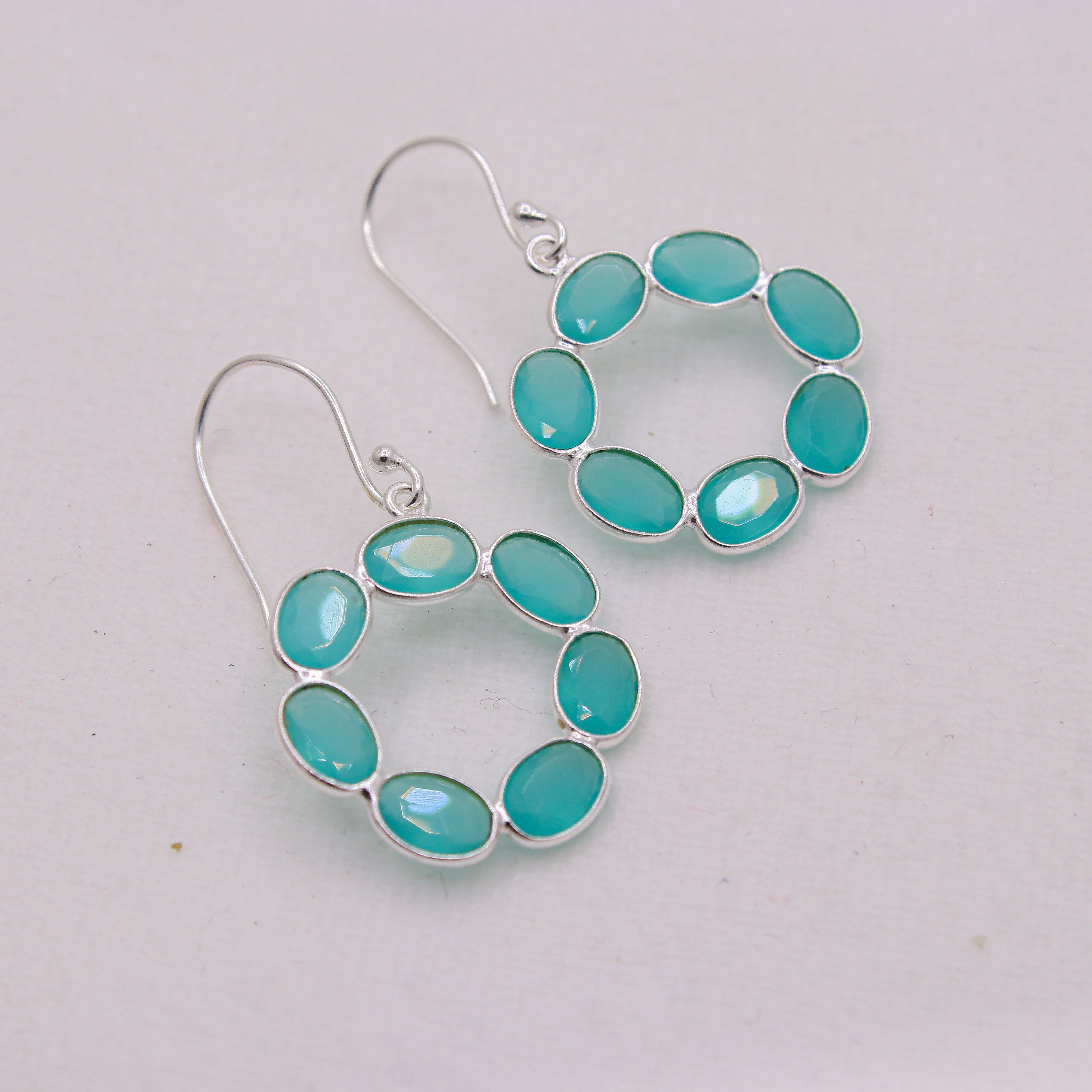 Add a fresh pop of color to your jewelry collection with these Natural Aqua Chalcedony Hoop Earrings, handcrafted in 925 sterling silver. Featuring smooth oval-cut chalcedony gemstones arranged in an elegant open-circle design, these earrings offer a perfect balance of modern minimalism and boho charm.