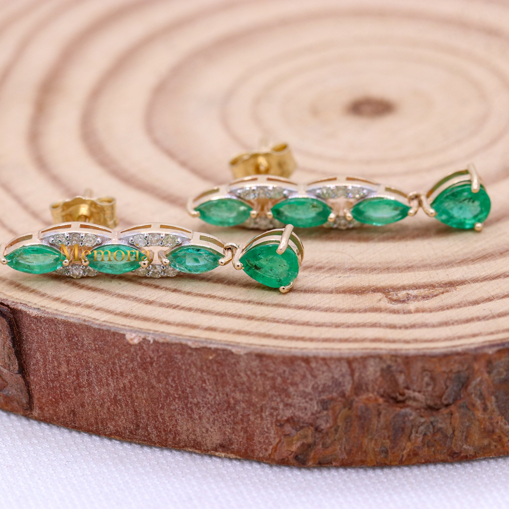 Buy Best Quality Certified Designer Natural Emerald Marquise & Pear Shaped Faceted Cut Spiritual Chakra Healing Gemstone With Diamond Stud Earring In 14k Yellow Gold