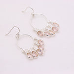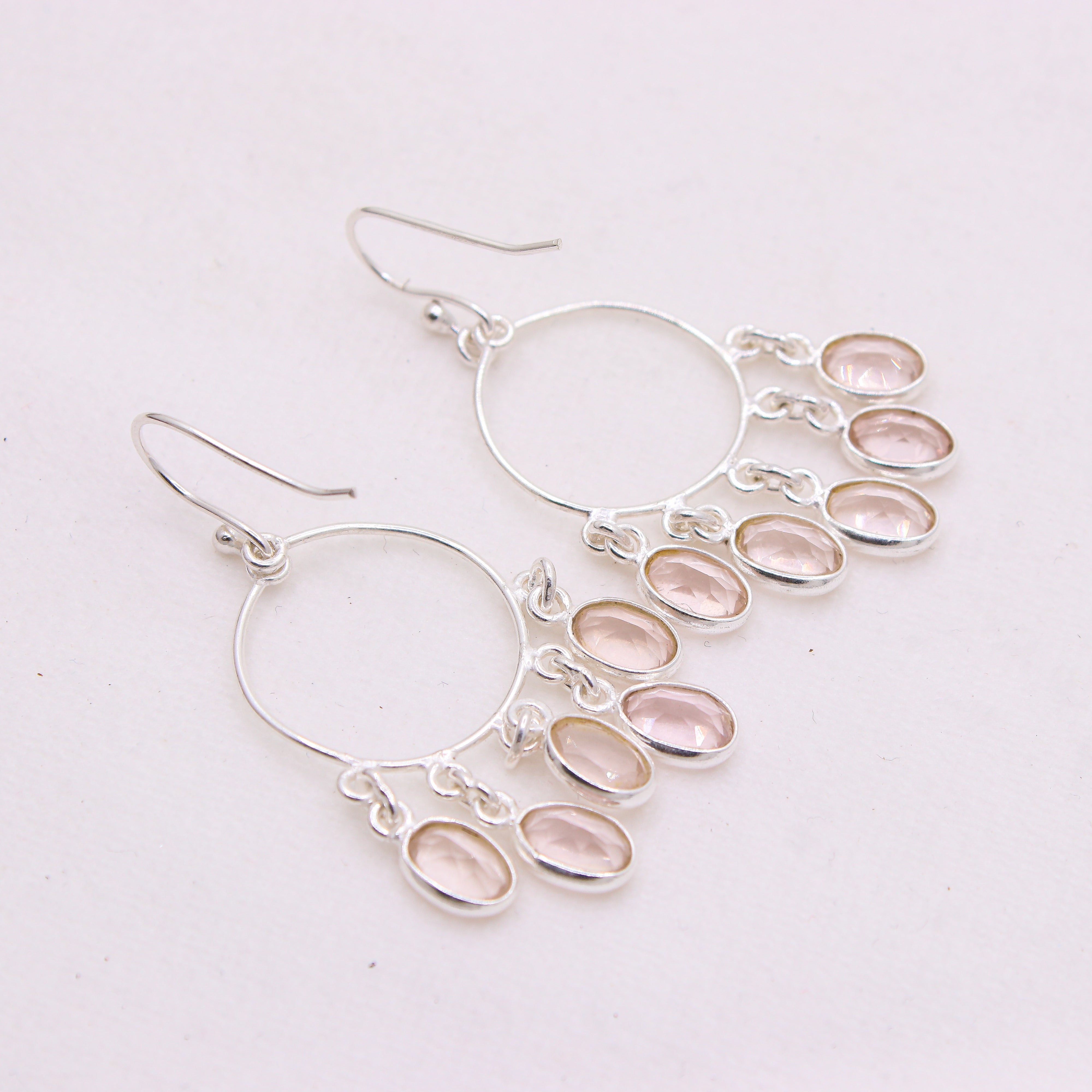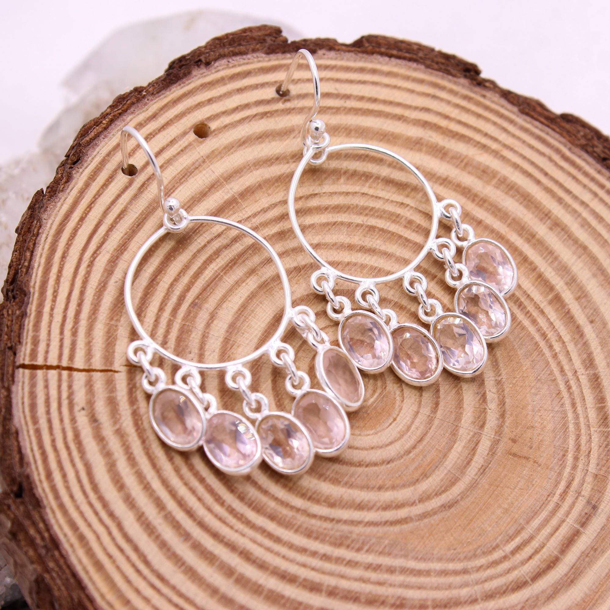 Natural Rose Quartz Chandelier Hoop Earrings 925 Sterling Silver Pink Gemstone Dangle Earrings