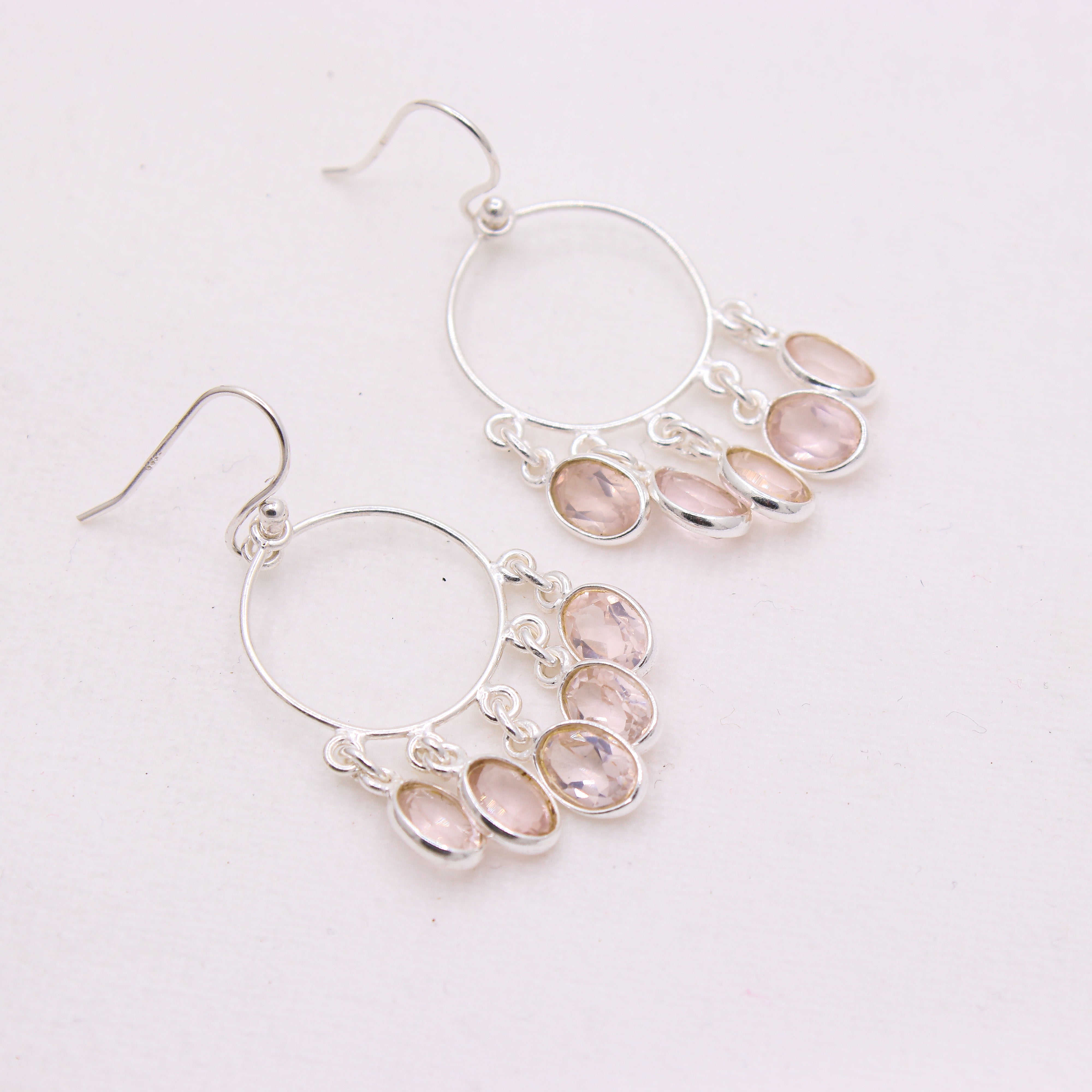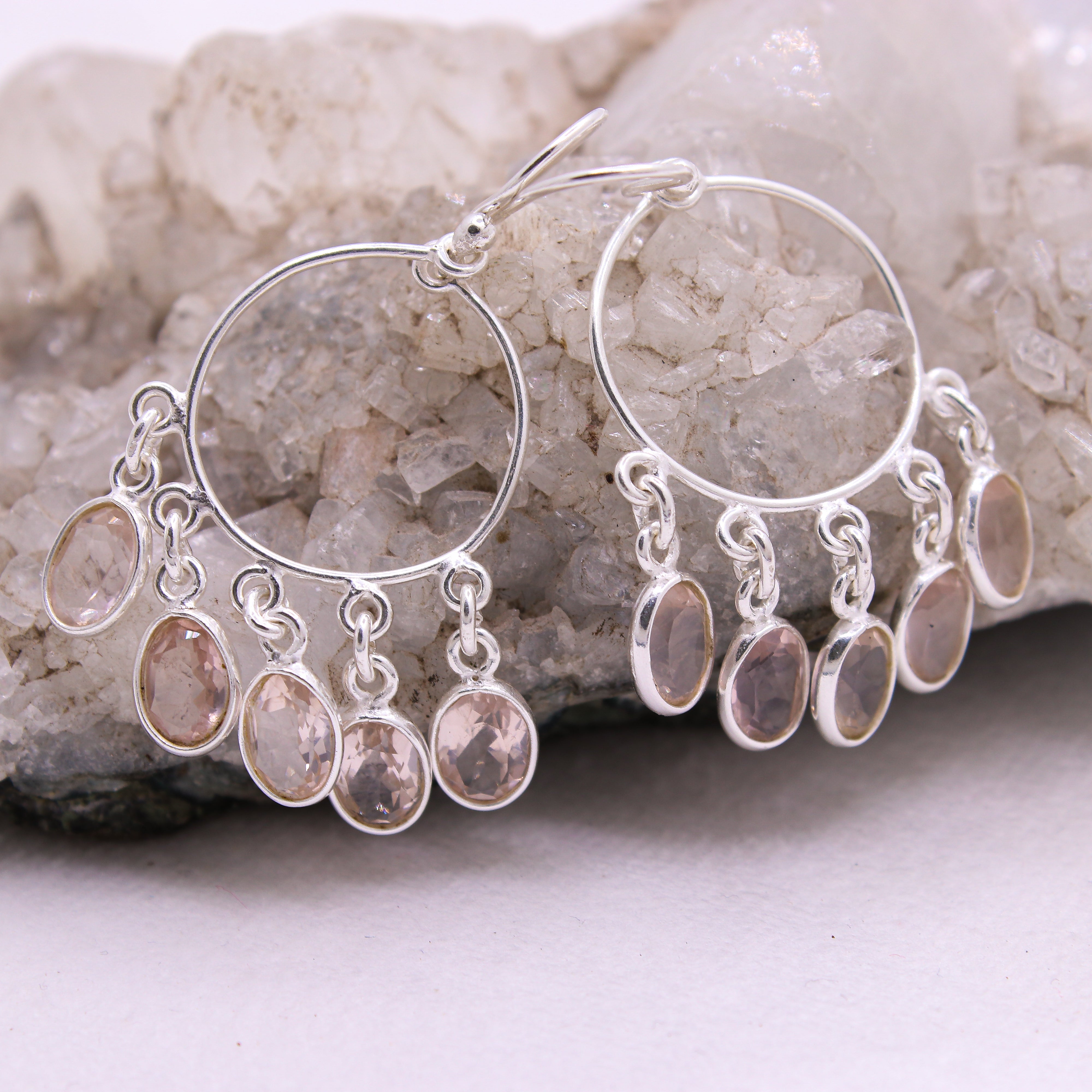 Add soft elegance to your look with these natural rose quartz chandelier hoop earrings, beautifully handcrafted in polished sterling silver. Featuring delicate oval-cut rose quartz gemstones, these earrings offer a graceful dangling design that catches the light with every movement.