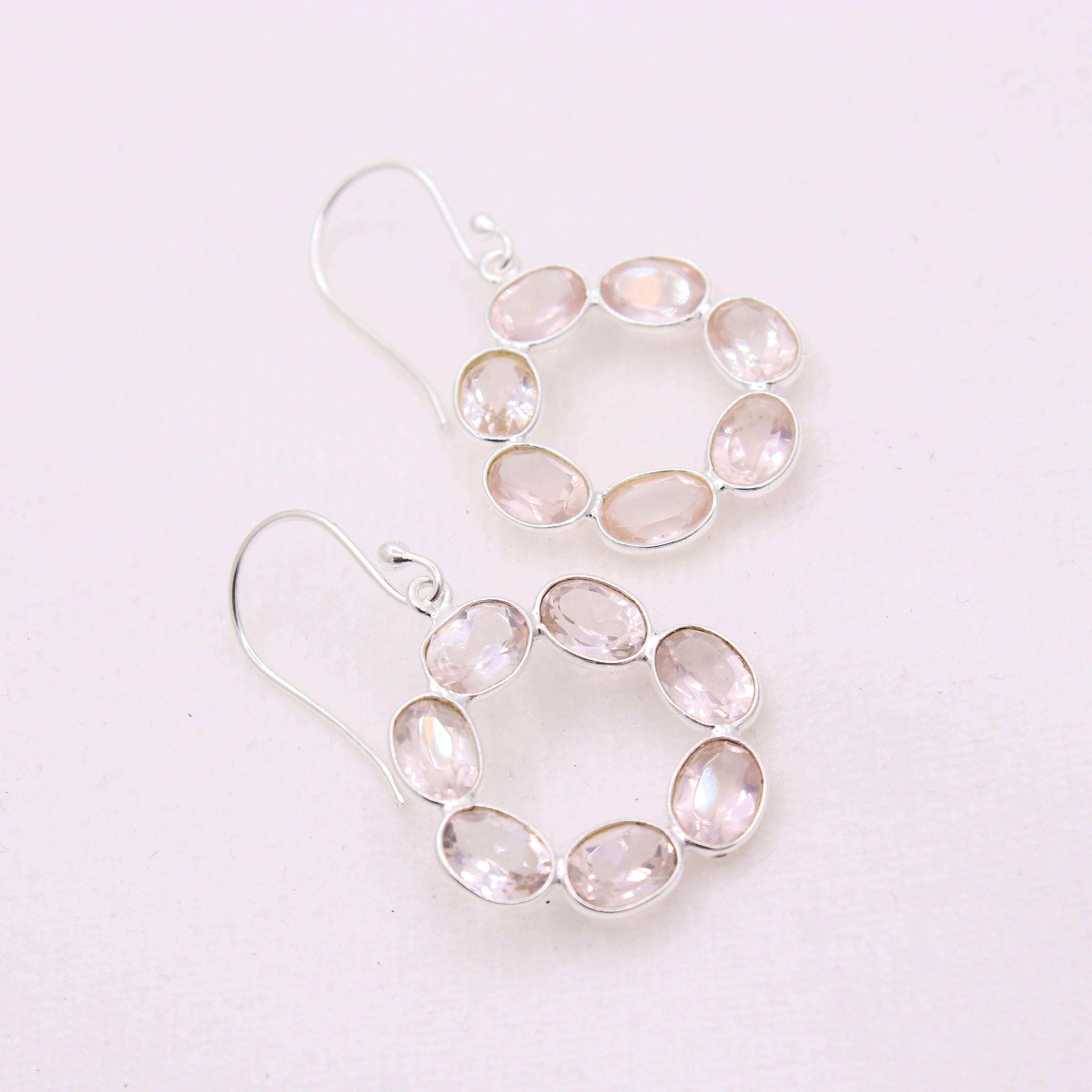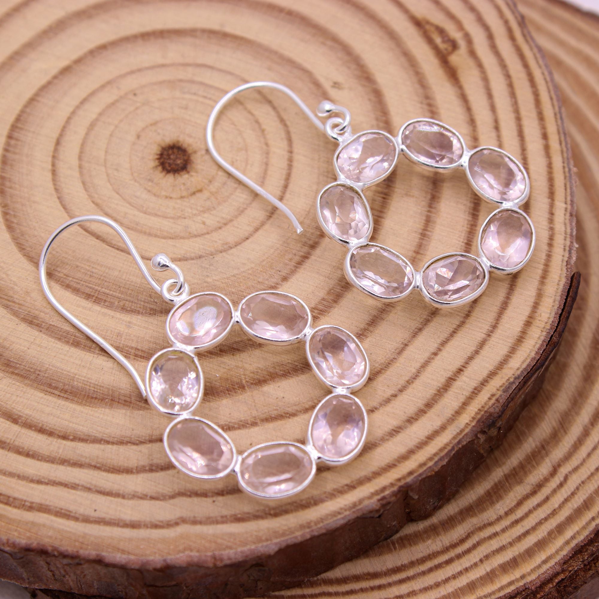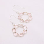 Natural Rose Quartz Oval Hoop Earrings in 925 Sterling Silver Handmade Pink Gemstone Dangle Earrings