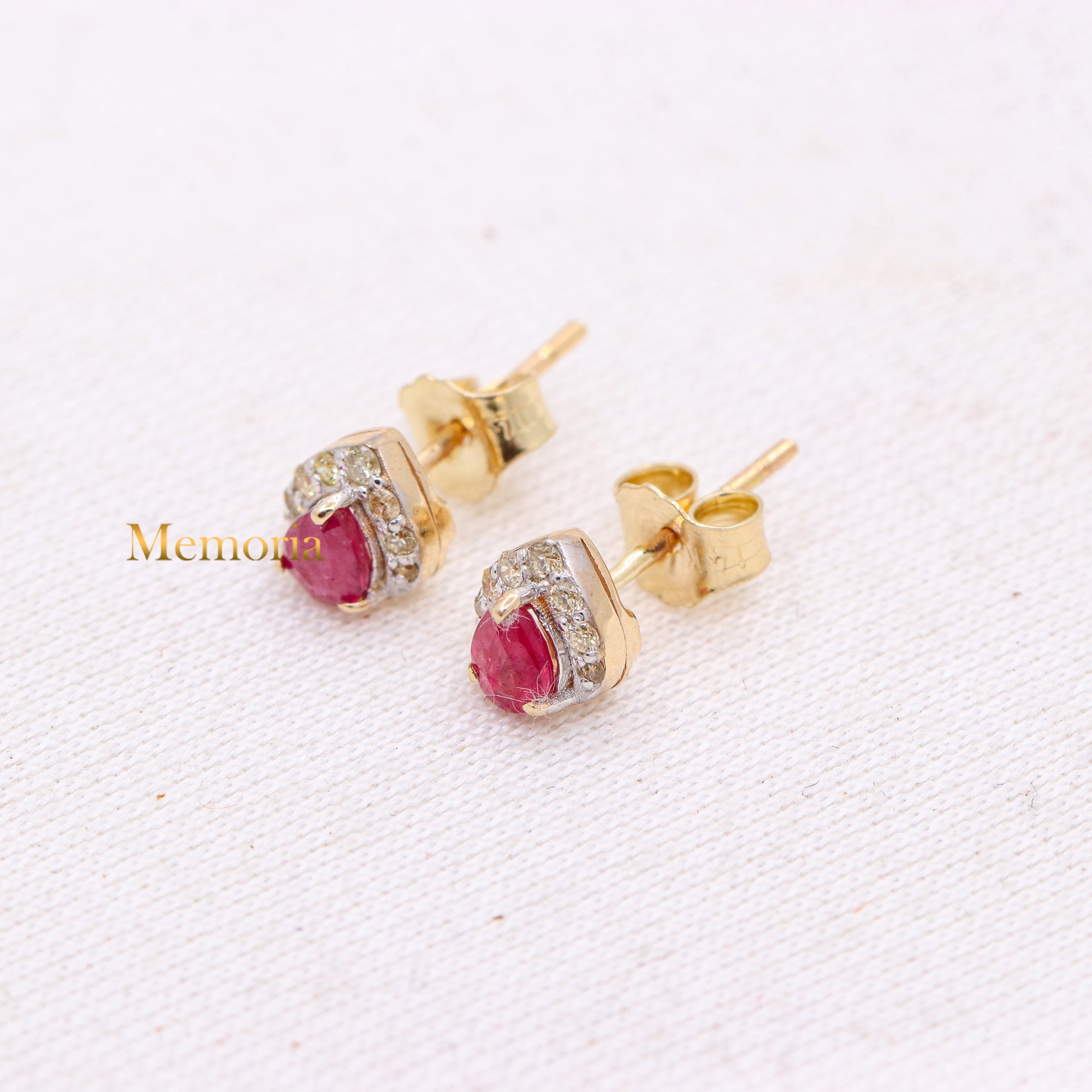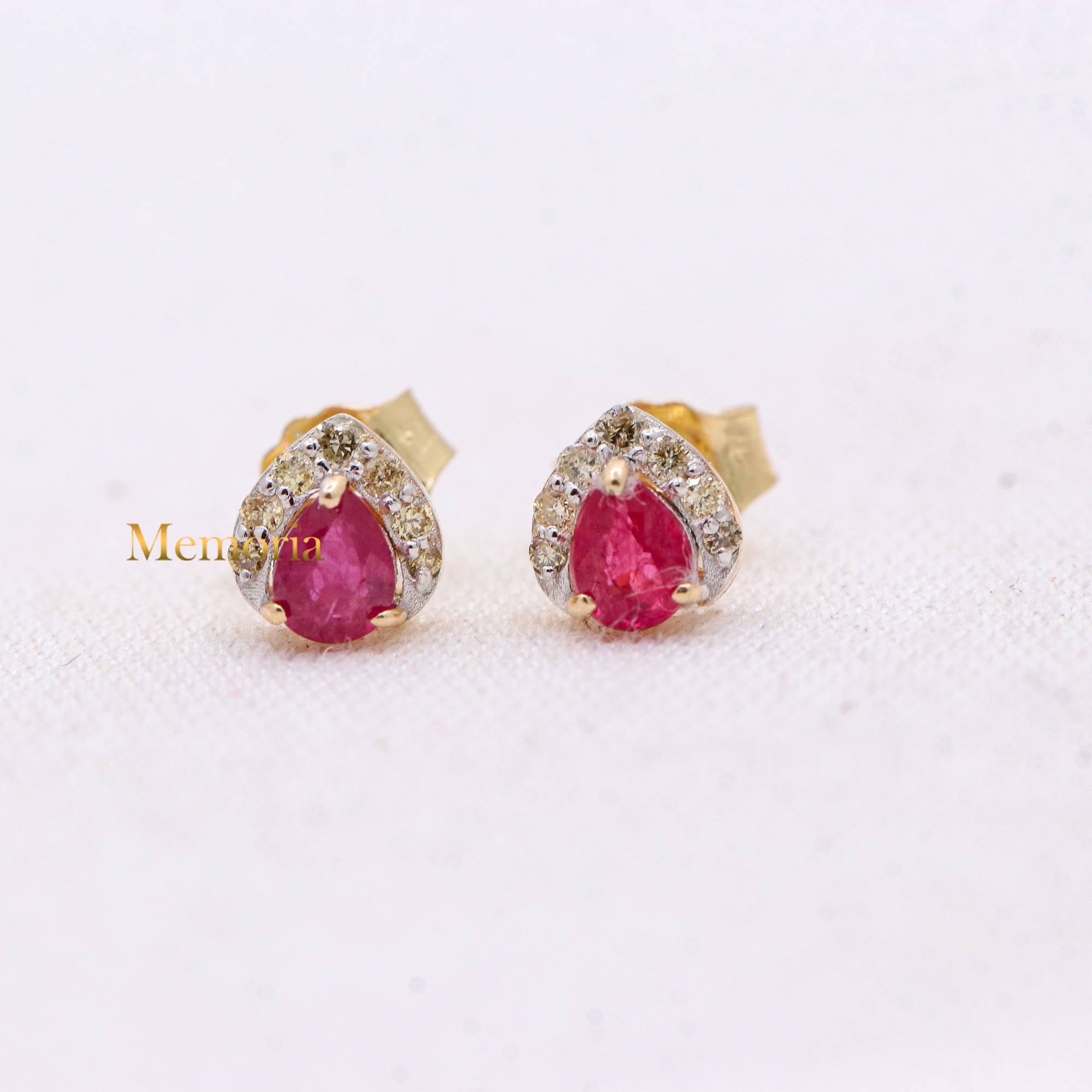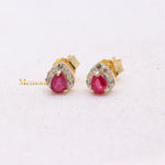 Buy Best Quality Certified Designer Natural Ruby Pear Shaped Faceted Cut Spiritual Chakra Healing Gemstone With Diamond Stud Earring In 14k Yellow Gold