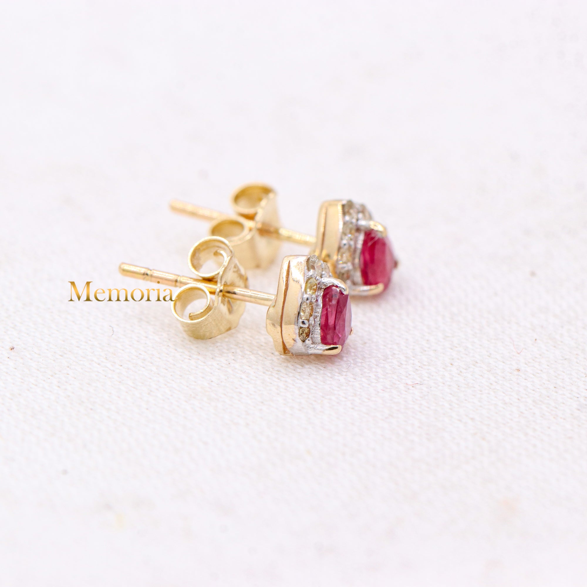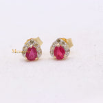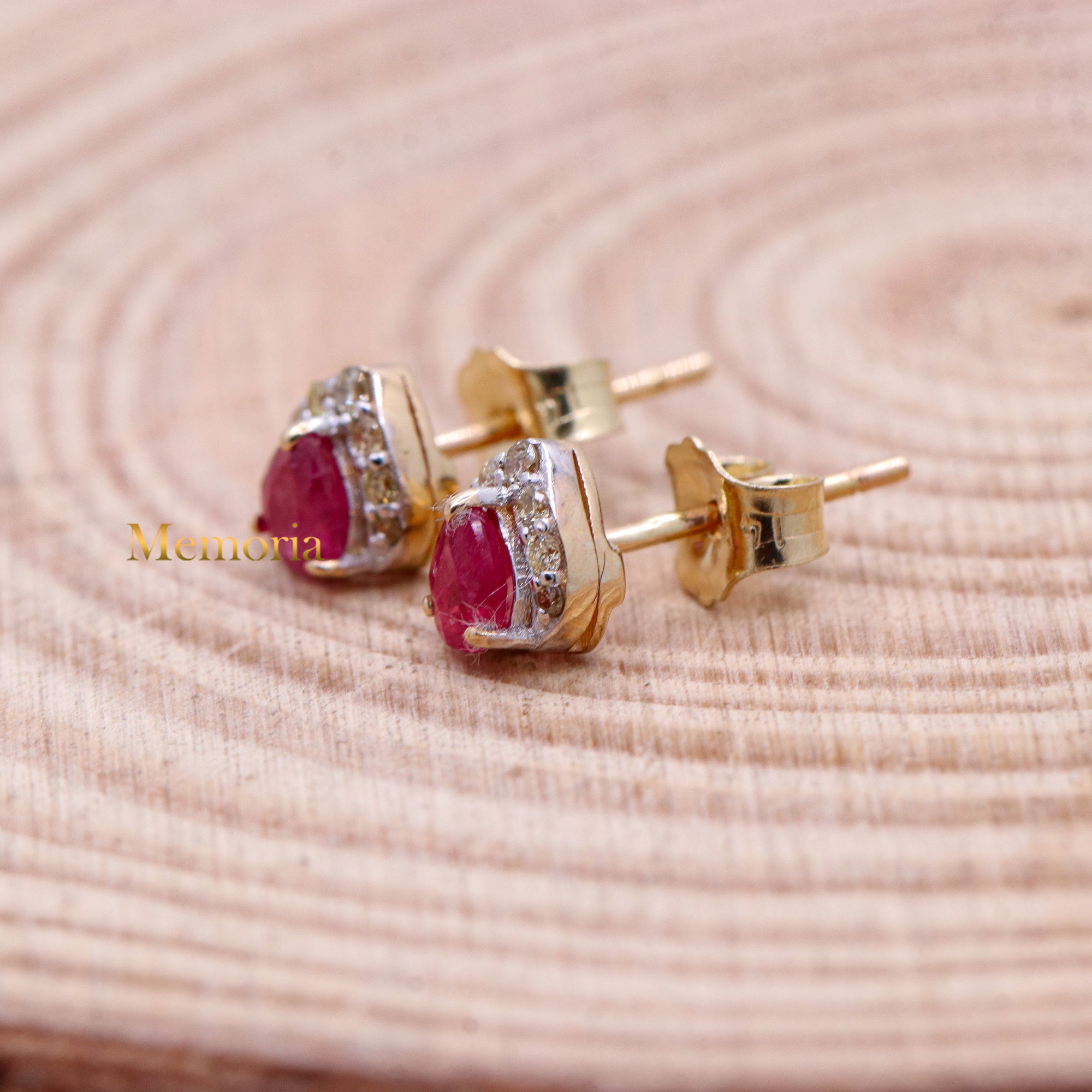 Trendy Natural Ruby Gemstone With Diamond 14k Yellow Gold Stud Earring