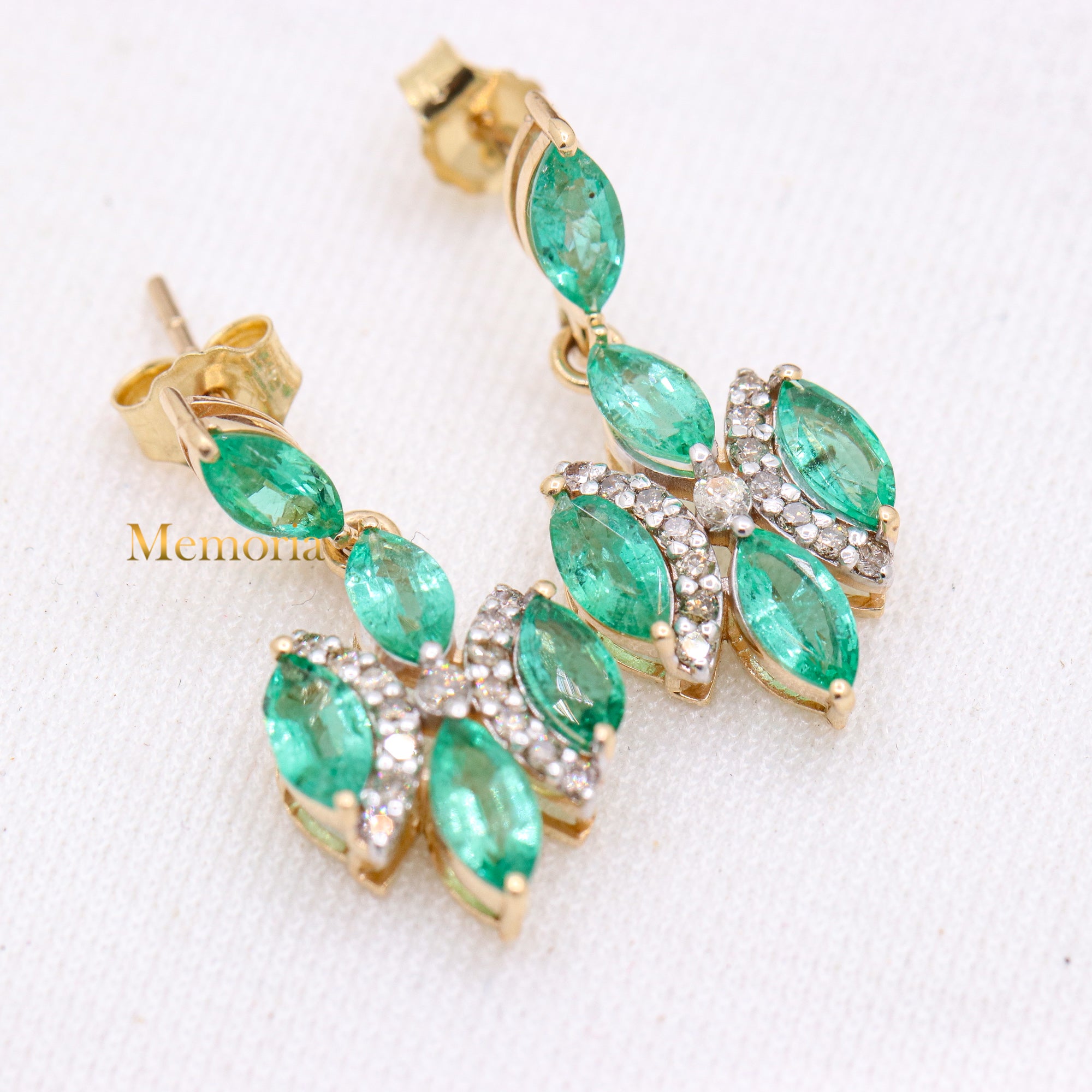 Buy Best Quality Certified Designer Natural Emerald Marquise Shaped Faceted Cut Spiritual Chakra Healing Gemstone With Diamond Stud Earring In 14k Yellow Gold
