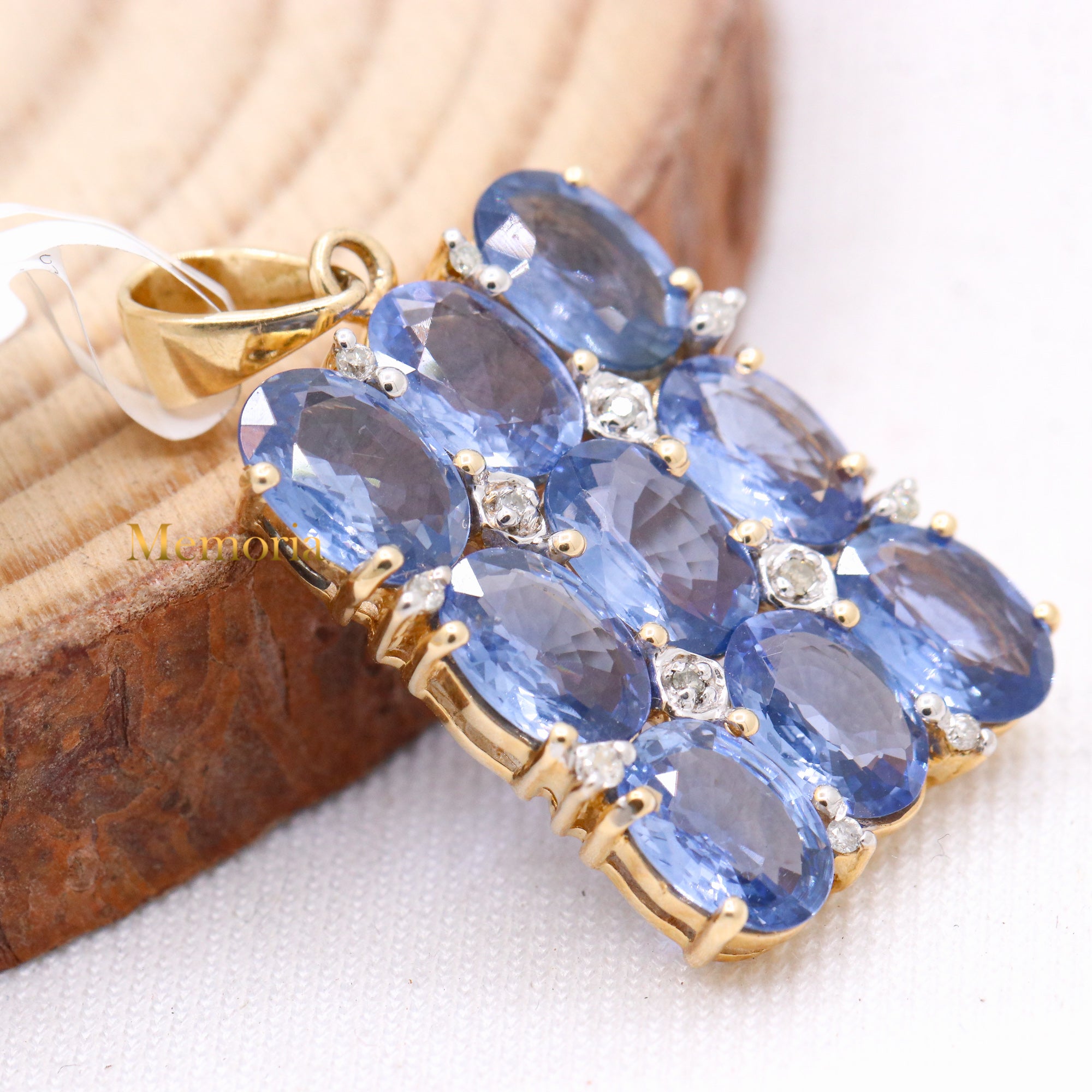 Natural Blue Sapphire Gemstone With Diamond Pendant 14k Yellow Gold