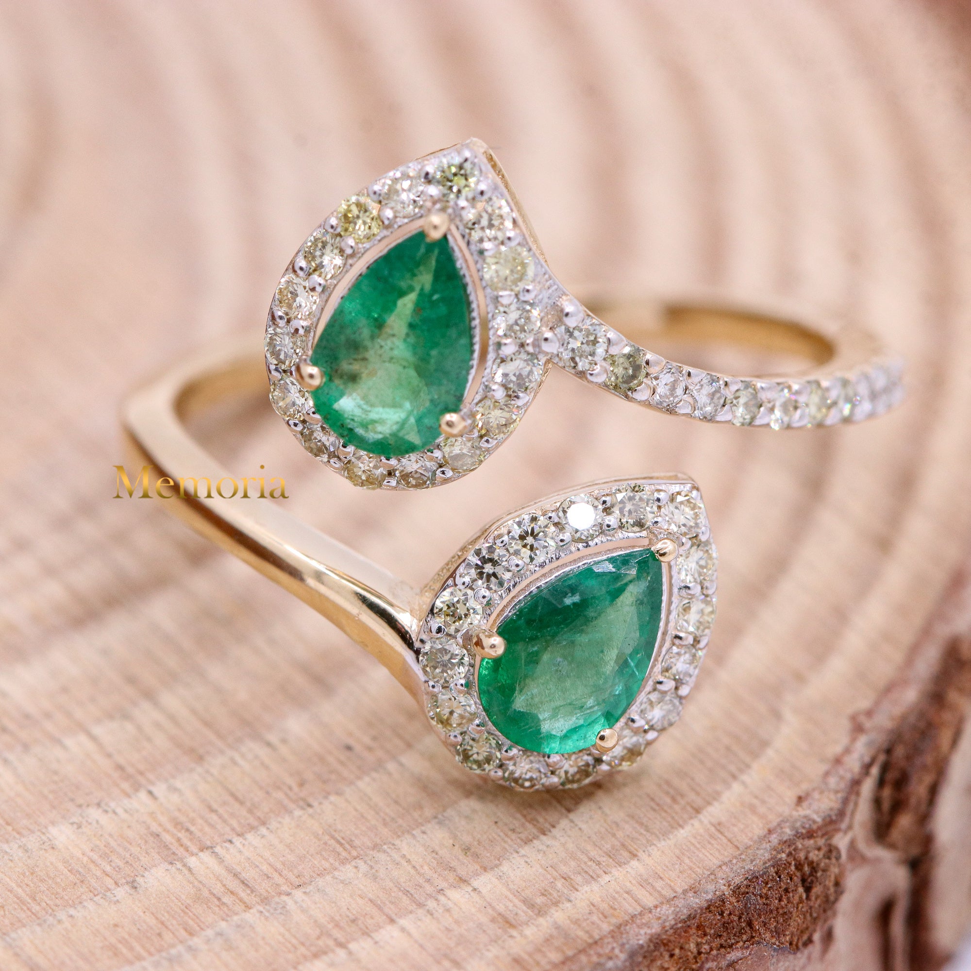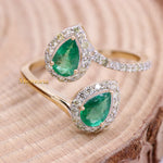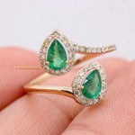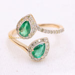 14k Yellow Gold Two Stone Natural Pear Cut Emerald Gemstone With Diamond By Pass Ring