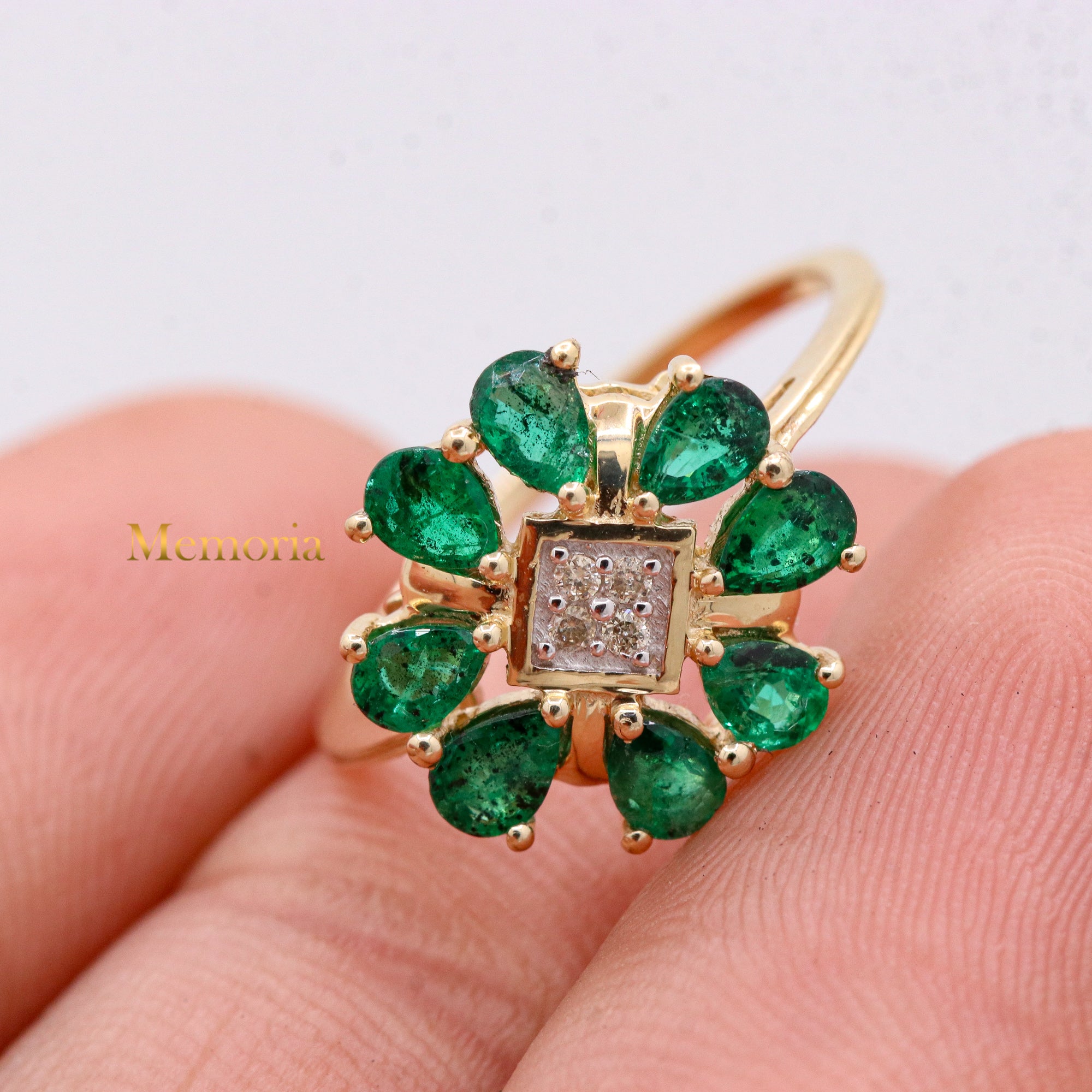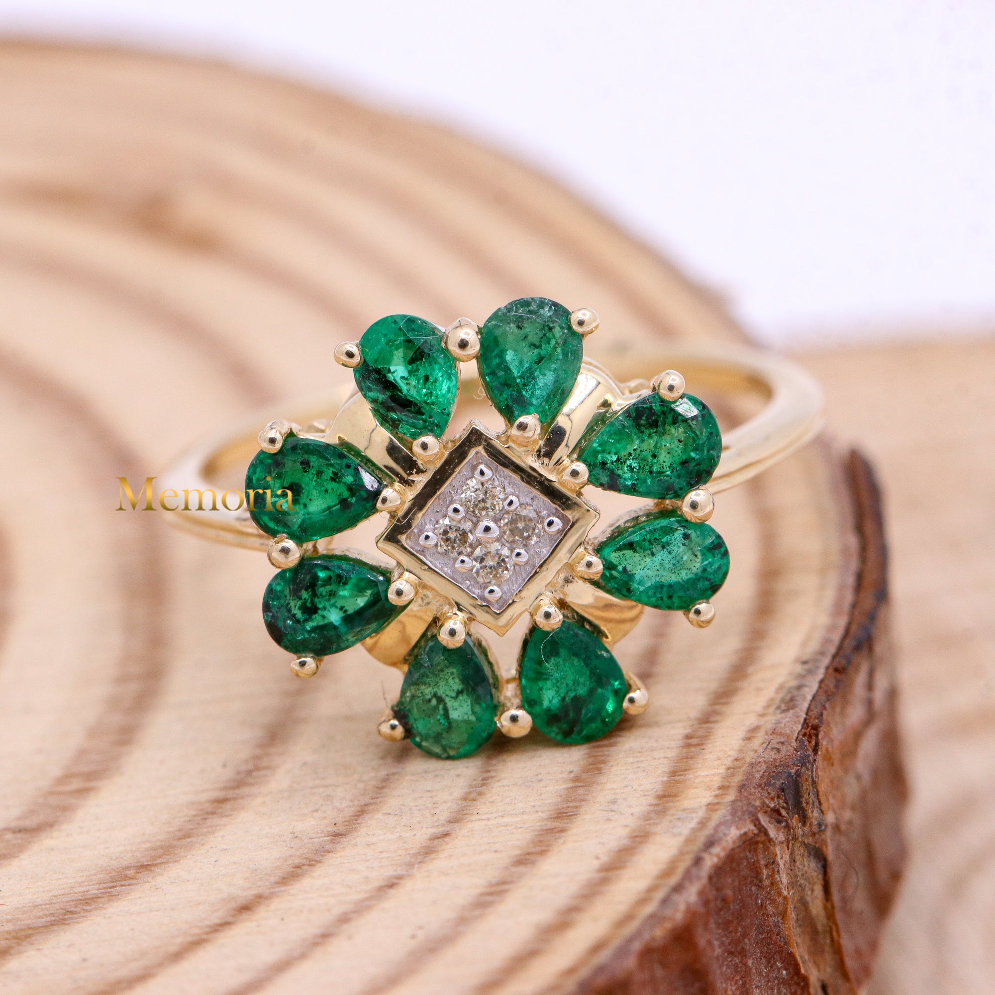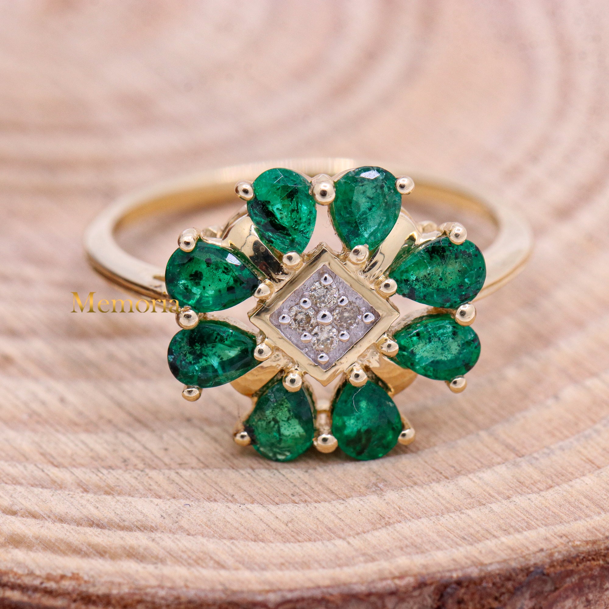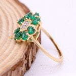 Designer Natural Emerald Gemstone & Diamond Ring In 14k Yellow Gold