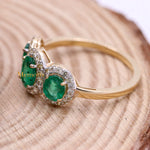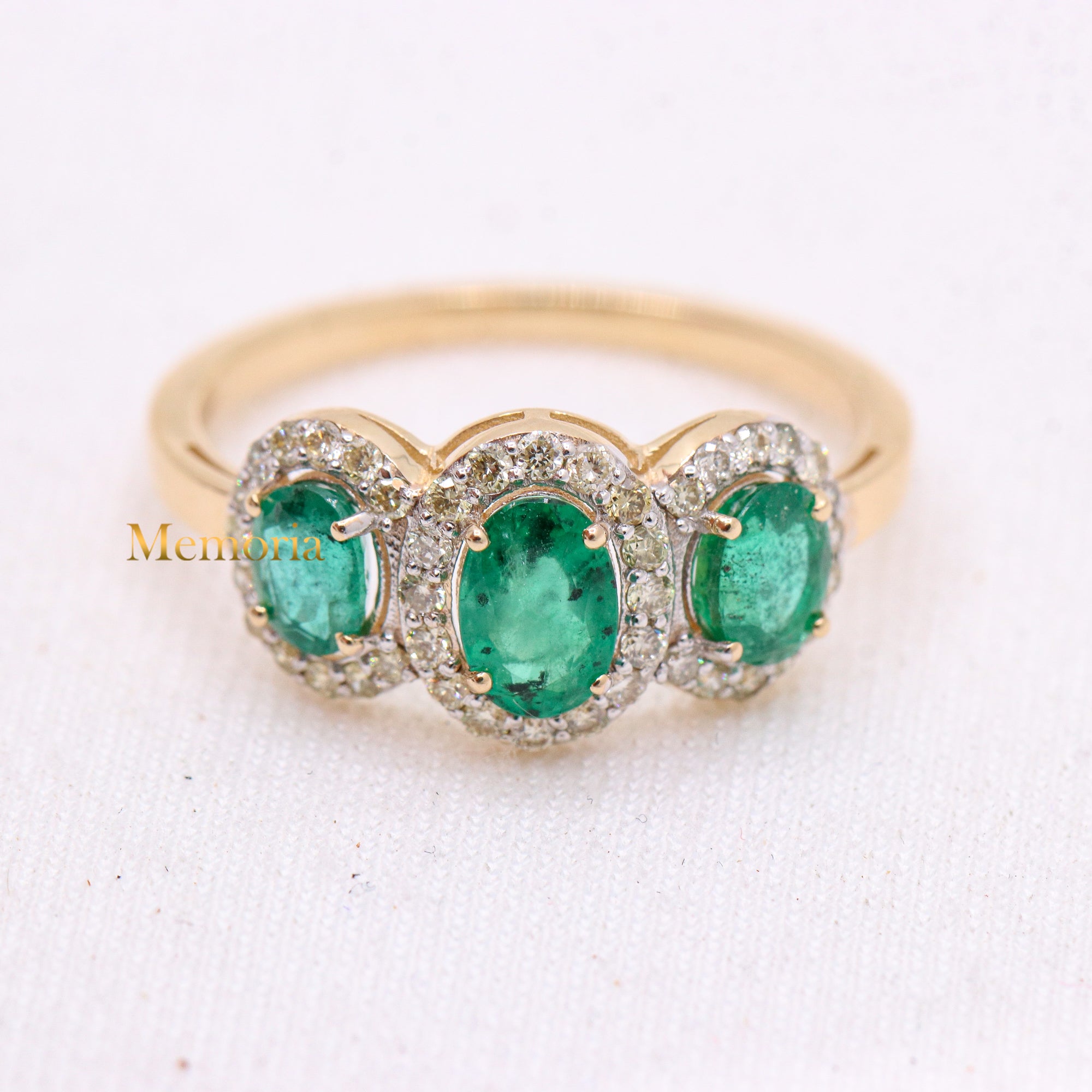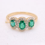 Natural Emerald Oval Cut Gemstone & Diamond Womens Three Stone Ring In 14k Yellow Gold