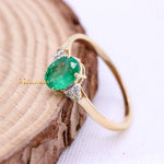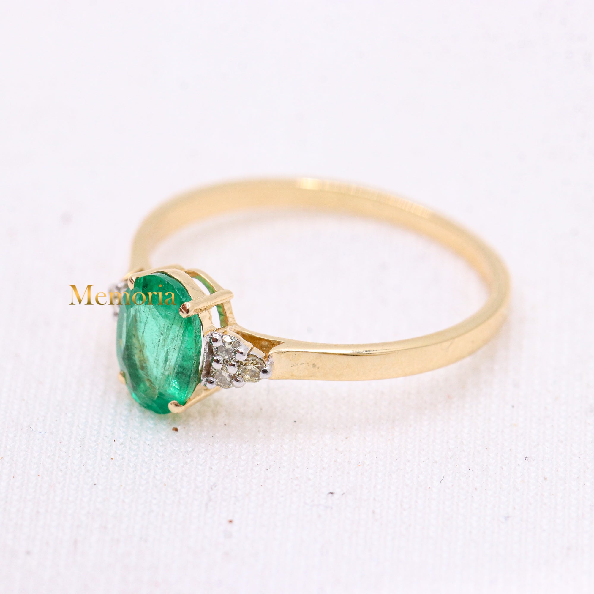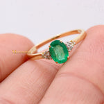 Trendy Natural Oval Cut Emerald Gemstone & Diamond Ring In 14k Yellow Gold