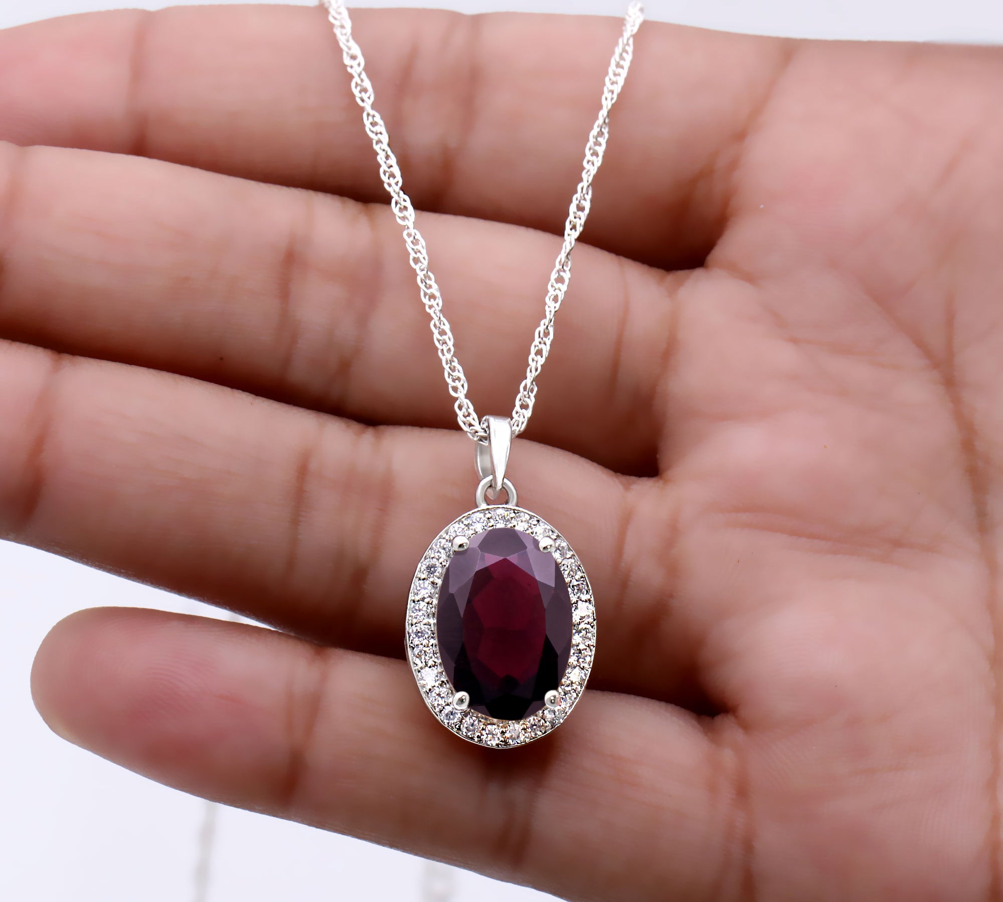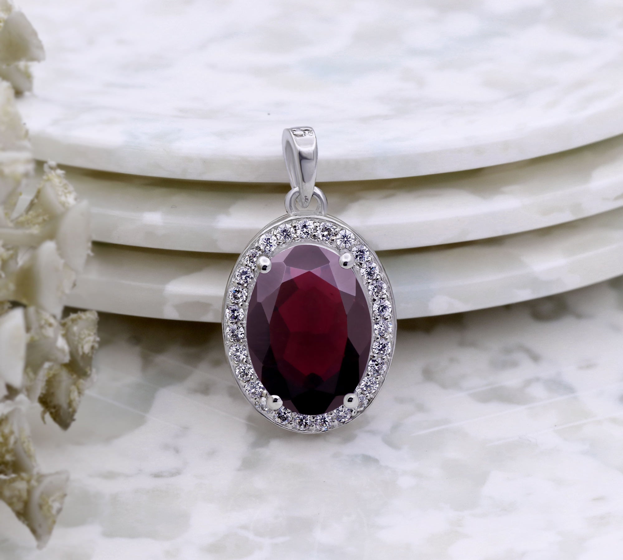 Natural Red Garnet CZ Halo Pendant 925 Sterling Silver Pendant Handmade Jewelry.