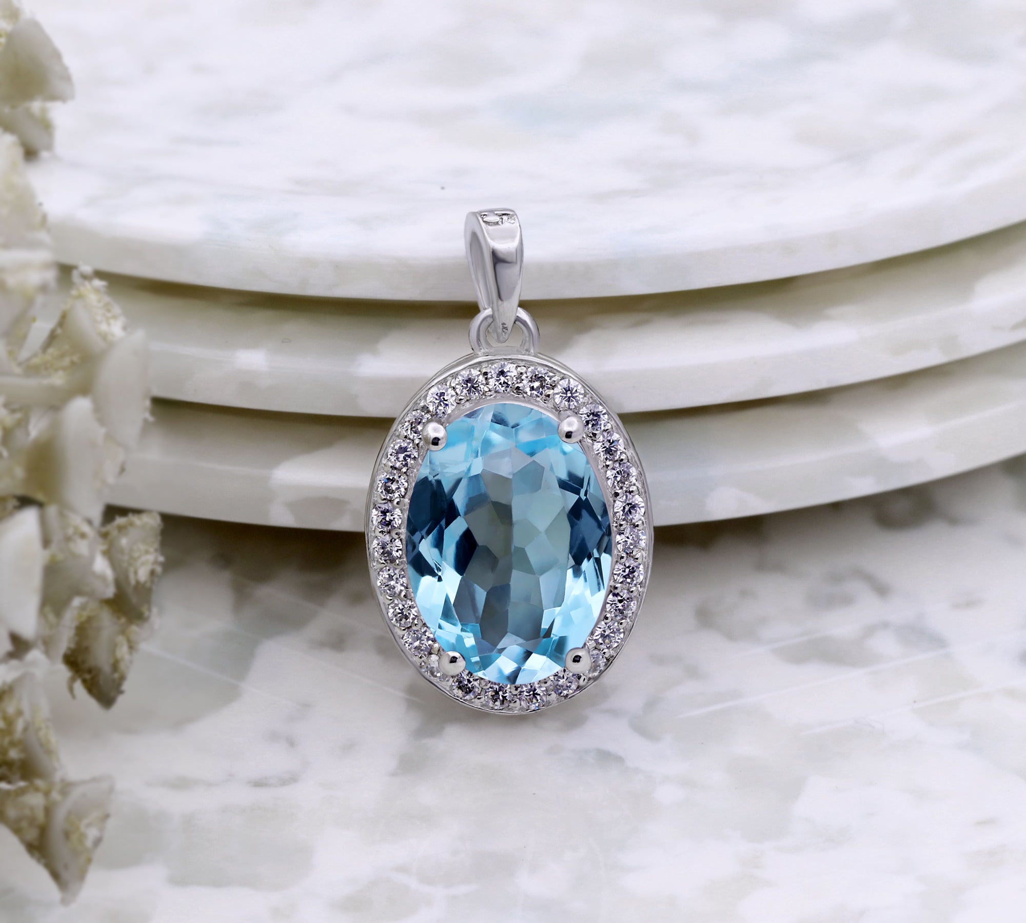 Natural Blue Topaz and CZ Halo Pendant 925 Sterling Silver Pendant Handmade Jewelry.