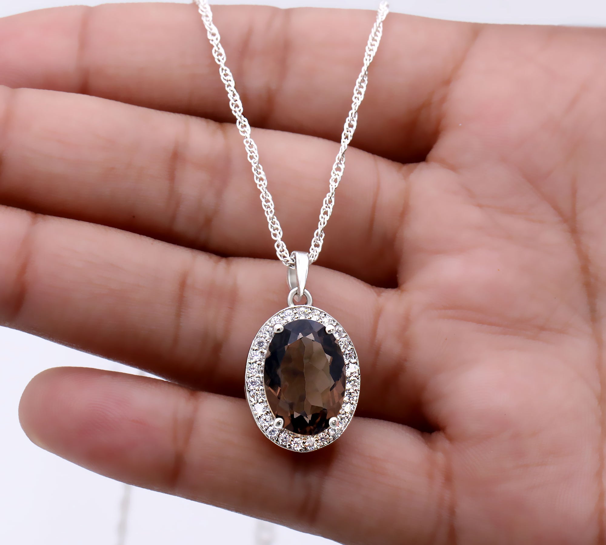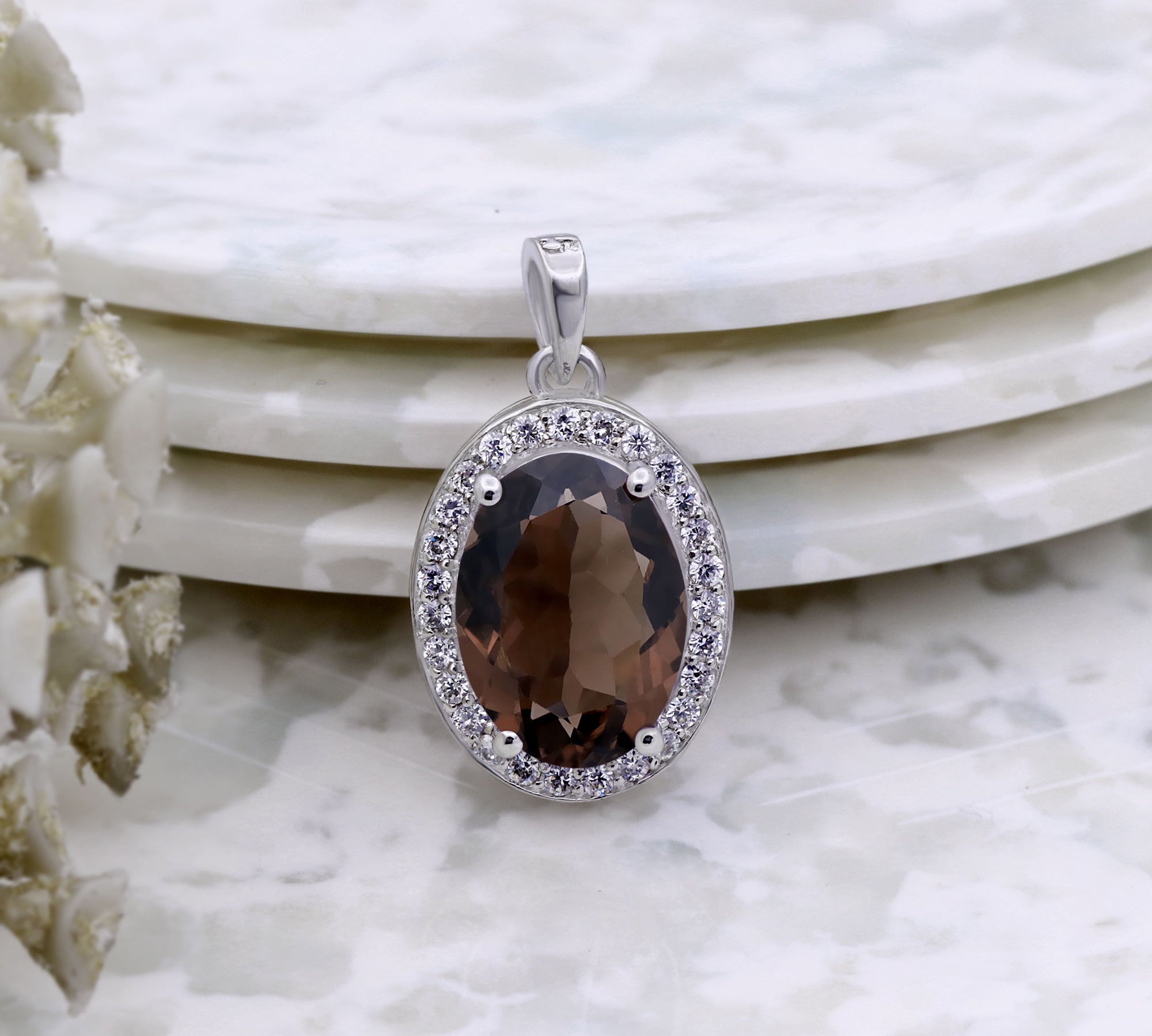 Natural Smoky Quartz and CZ Halo Pendant 925 Sterling Silver Pendant Handmade Jewelry.