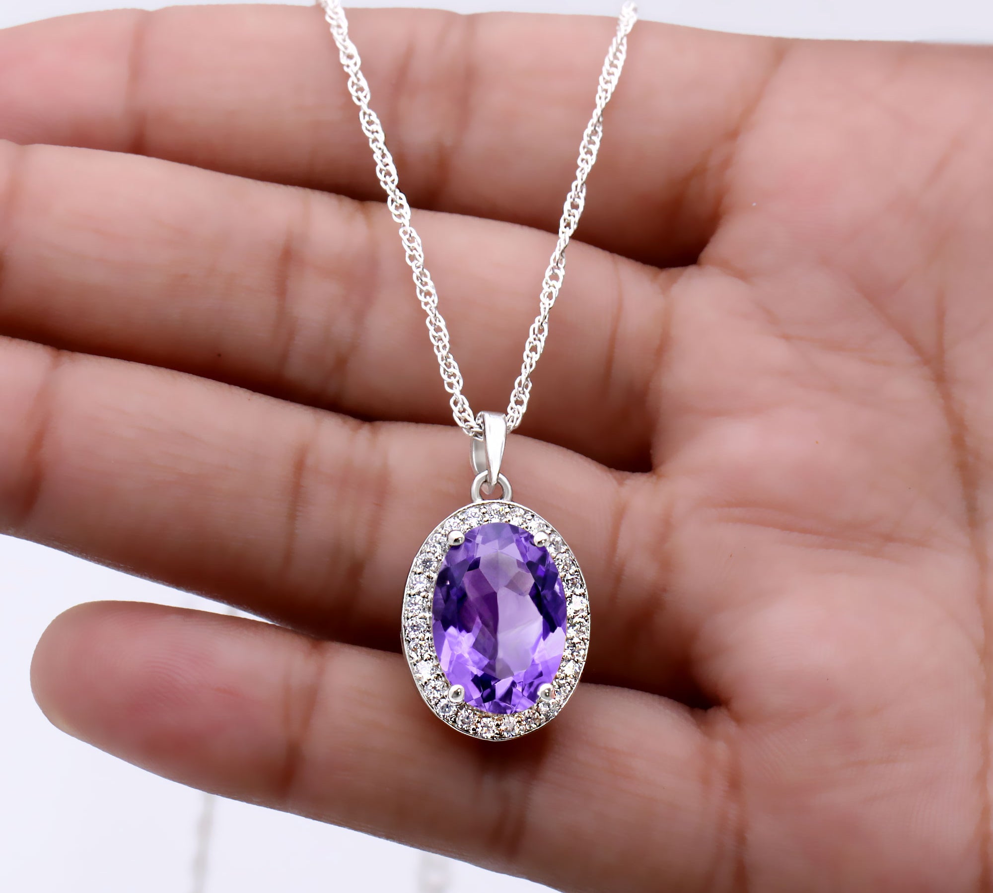 Natural Amethyst and CZ Halo Pendant 925 Sterling Silver Pendant Handmade Jewelry.