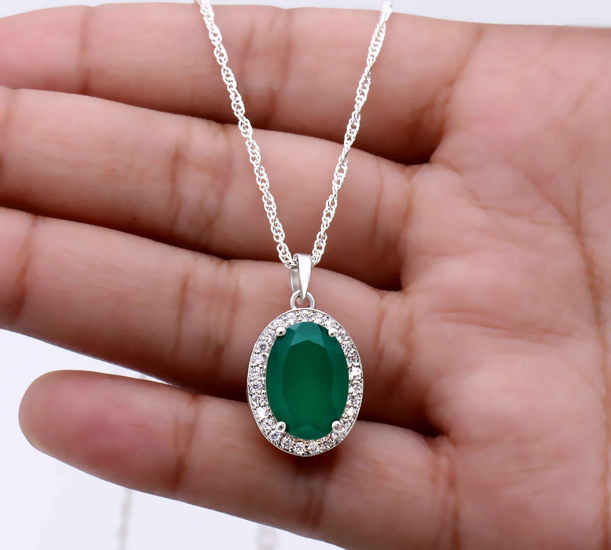 Natural Green Onyx CZ Halo Pendant 925 Sterling Silver Pendant Handmade Jewelry.