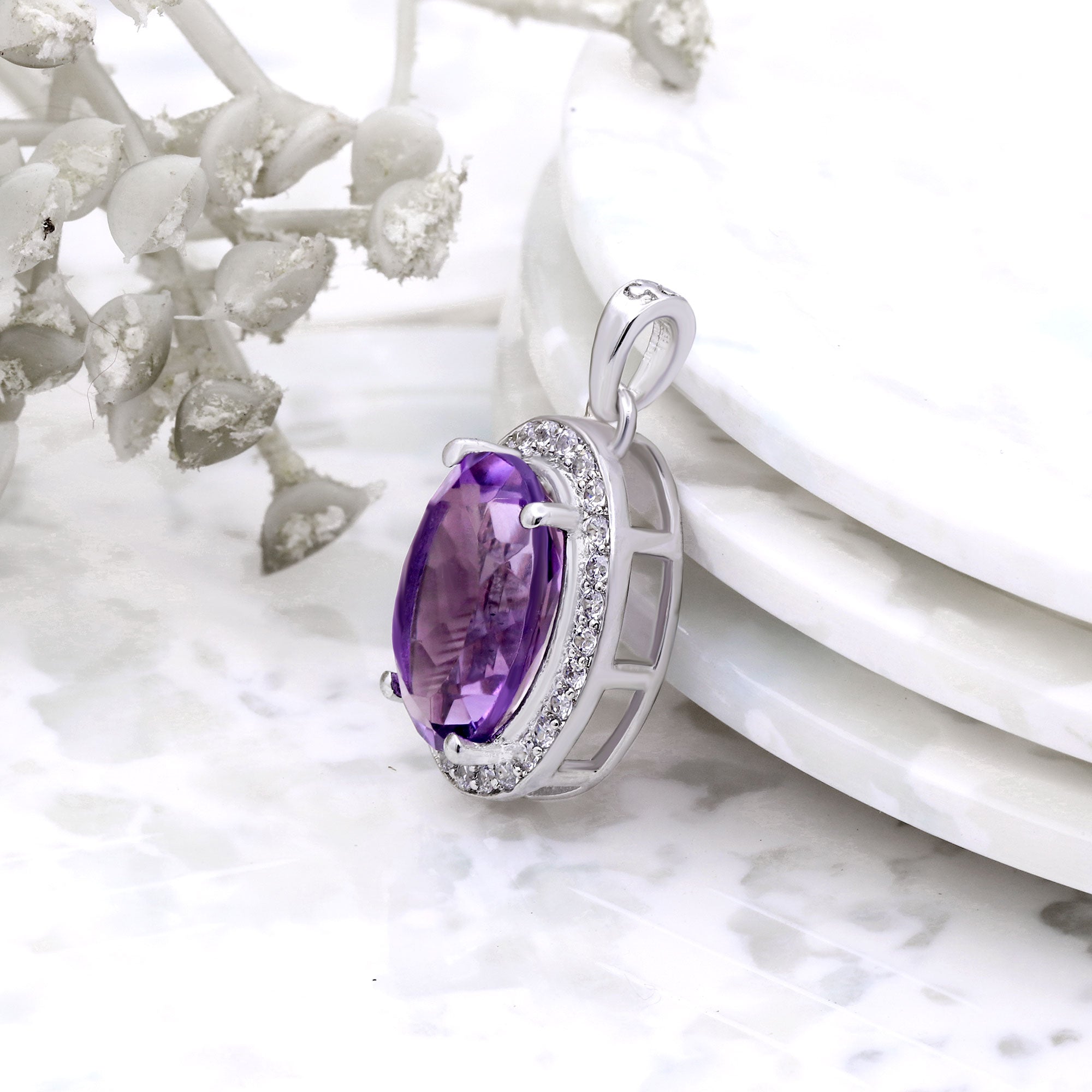 This natural oval shape Amethyst pendant beautifully set in genuine 925 sterling silver for a timeless and elegant look. The CZ set in the border of the stone and give a luxury look to this pendant. Known as the February birthstone, amethyst symbolizes wisdom, spiritual growth, and tranquility.