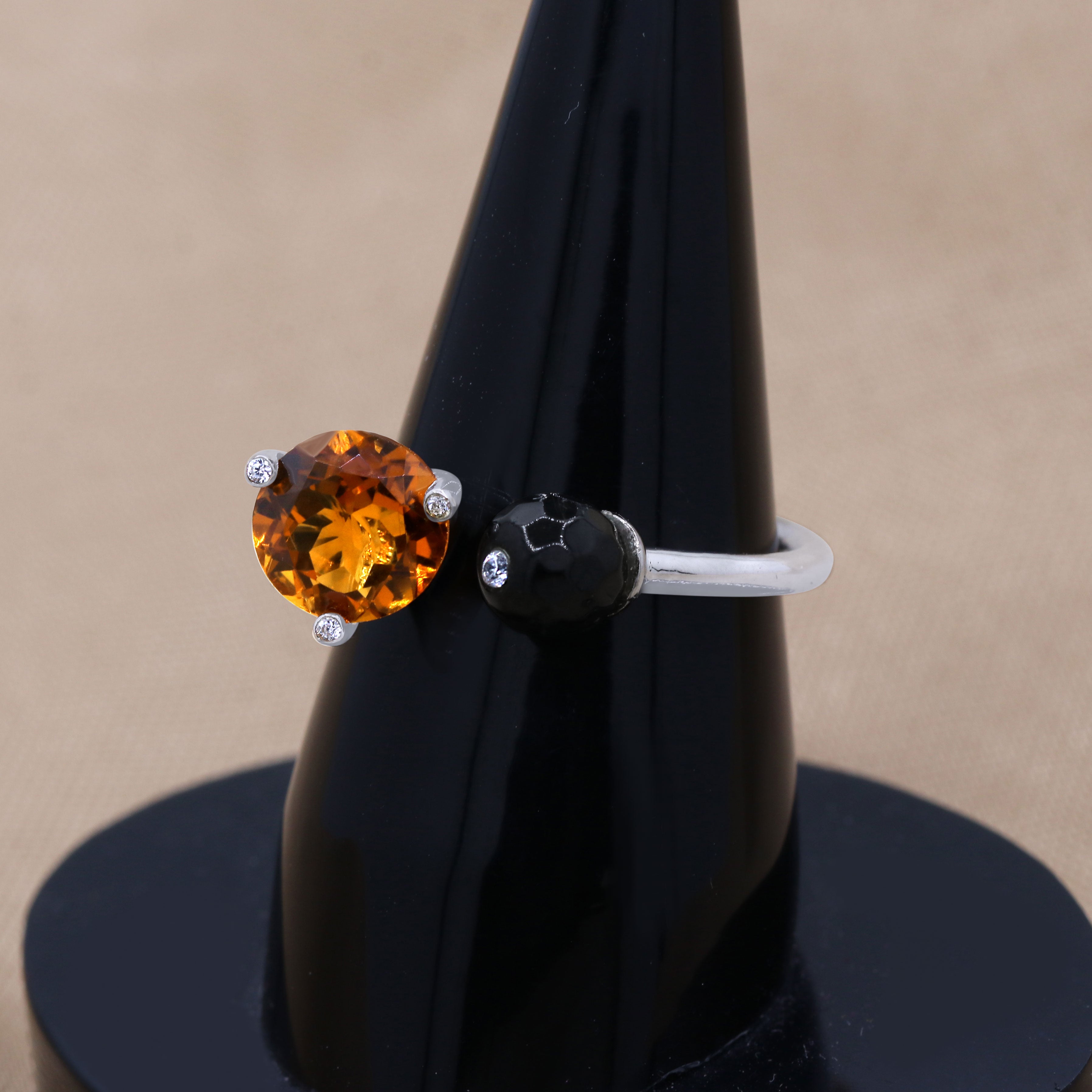 This elegant silver ring pairs a vibrant faceted Citrine with a polished Black Onyx, creating a striking contrast of color and texture. Designed with a modern open-band style, the ring offers an adjustable fit for comfortable everyday wear. The warm golden sparkle of Citrine blended with the deep, bold look of Onyx makes this piece a perfect statement accessory or a thoughtful gift for someone who loves unique gemstone jewelry.