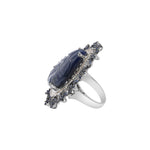 Natural Blue Sapphire Carved Gemstone & Diamond 925 Sterling Silver Ring