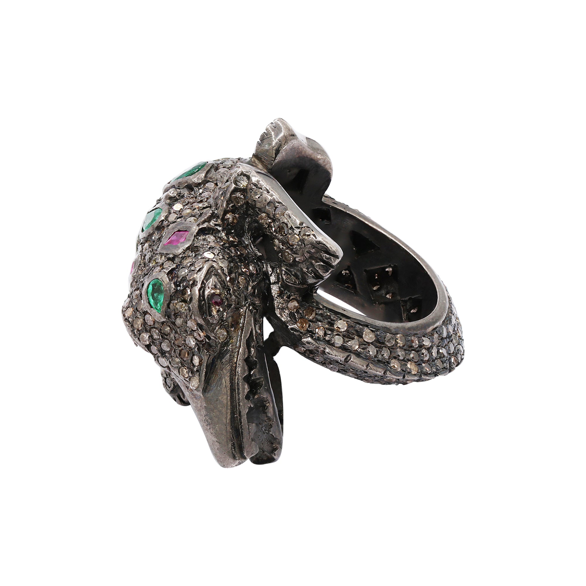 Crocodile Emerald Ruby and Diamond 925 Sterling Silver Black Rhodium Plated Ring