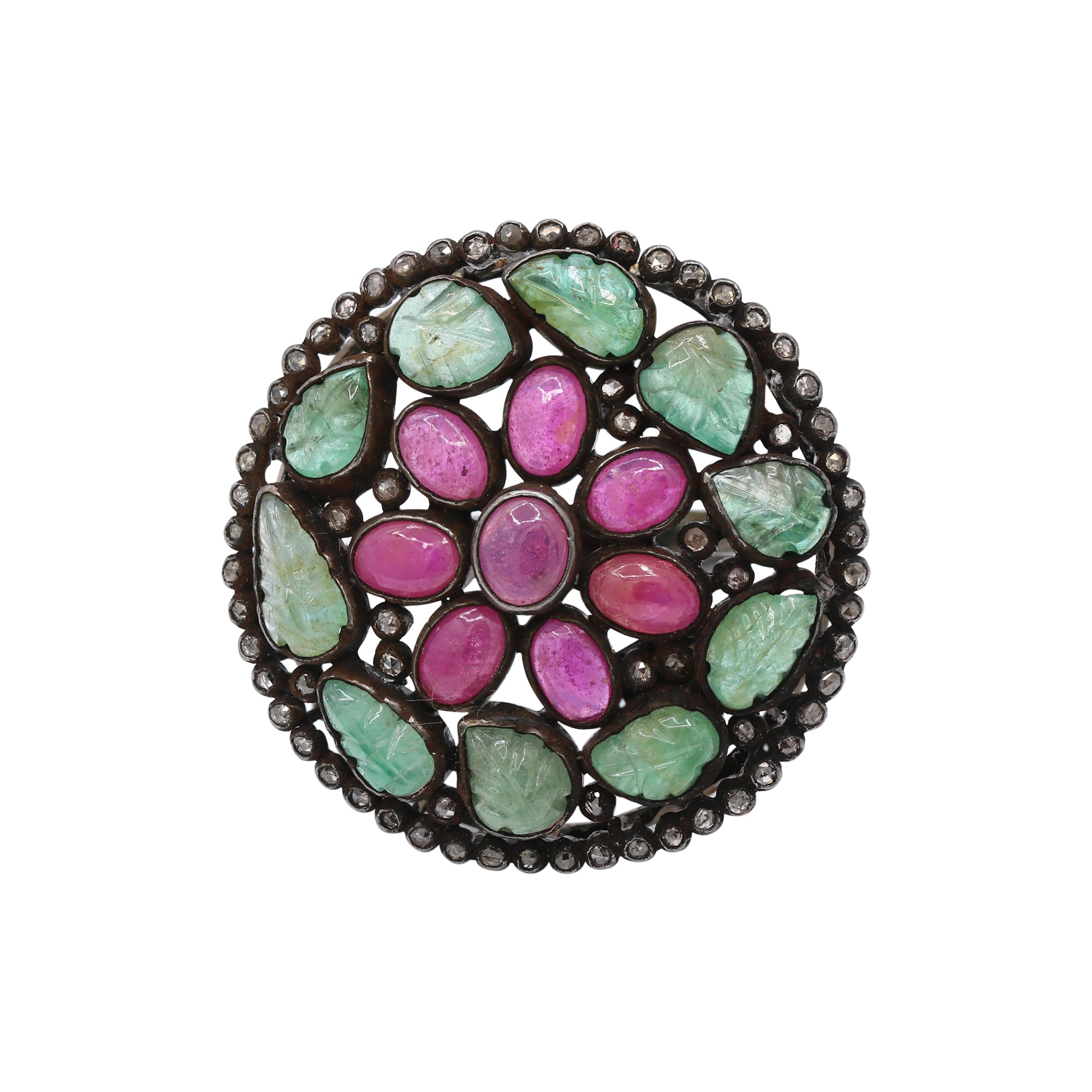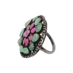 Floral Natural Emerald, Diamond and Ruby Gemstone 925 Silver Black Rhodium Plated Ring