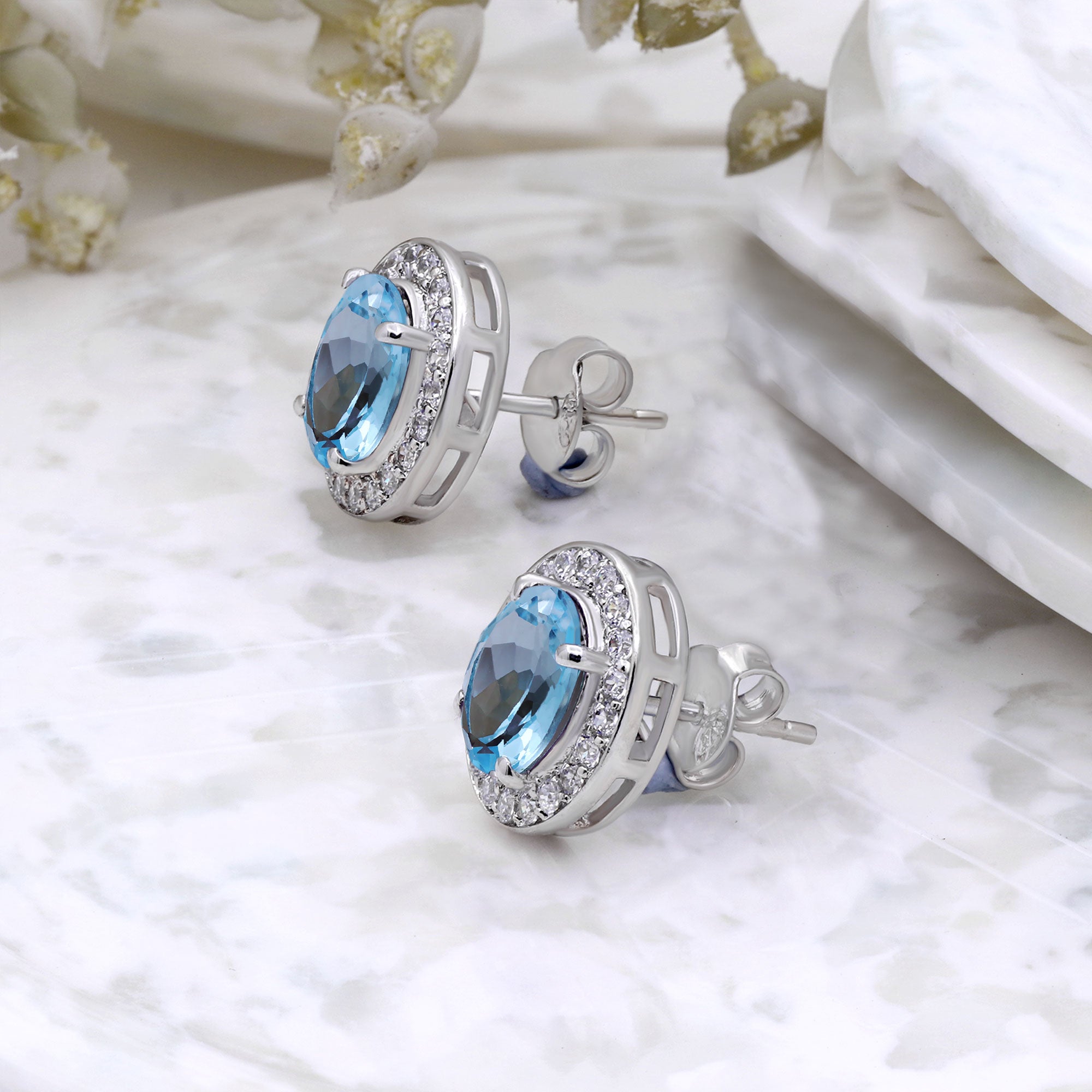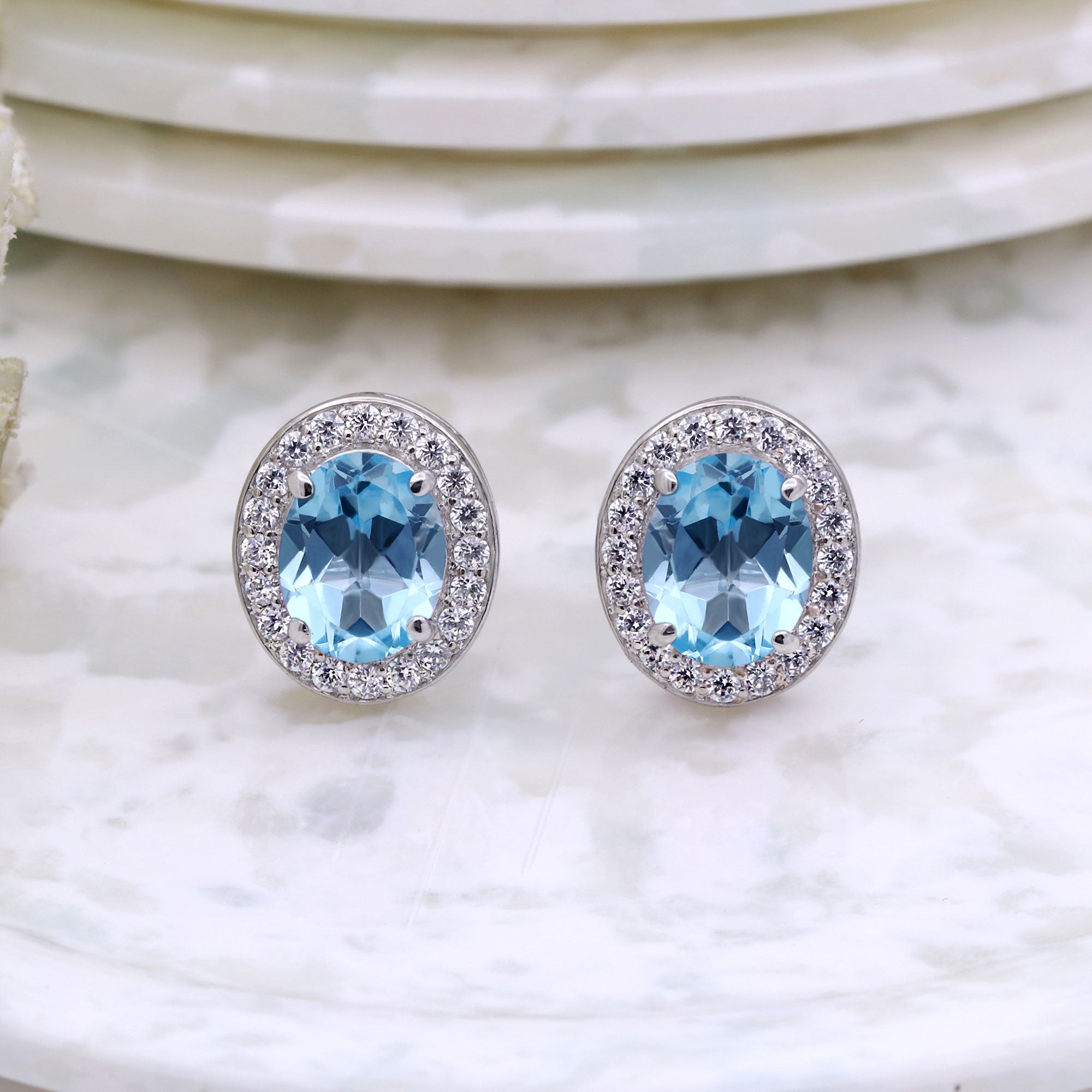 Add a touch of timeless elegance to your jewelry collection with these stunning Natural Blue Topaz and CZ Silver Stud Earrings. Featuring oval blue topaz gemstones, these earrings are surrounded by a sparkling halo of brilliant cubic zirconia stones, creating a luxurious and eye-catching design.