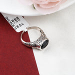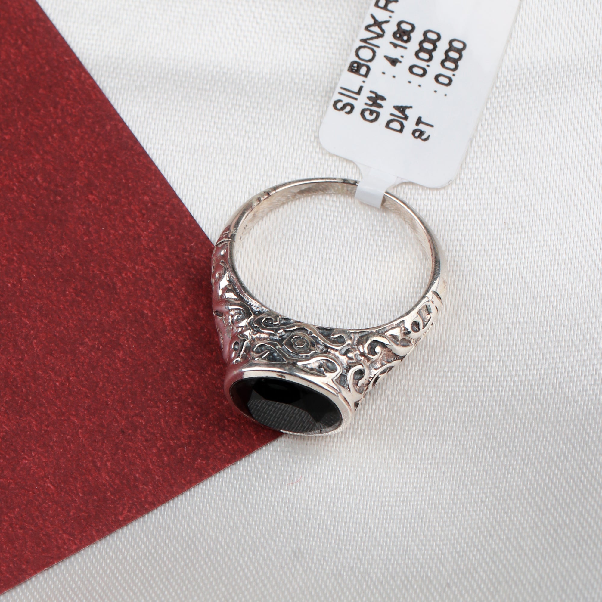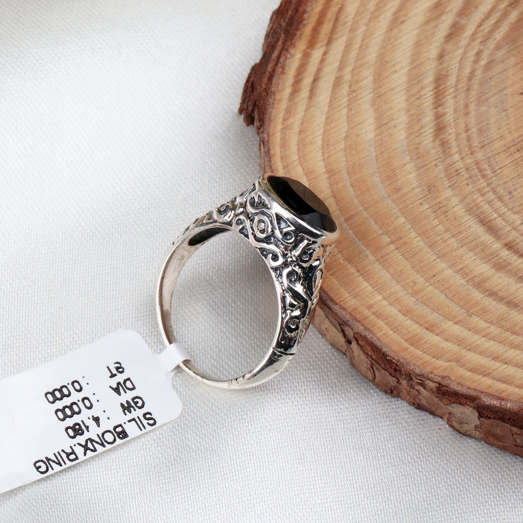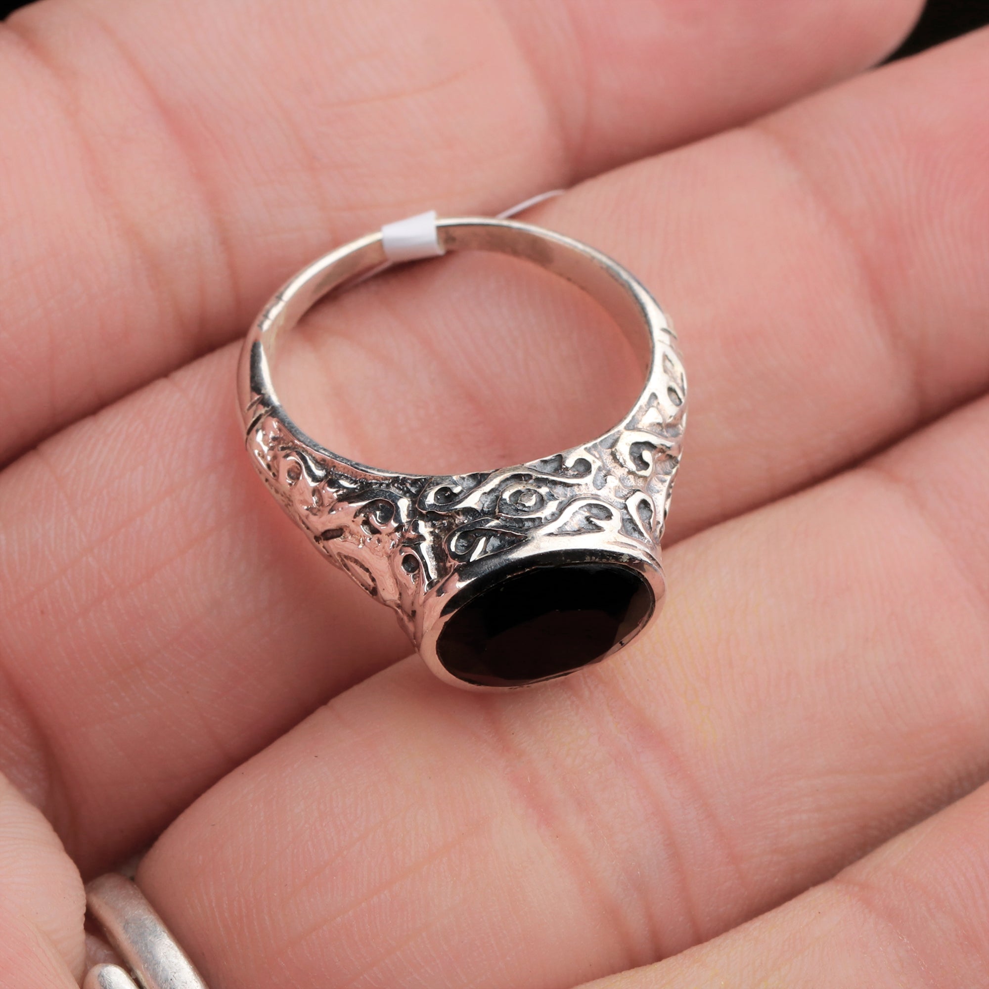 Add bold elegance to your look with this Black Onyx Sterling Silver Ring, featuring a faceted oval gemstone set on an intricately engraved vintage-style band. A timeless piece crafted for those who love classic gemstone jewelry with a touch of antique charm.