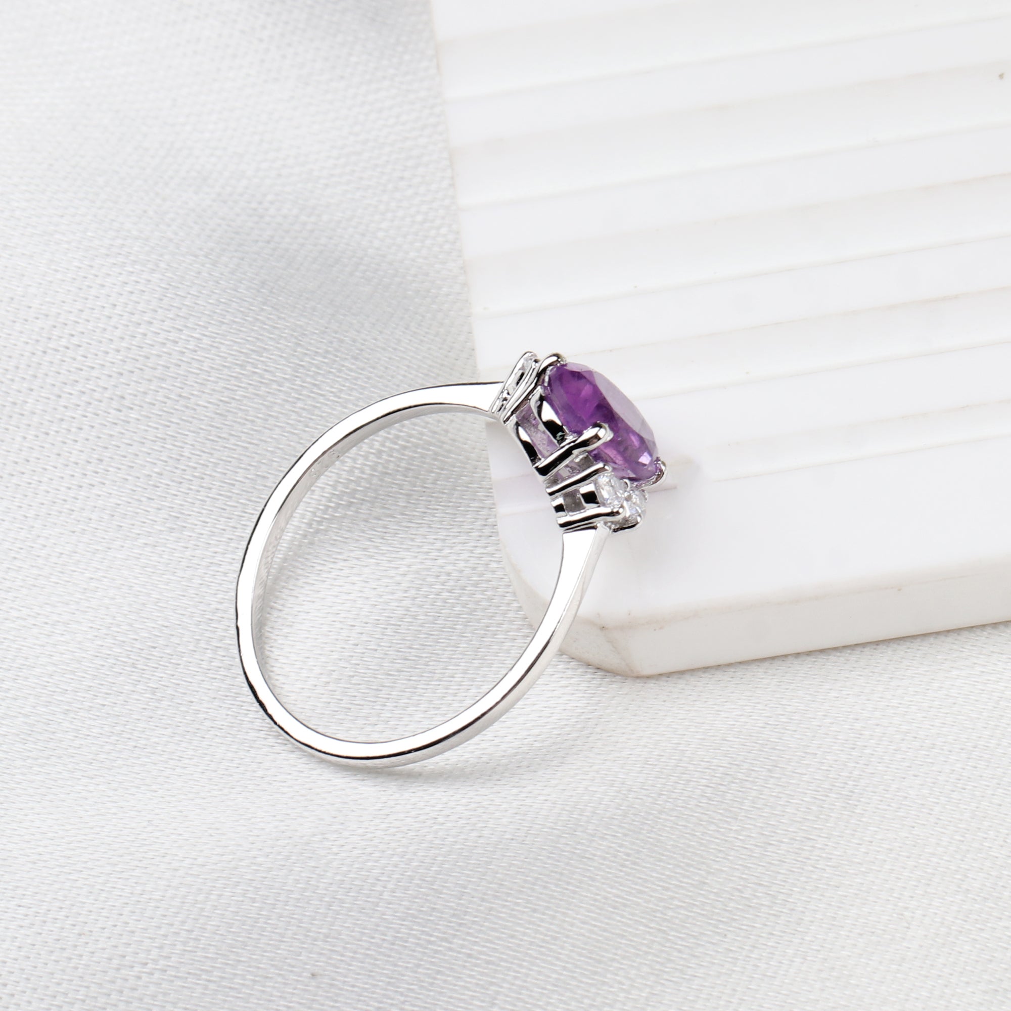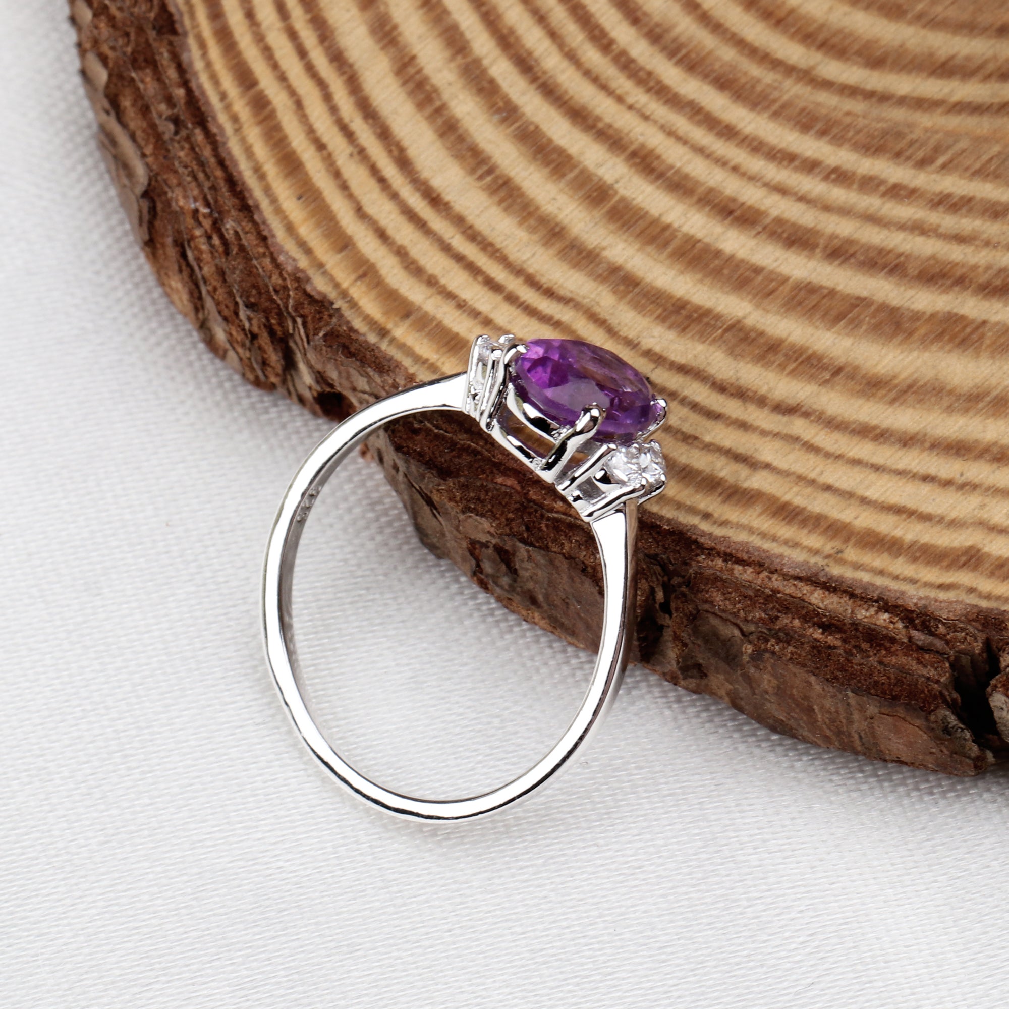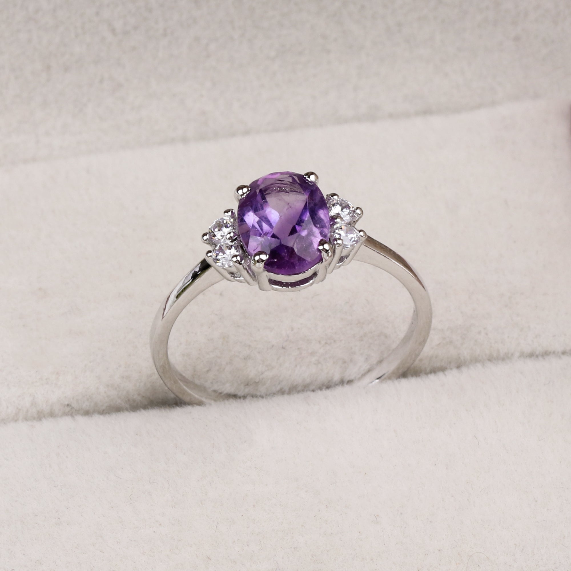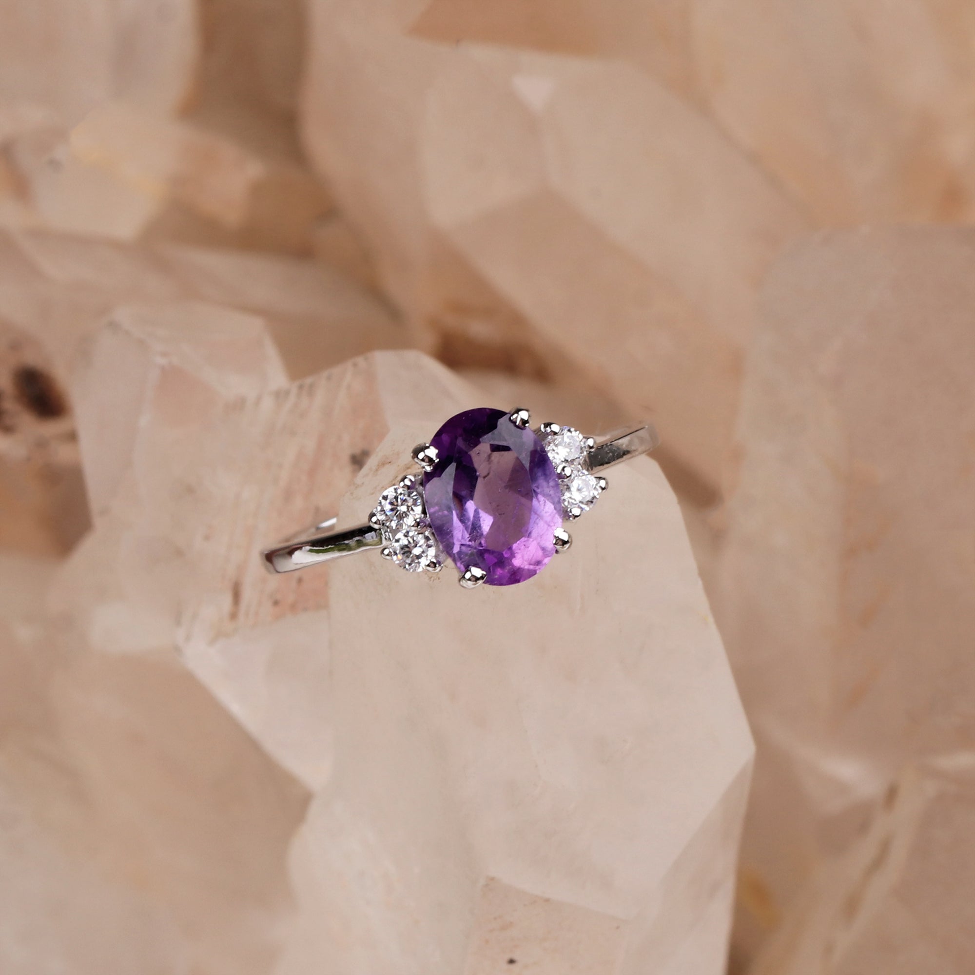 A stunning Natural Amethyst ring featuring an oval-cut purple gemstone accented with sparkling CZ side stones in a classic three-stone design. Handcrafted in 925 sterling silver, this elegant ring is perfect for everyday wear or special occasions.