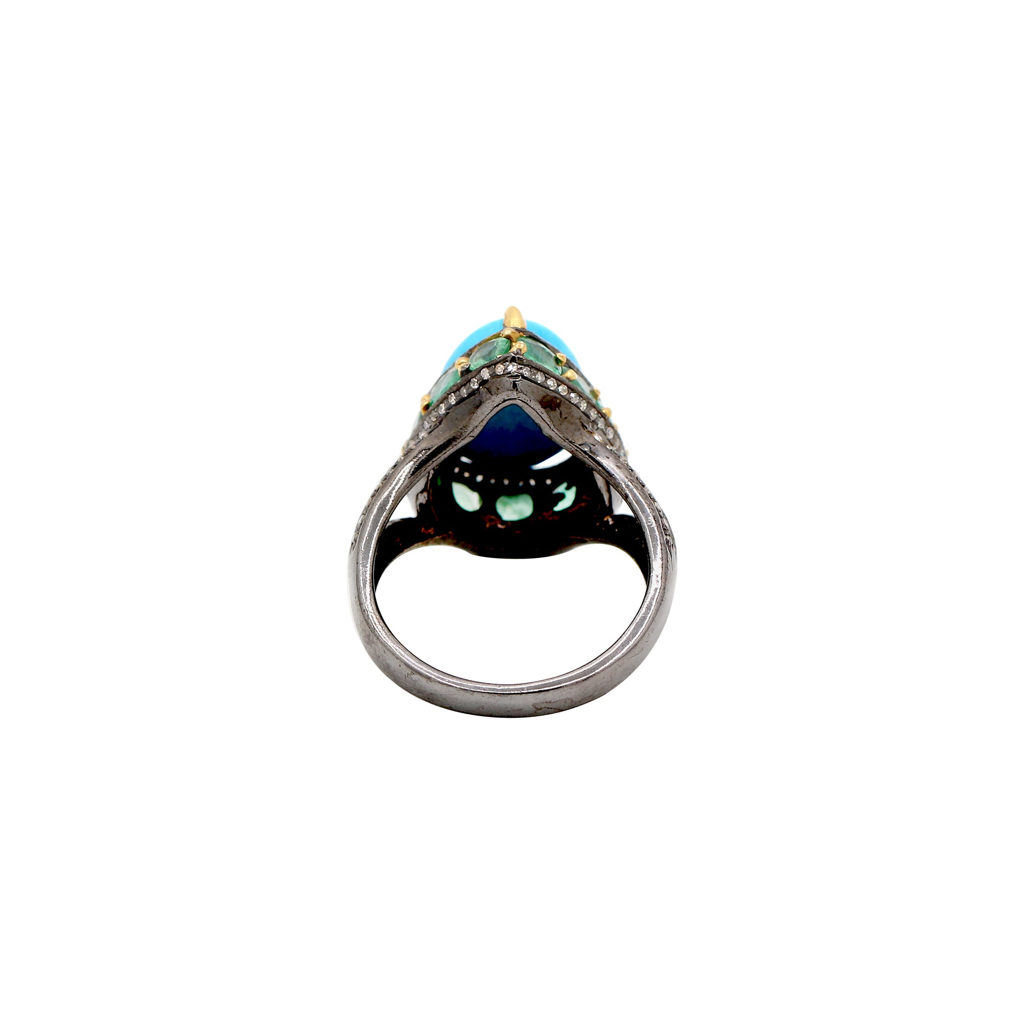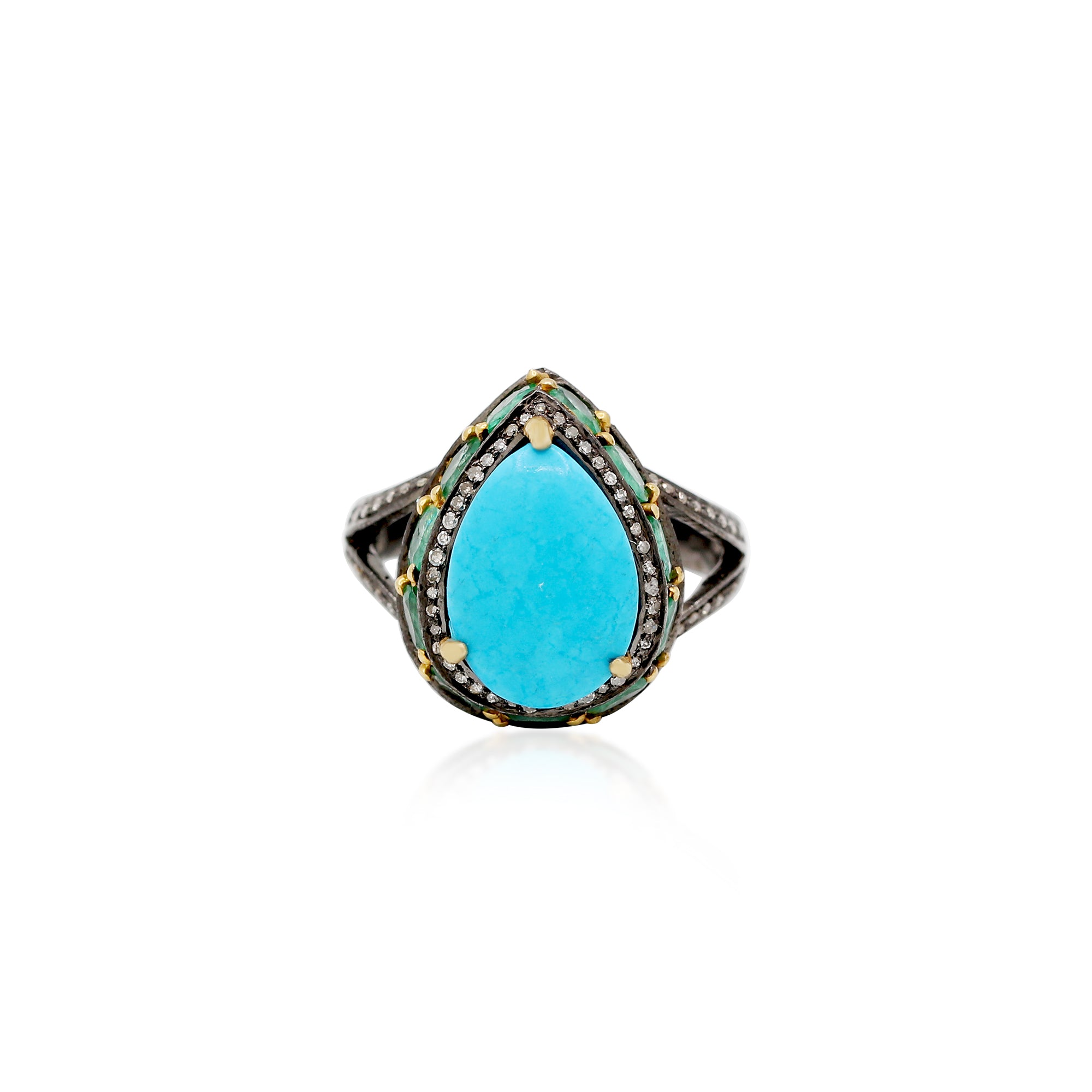 Pear Shaped Turquoise, Emerald Gemstone And Diamond 925 Silver Ring