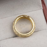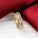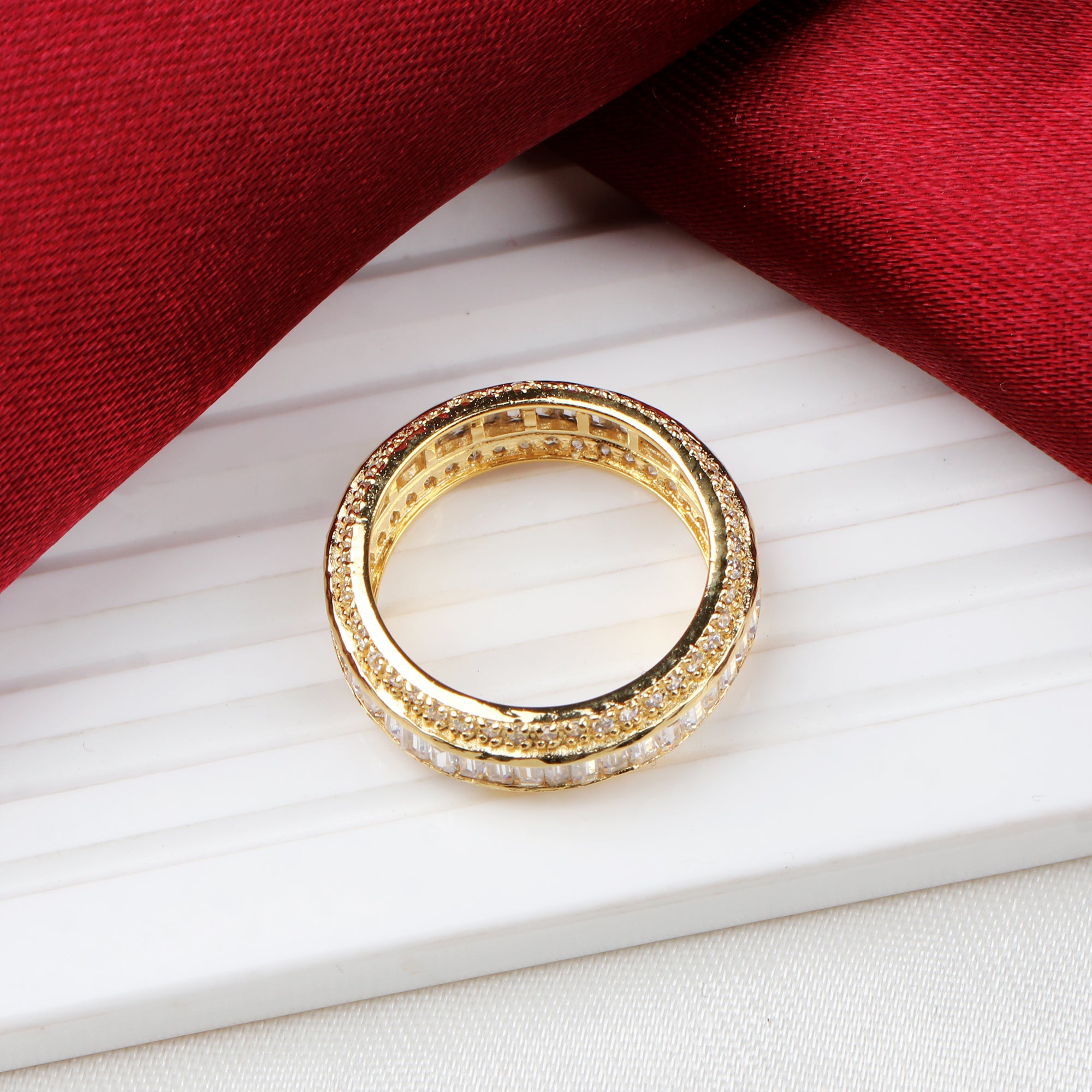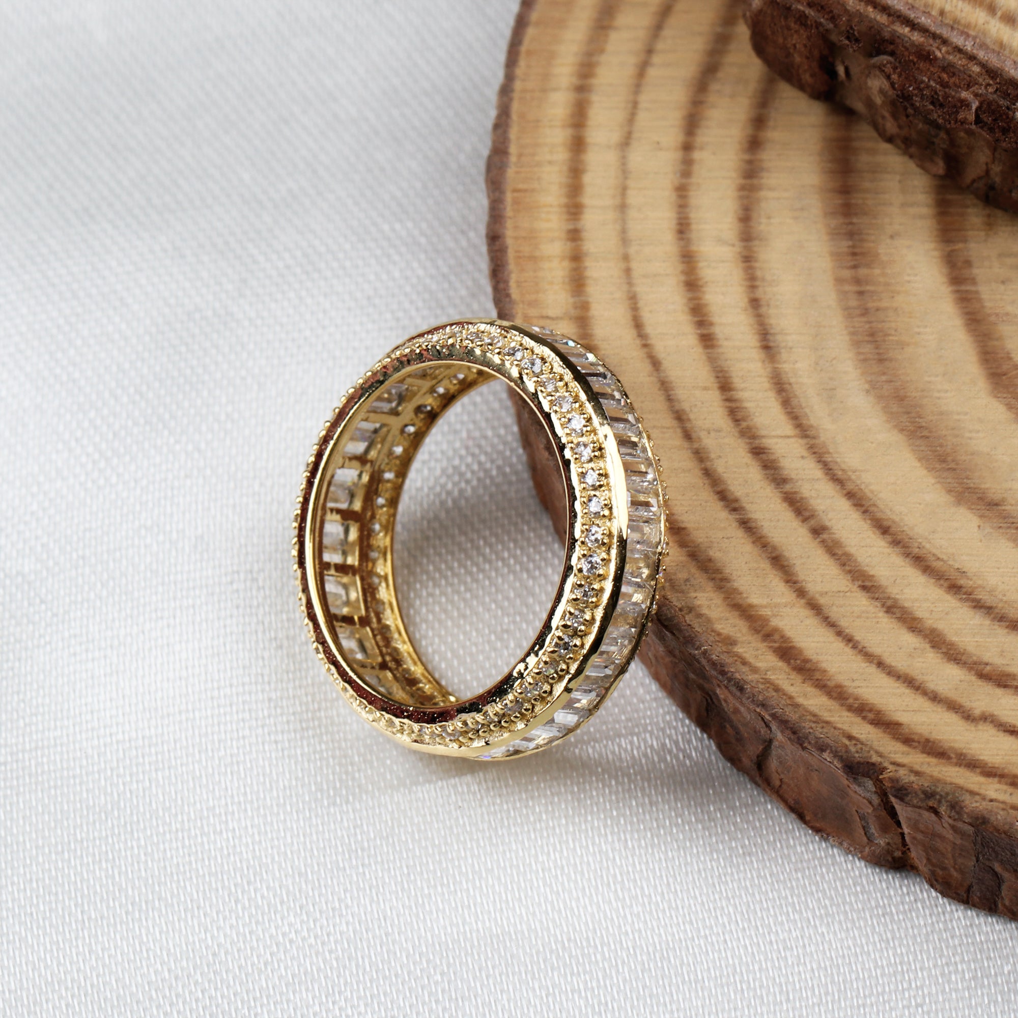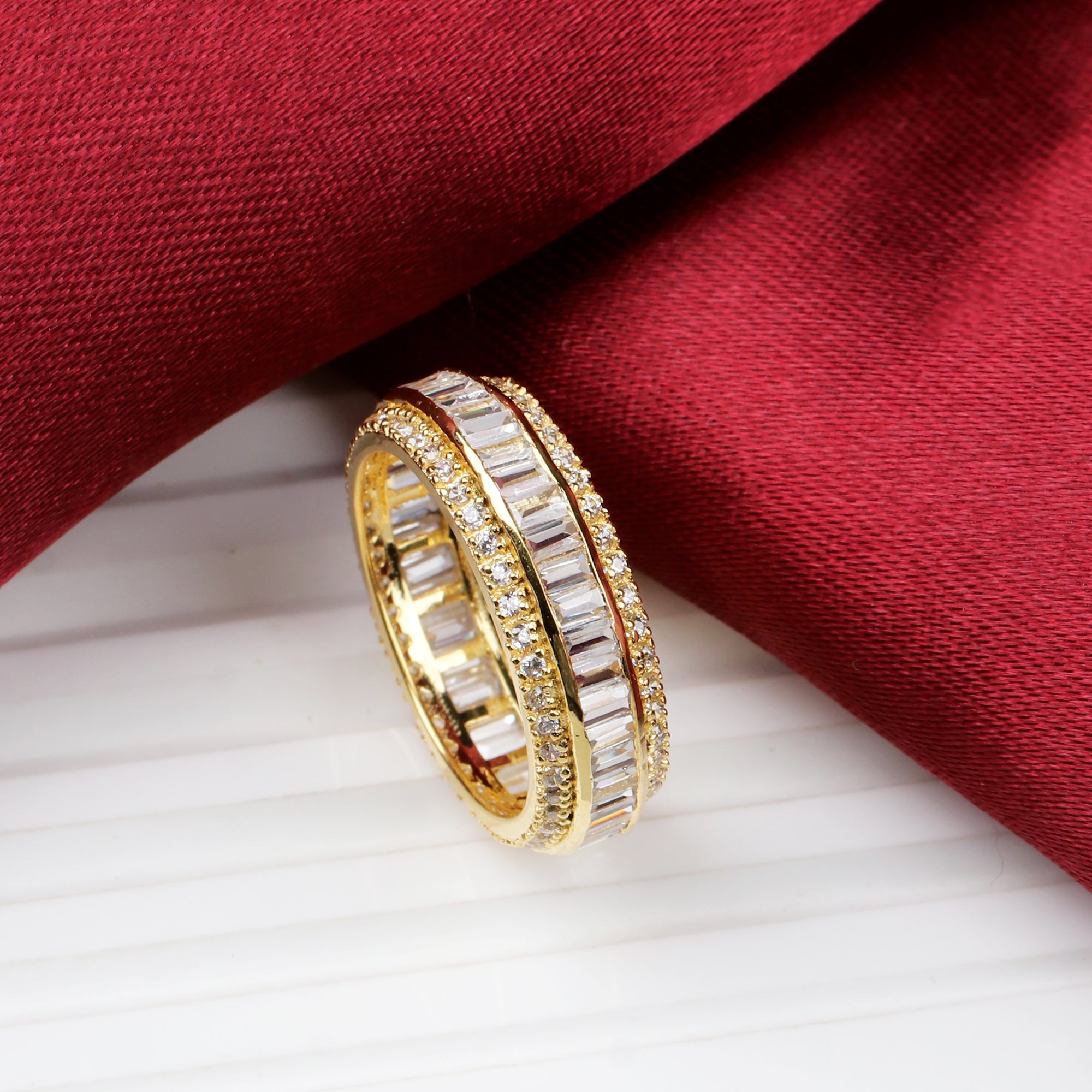 Elevate your style with this stunning triple-row eternity band, featuring sparkling baguette-cut cubic zirconia framed by two shimmering pave rows. Crafted on sterling silver and finished in rich gold plating, it gives a luxurious stacked-band look in a single elegant piece. Perfect for weddings, parties, daily wear, or gifting, this ring brings brilliance, sophistication, and timeless glamor to any collection.