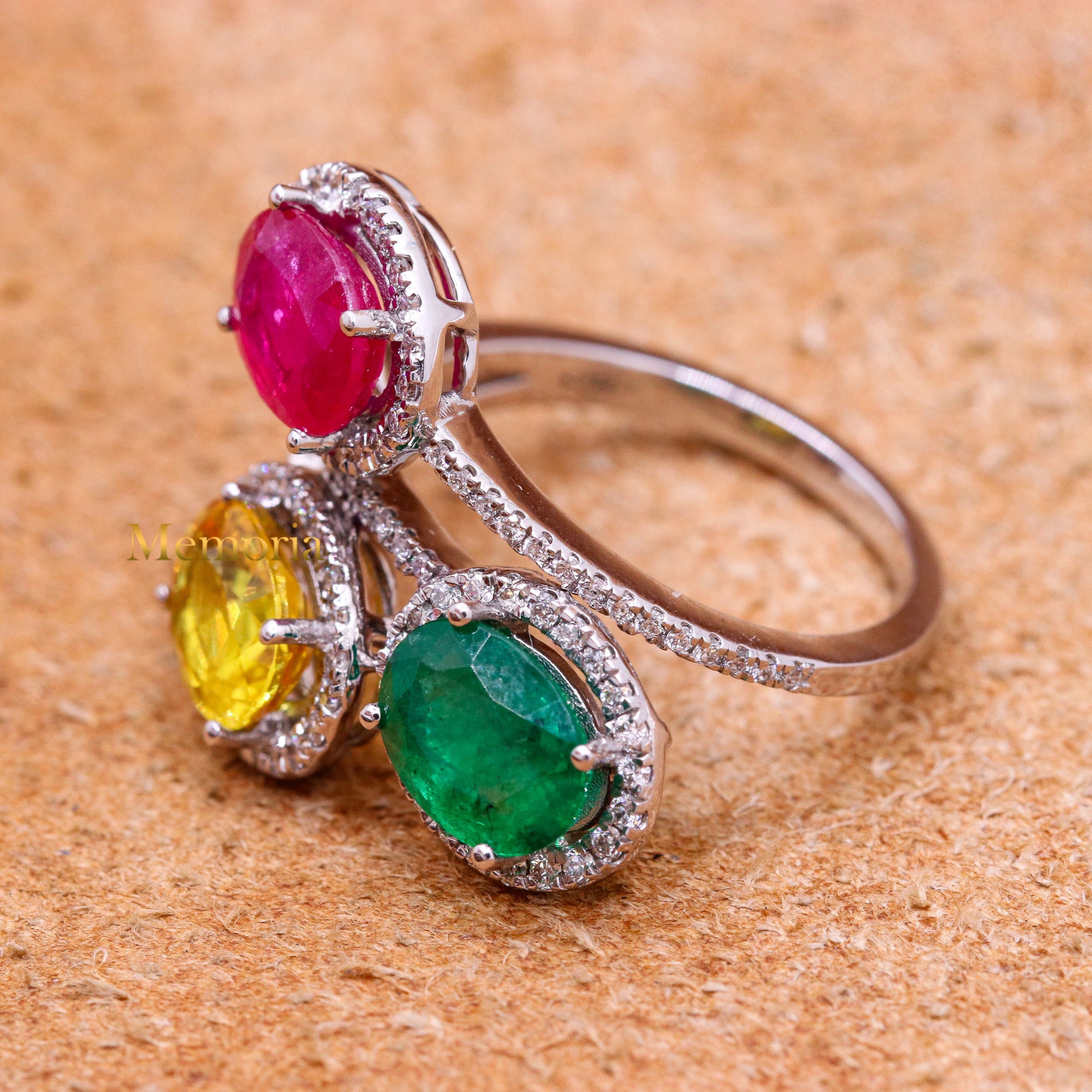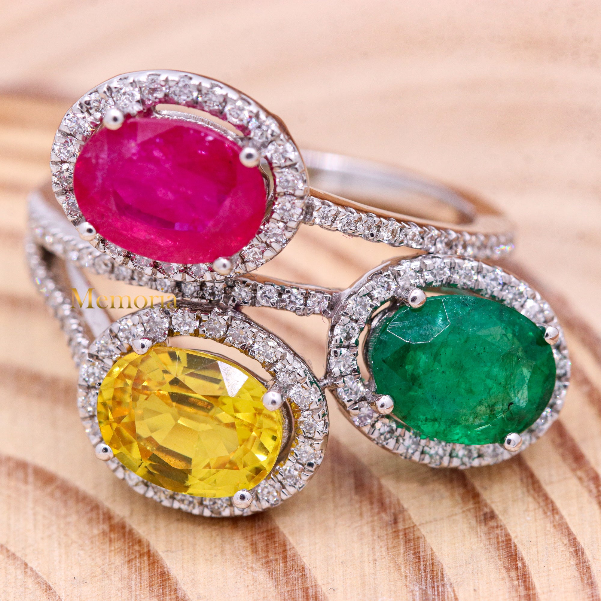 Buy Best Quality Certified Designer Natural Emerald Ruby Yellow Sapphire Oval Shaped Faceted Cut Spiritual Chakra Healing Gemstone With Diamond Ring In 18k White Gold