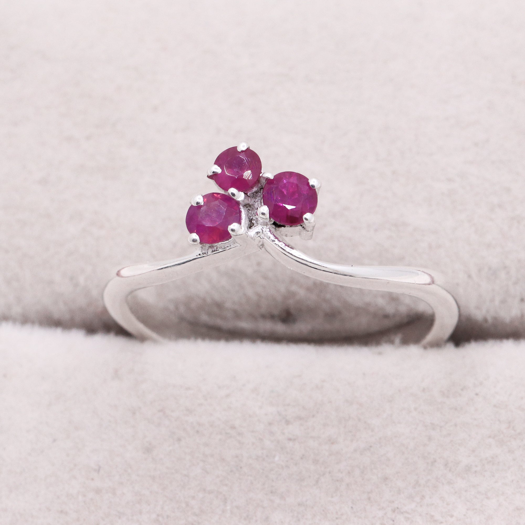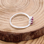 A beautiful Ruby Sterling Silver Ring featuring three natural pink gemstones arranged in a delicate cluster design. The round-cut rubies are prong-set for maximum sparkle, giving the ring a dainty yet elegant look. Perfect for daily wear, gifting, or adding a touch of vibrant color to any outfit.