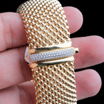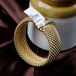This gold plated bracelet features a rich beaded mesh texture paired with a CZ-accented clasp for a touch of sparkle. Its bold, flexible cuff design offers a comfortable unisex fit—perfect for everyday style or special occasions. A luxury statement piece that adds shine, elegance, and modern sophistication to any wrist.