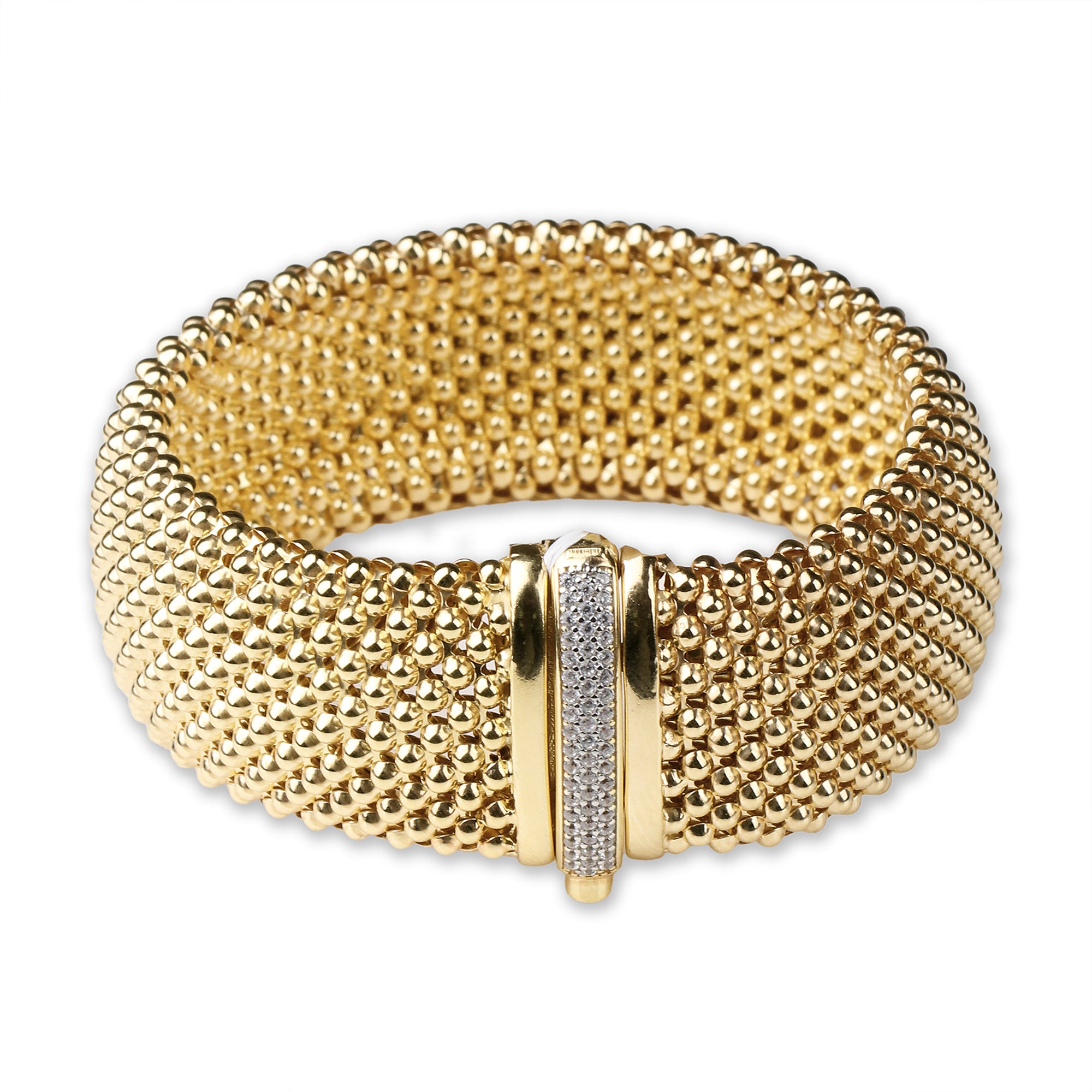 Gold Plated Beaded Mesh Bracelet with CZ Clasp Elegant Statement Cuff