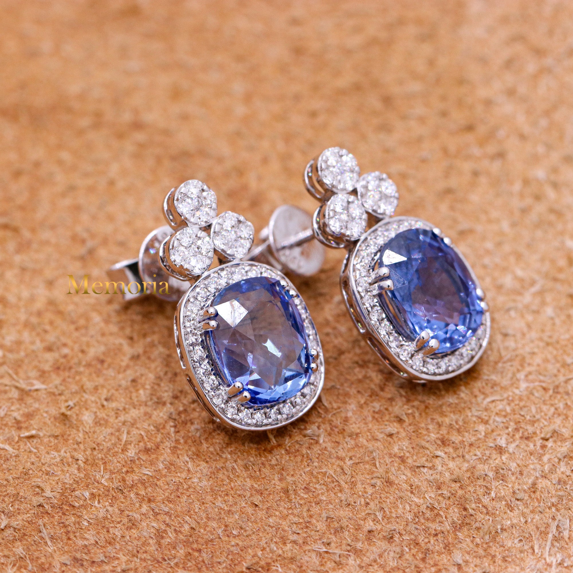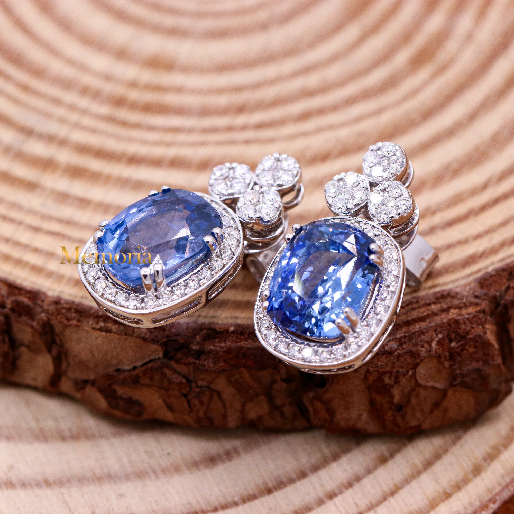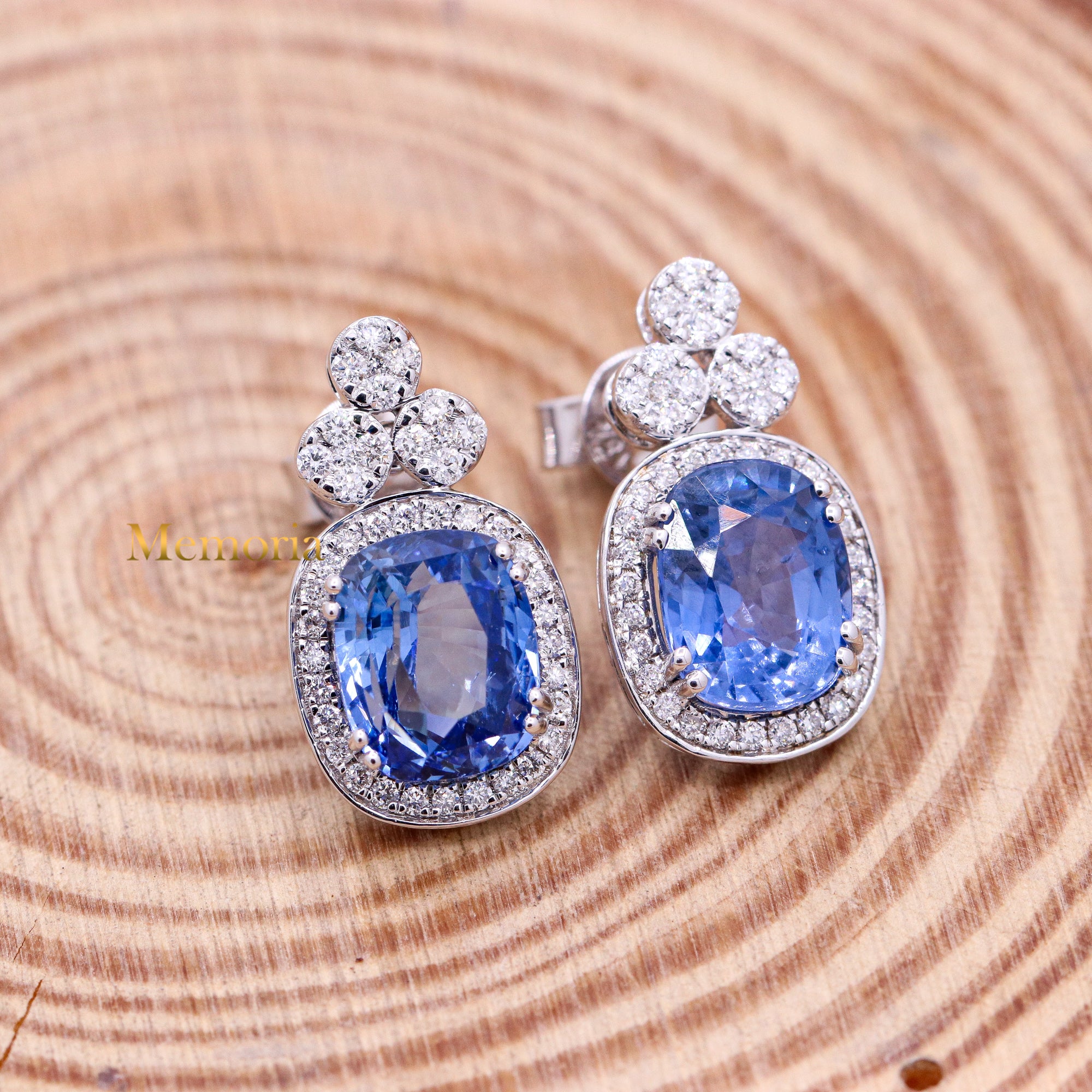 Buy Best Quality Certified Designer Natural Blue Sapphire Oval Shaped Faceted Cut Spiritual Chakra Healing Gemstone With Diamond Stud Earring In 18k White Gold