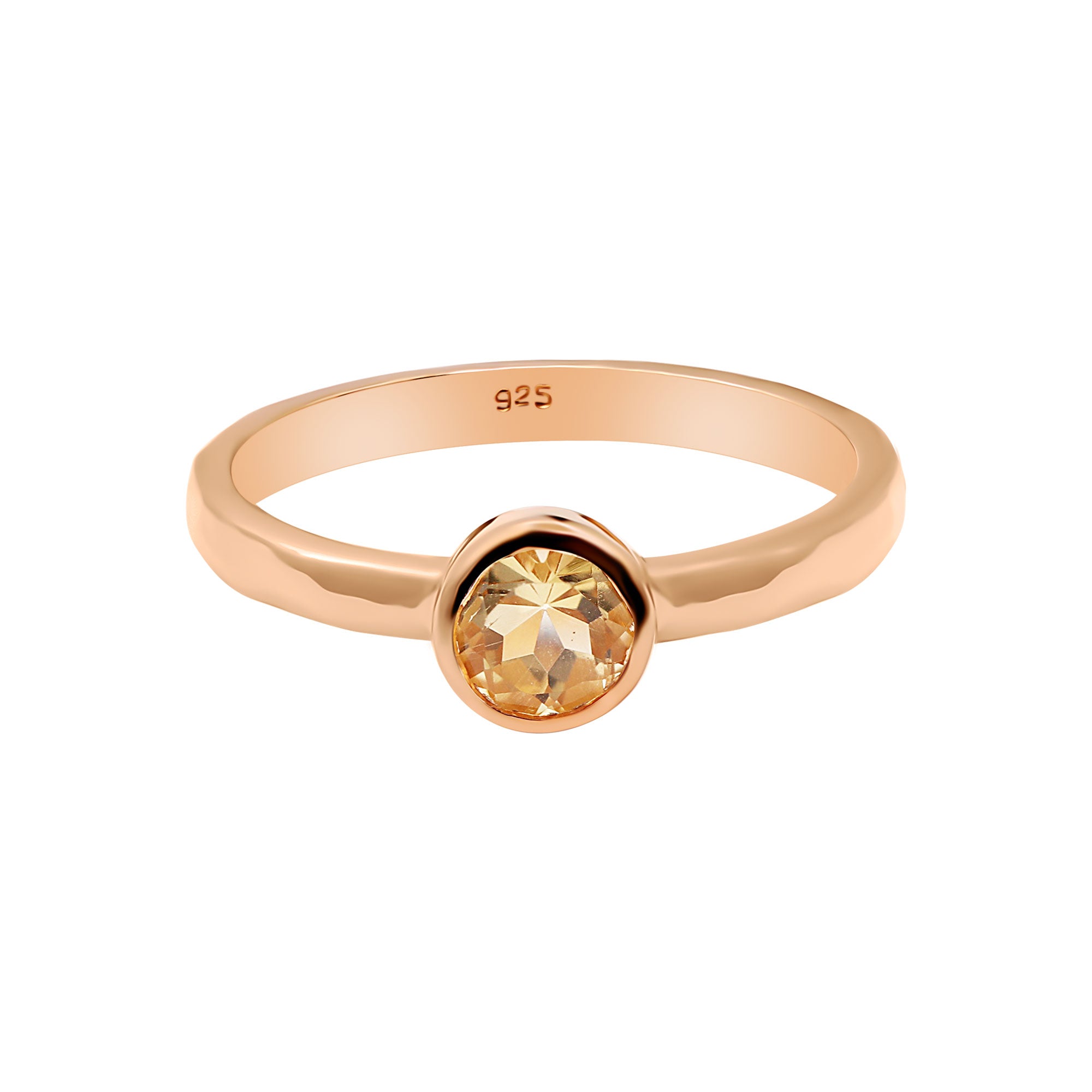 Round Shaped Citrine 925 Rose Gold Plated Hammered Ring