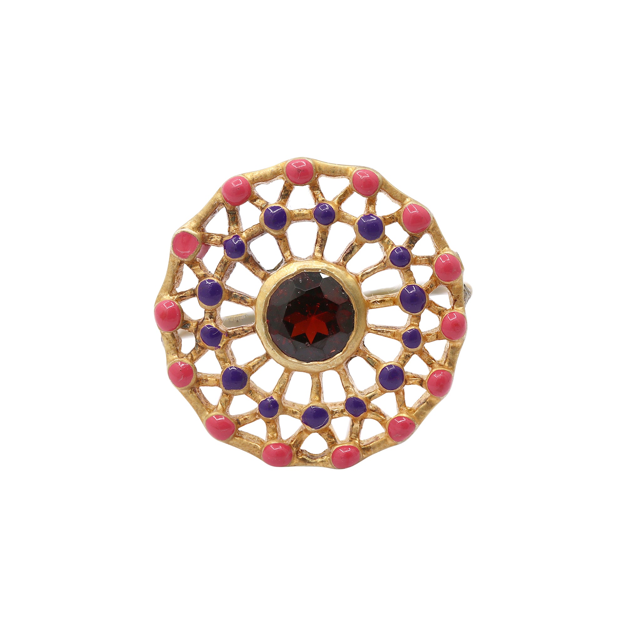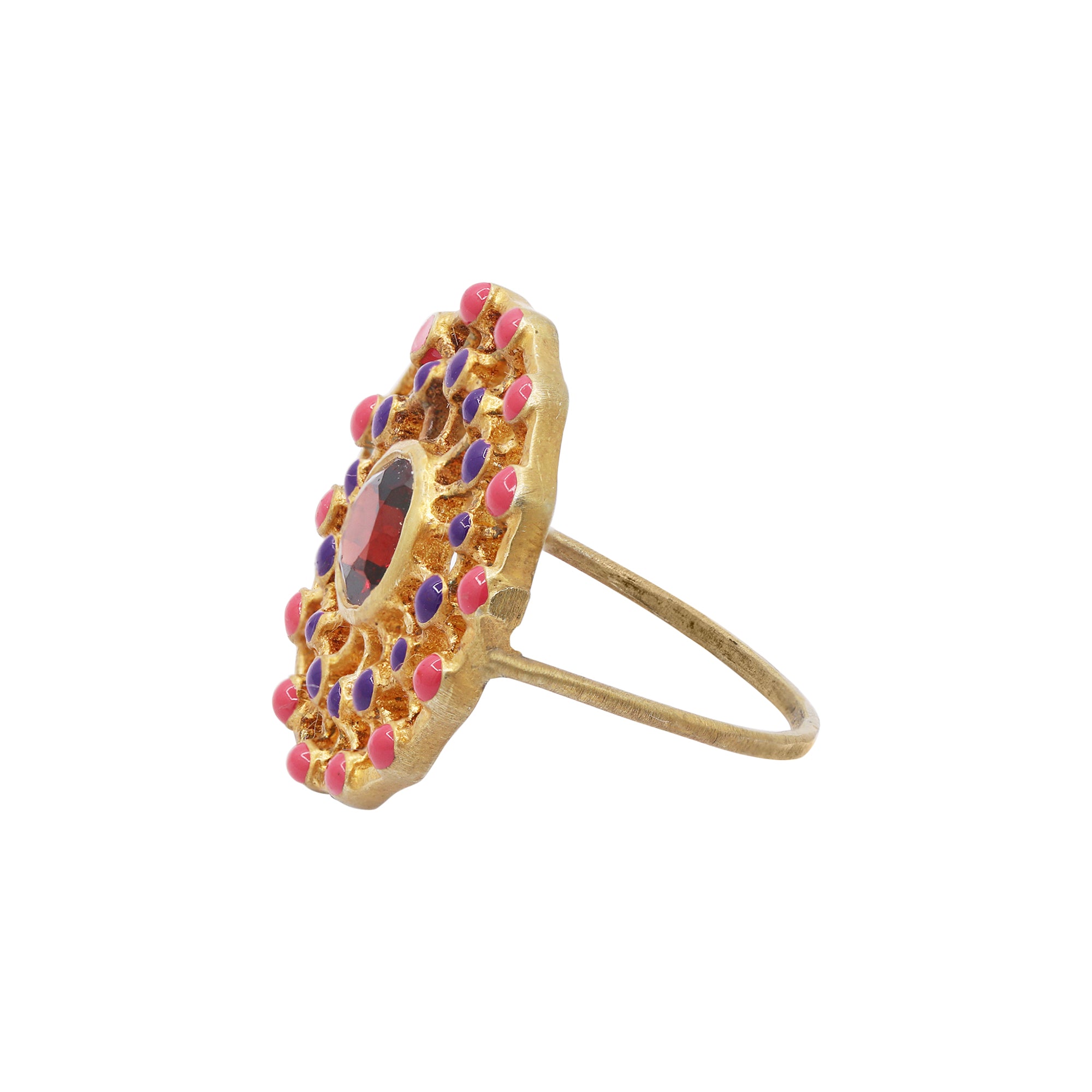 Natural Garnet Gemstone and Enamel Work 925 Sterling Silver Gold Plated Ring