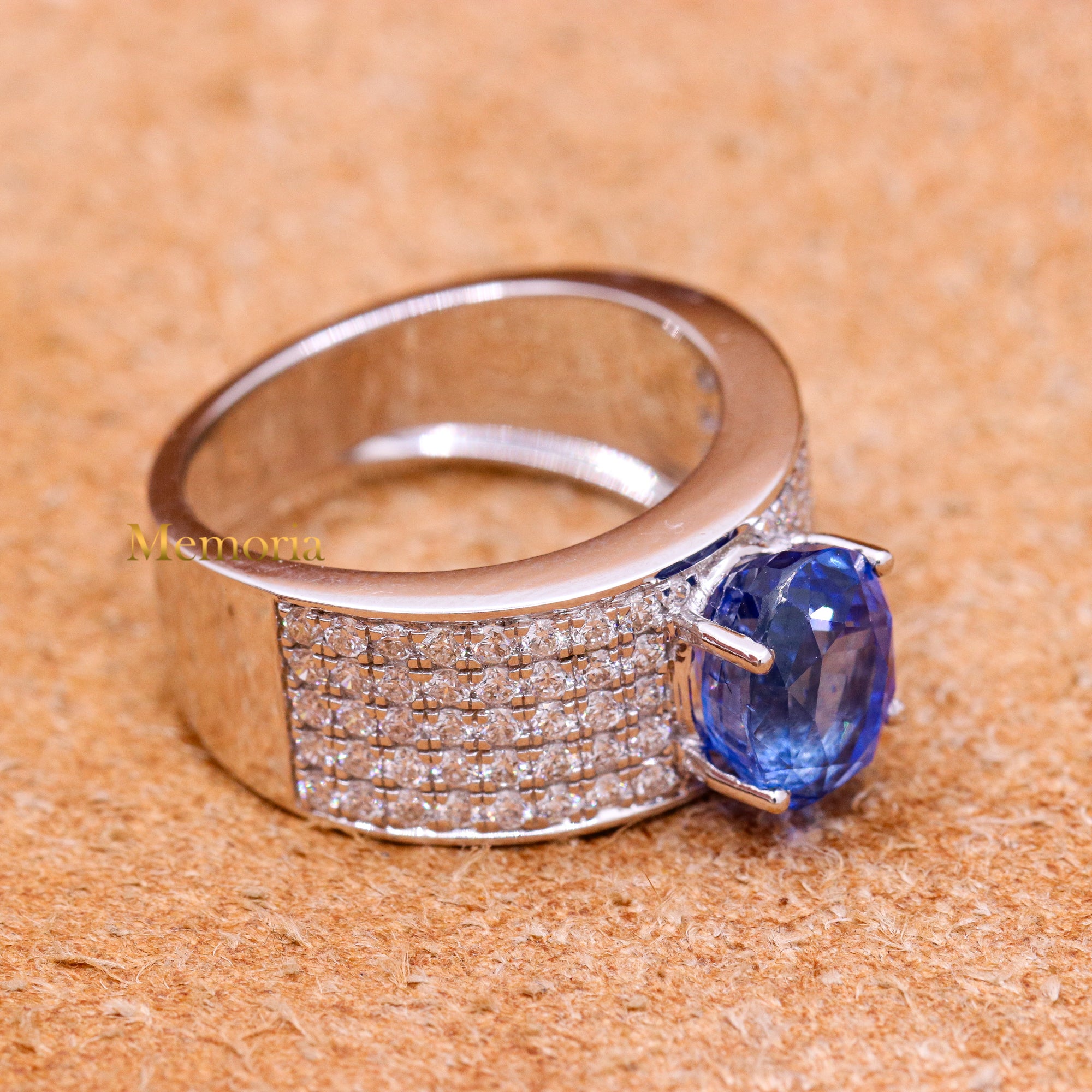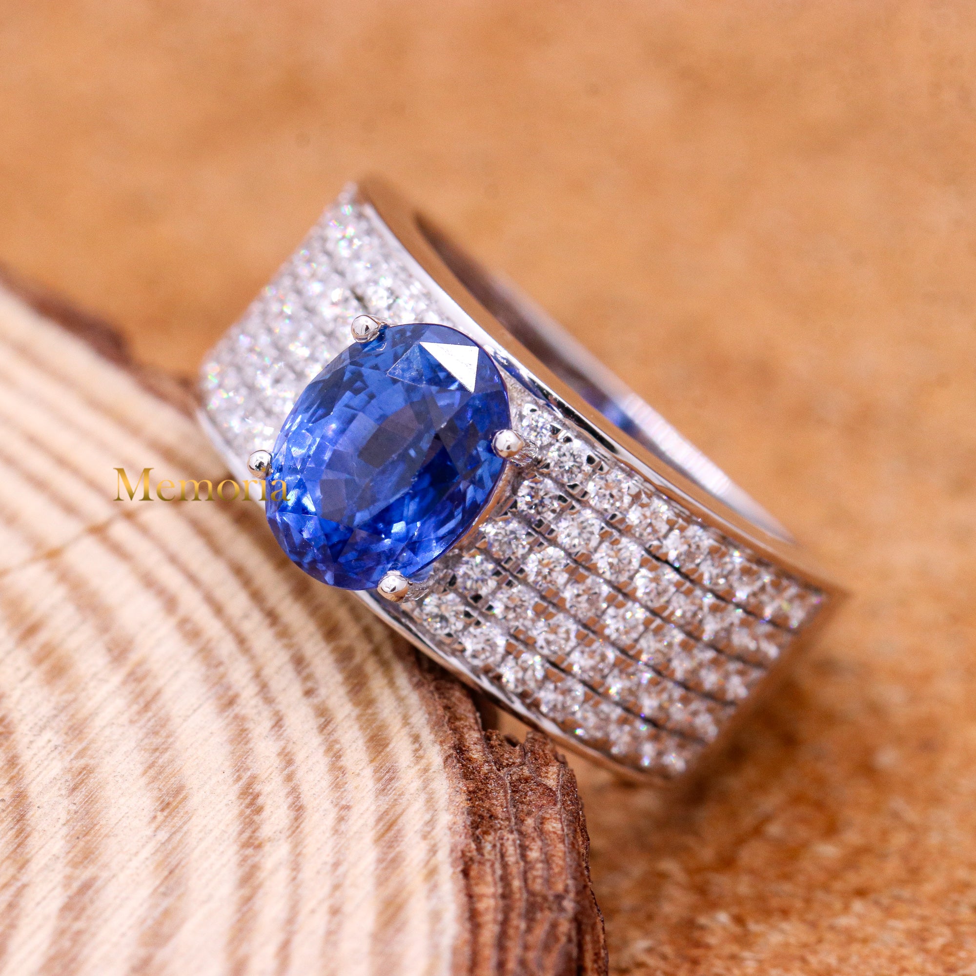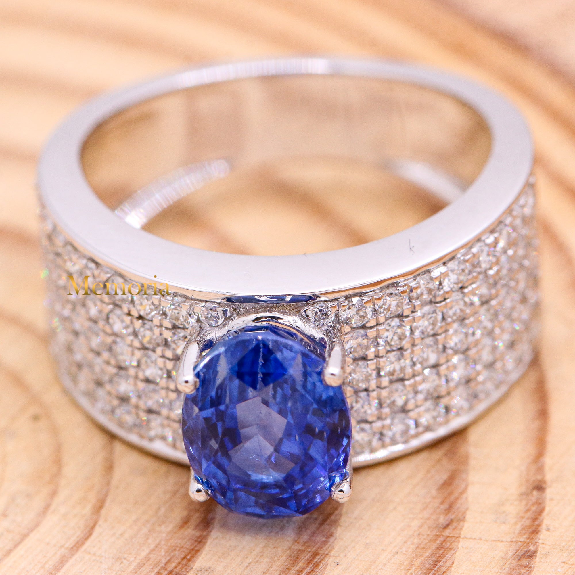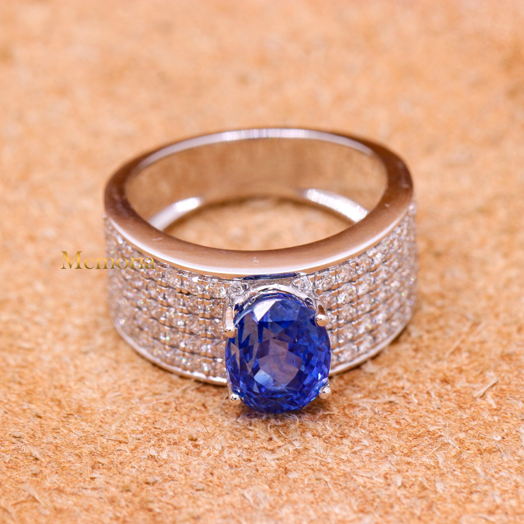 Buy Best Quality Certified Designer Natural Blue Sapphire Oval Shaped Faceted Cut Spiritual Chakra Healing Gemstone With Diamond Ring In 18k White Gold