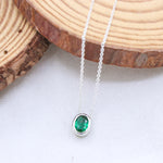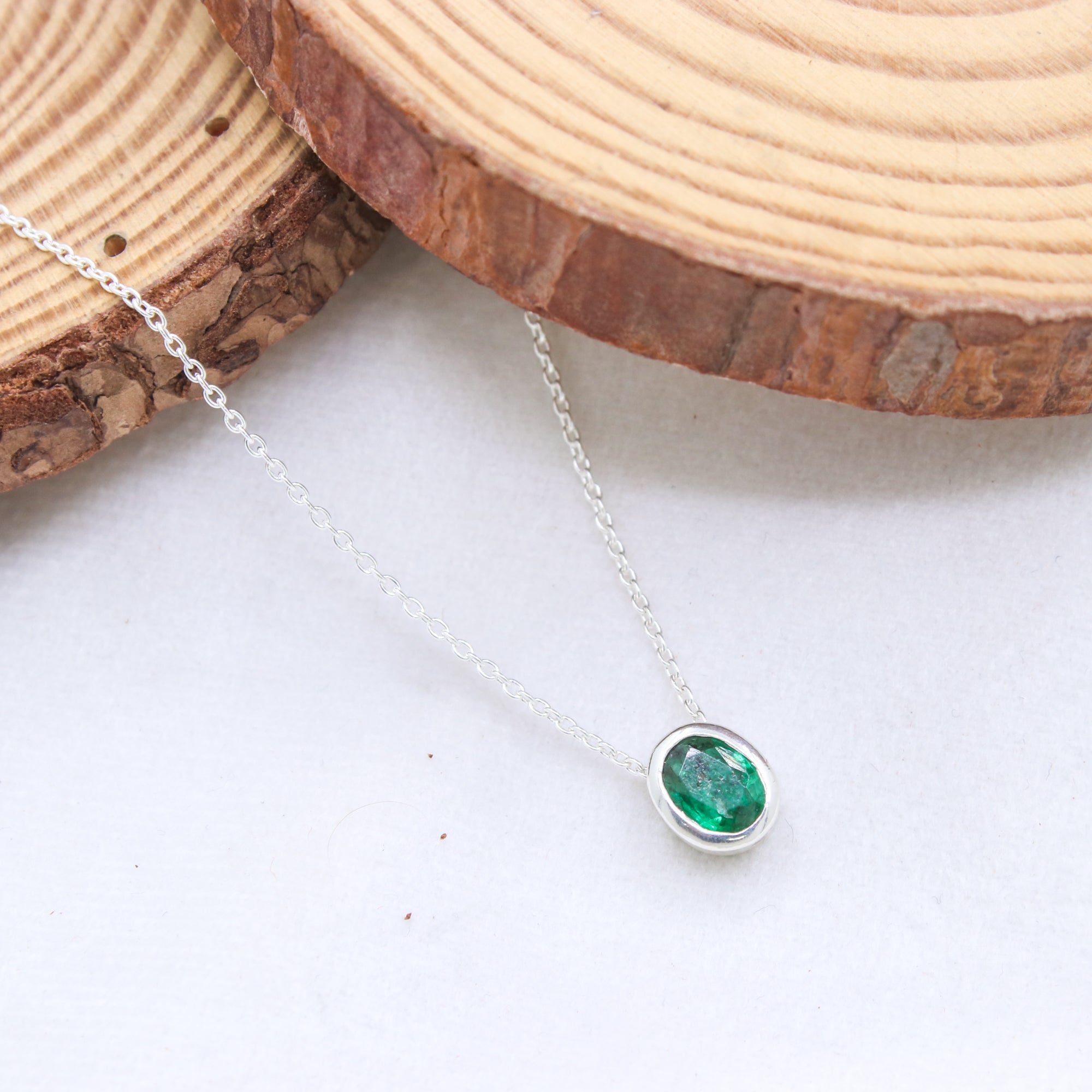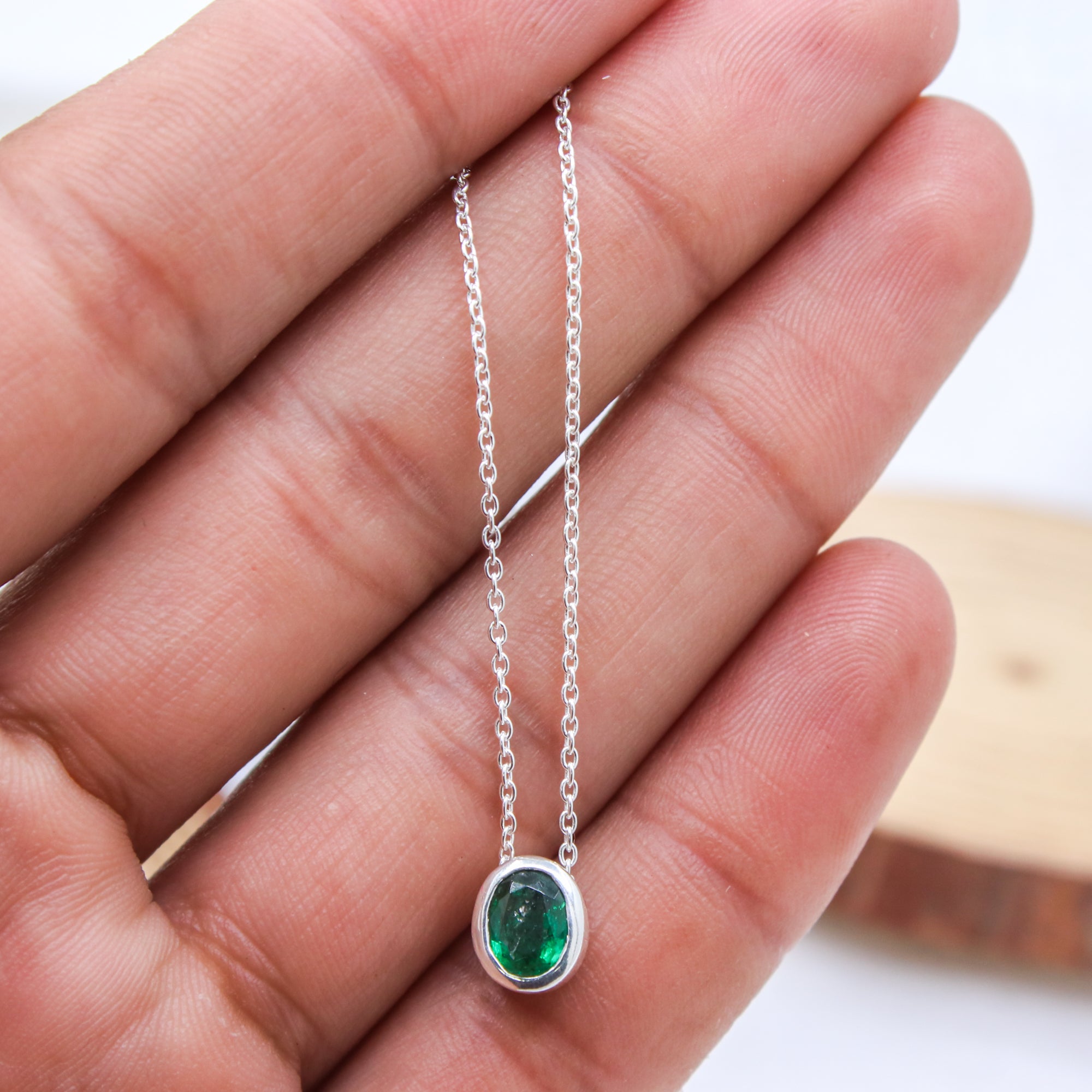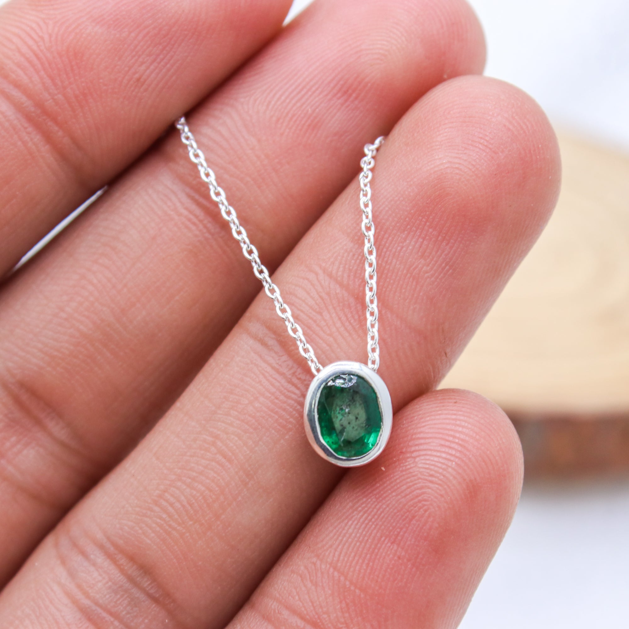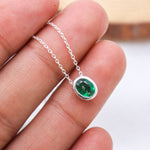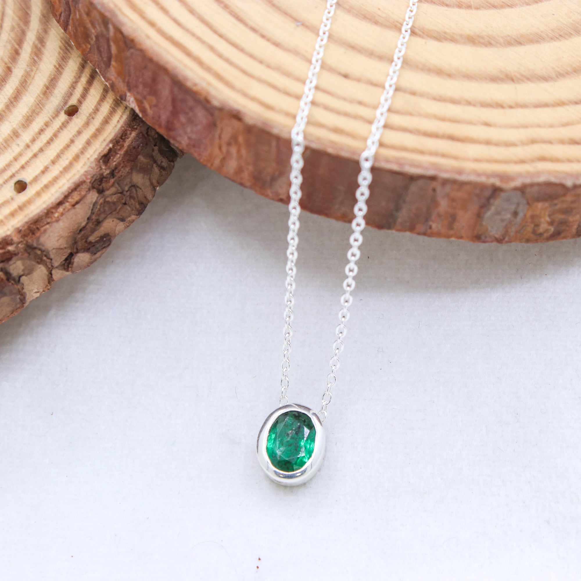 Natural Emerald Sterling Silver Necklace Minimalist Oval Bezel Set Emerald Pendant
