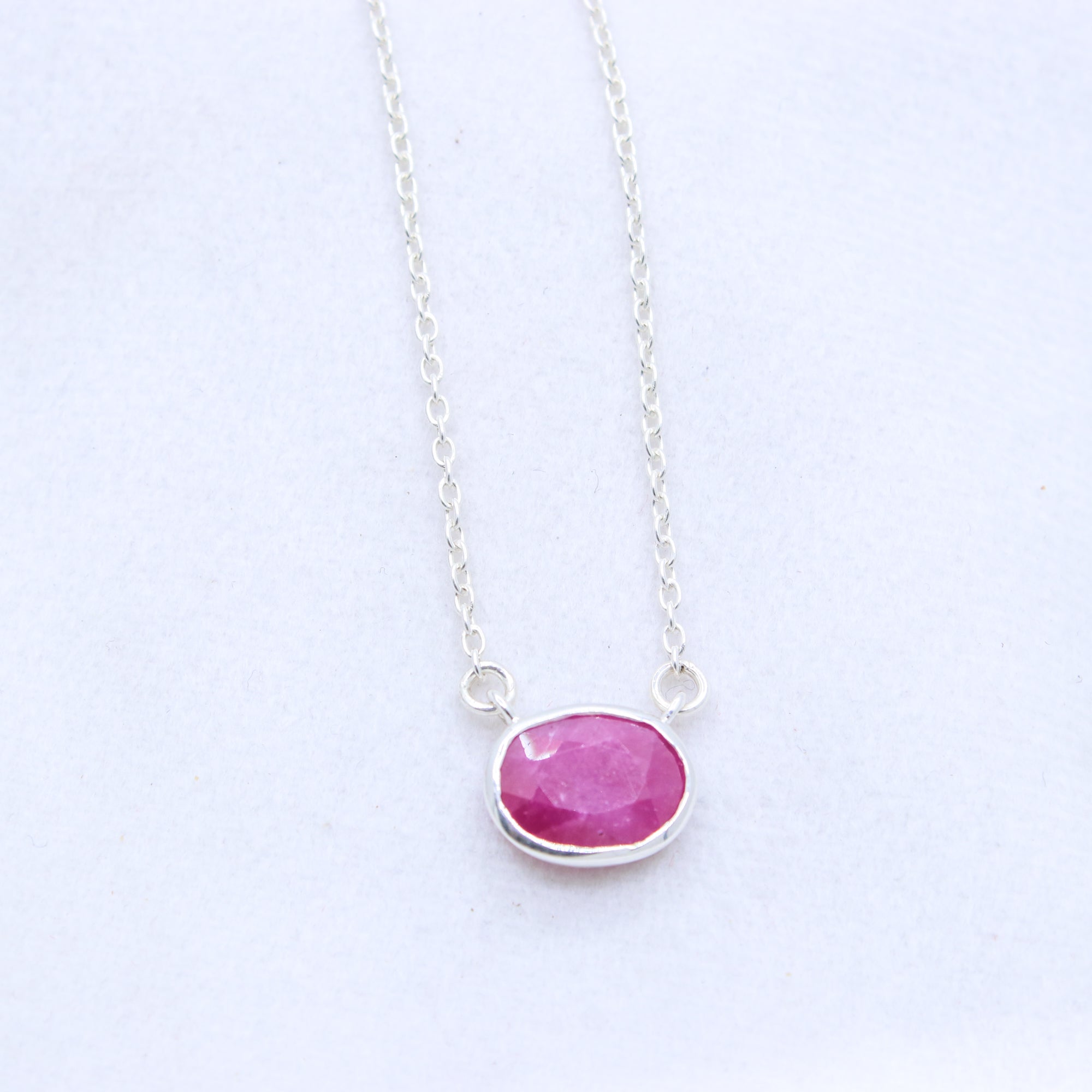 This natural ruby silver necklace features a vibrant, genuine ruby gemstone set in polished 925 sterling silver, creating a timeless piece with rich color and elegant simplicity. The ruby’s deep red hue is beautifully highlighted by a sleek bezel setting, allowing the natural facets to catch the light with every movement.