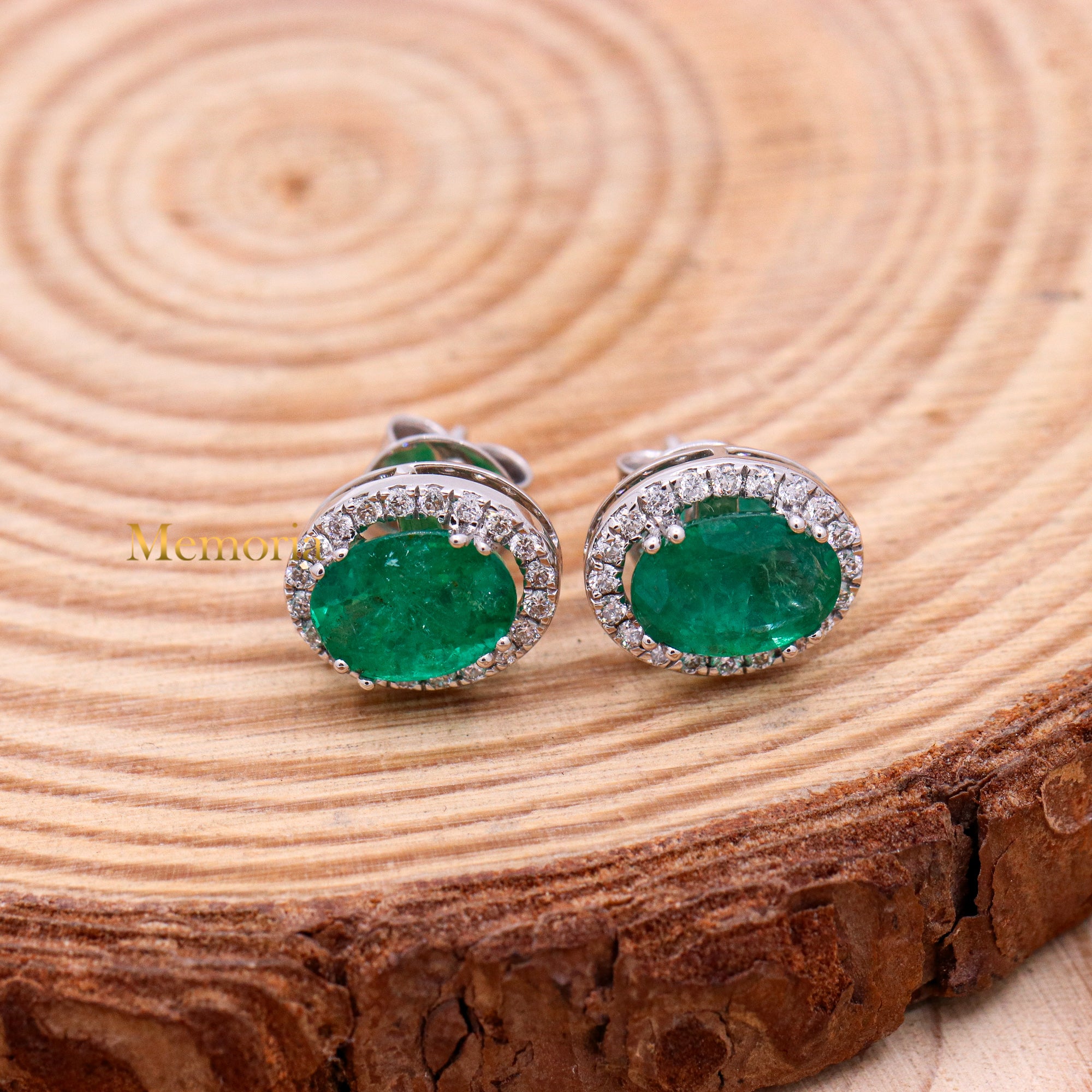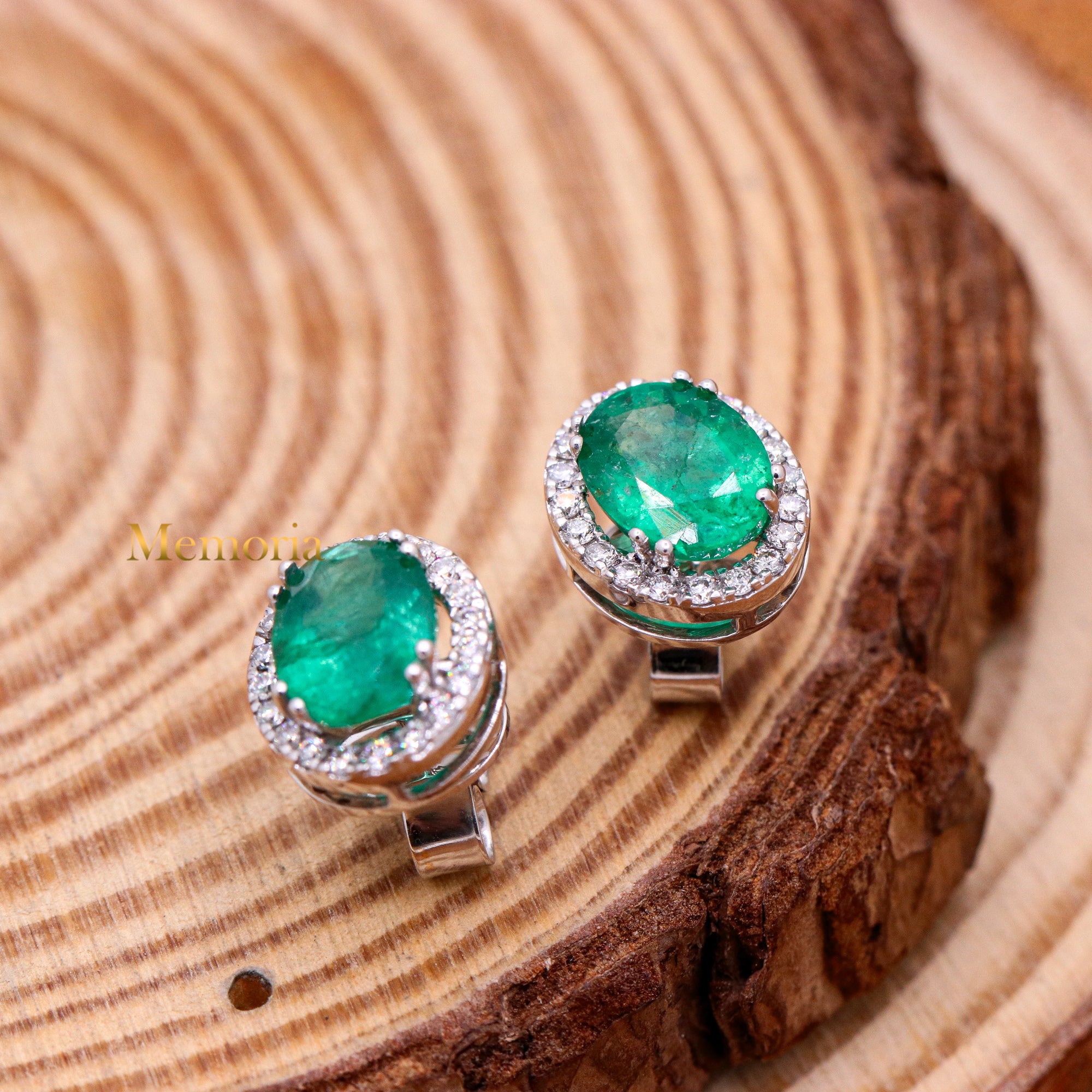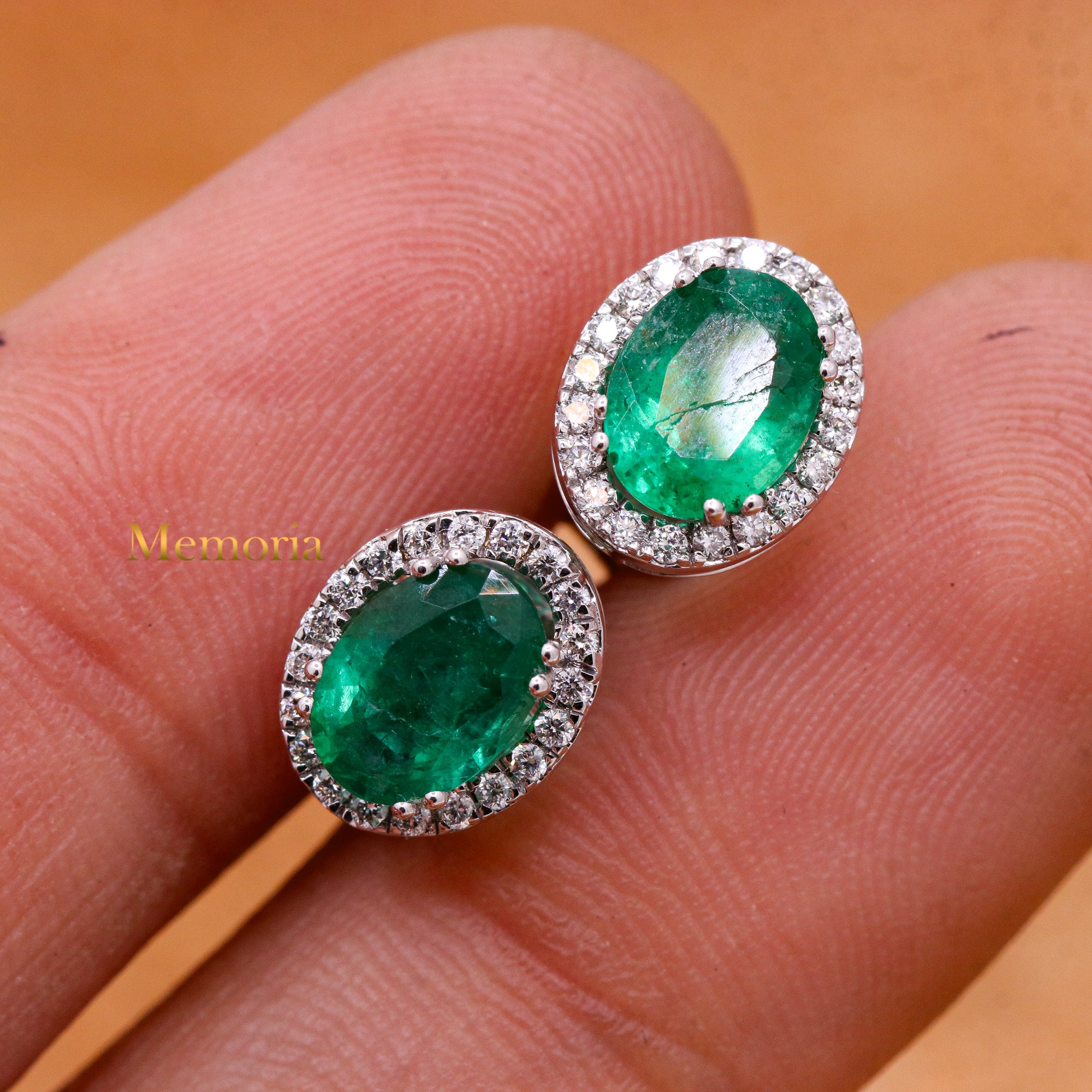 Buy Best Quality Certified Designer Natural Emerald Oval Shaped Faceted Cut Spiritual Chakra Healing Gemstone With Diamond Earring In 18k Yellow Gold