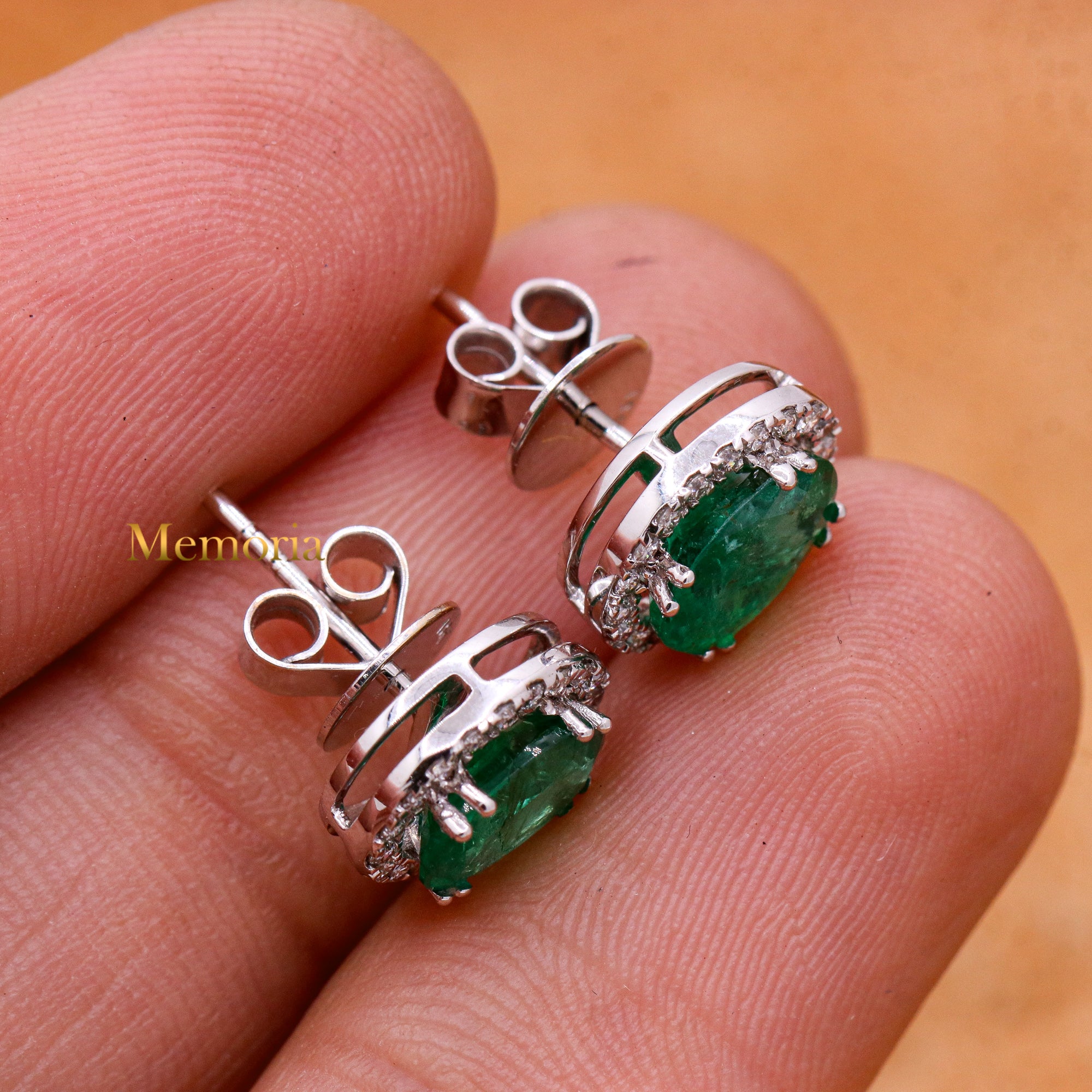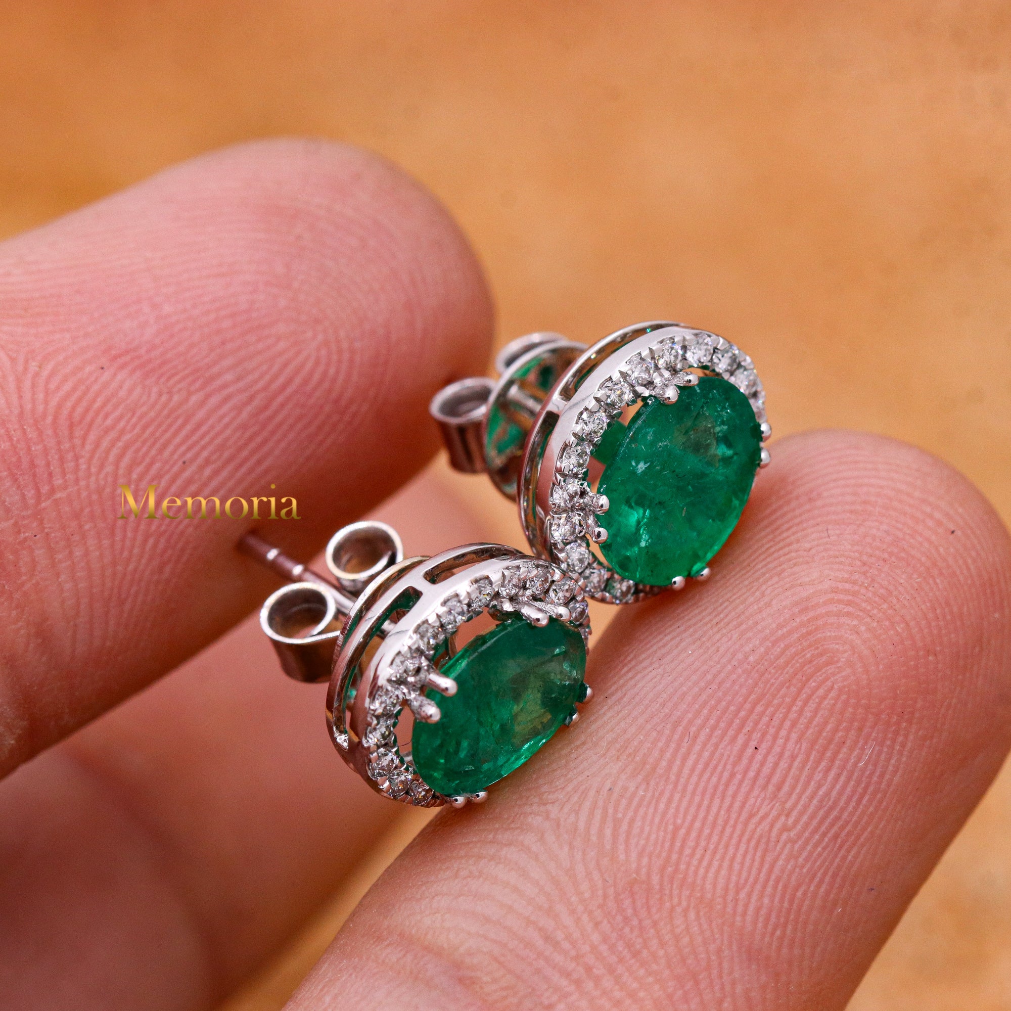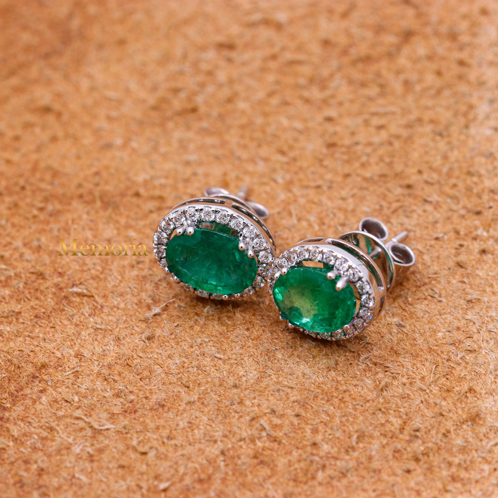 Buy Best Quality Certified Designer Natural Emerald Oval Shaped Faceted Cut Spiritual Chakra Healing Gemstone With Diamond Earring In 18k Yellow Gold
