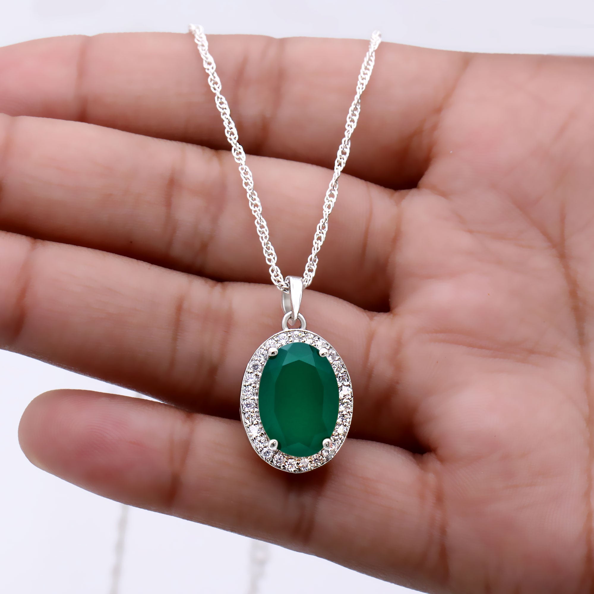 This natural oval shape Green Onyx pendant beautifully set in genuine 925 sterling silver for a timeless and elegant look. The CZ set in the border of the stone and give a luxury look to this pendant. Known as the May birthstone, green onyx symbolizes growth, renewal, and emotional balance.