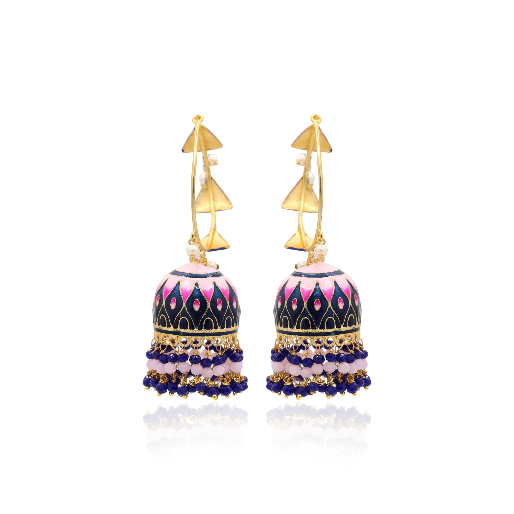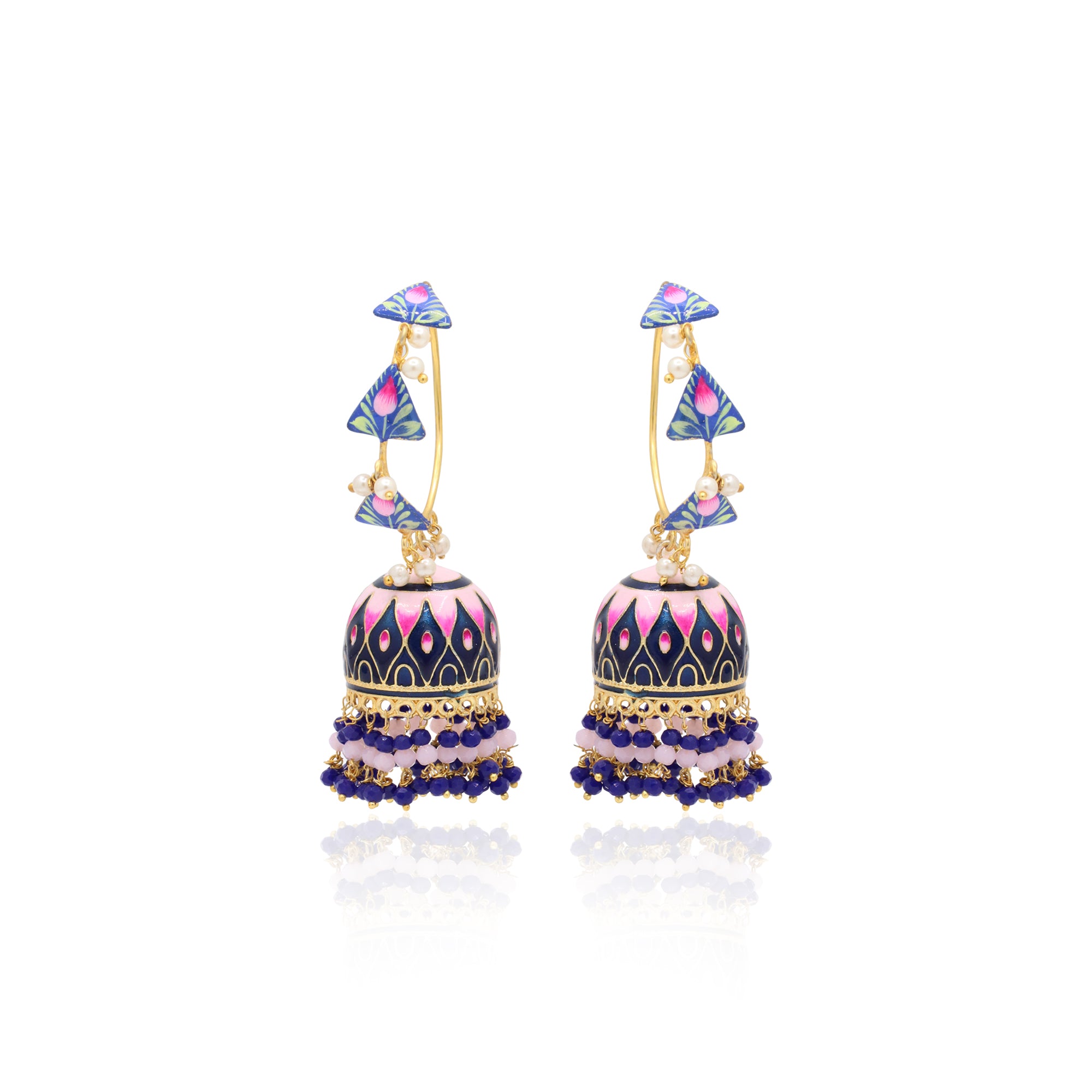 Beautiful Blue Enamel Pink And Blue Stone Pearl Jumka Earring