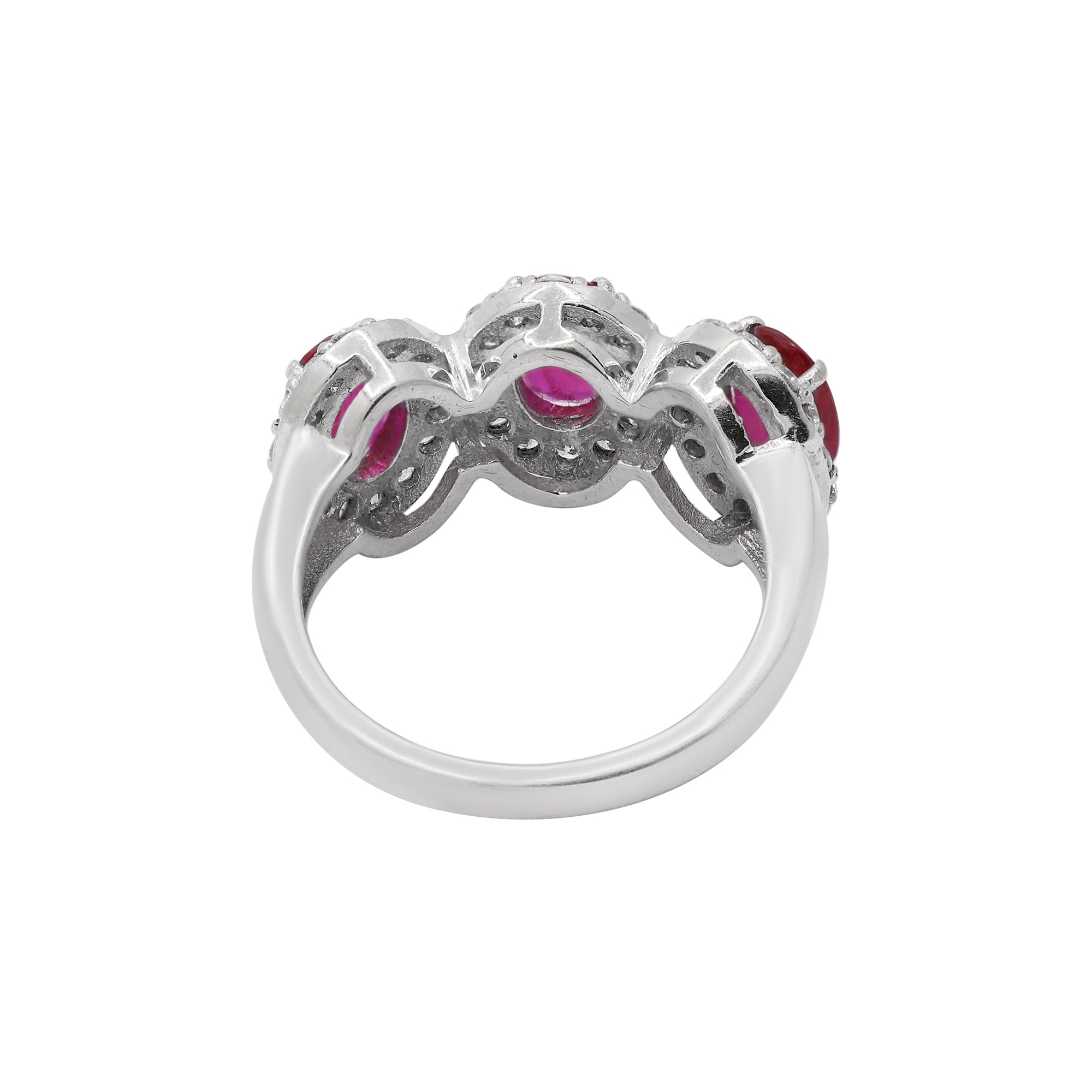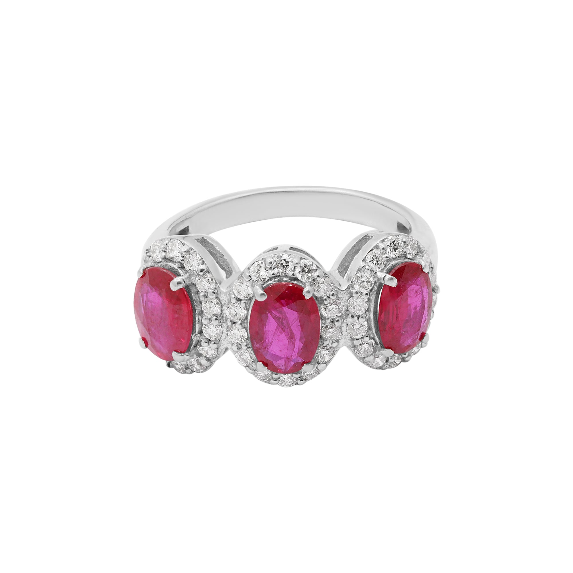 Natural Pink Sapphire Three Stone and Diamond 14k White Gold Ring For Women