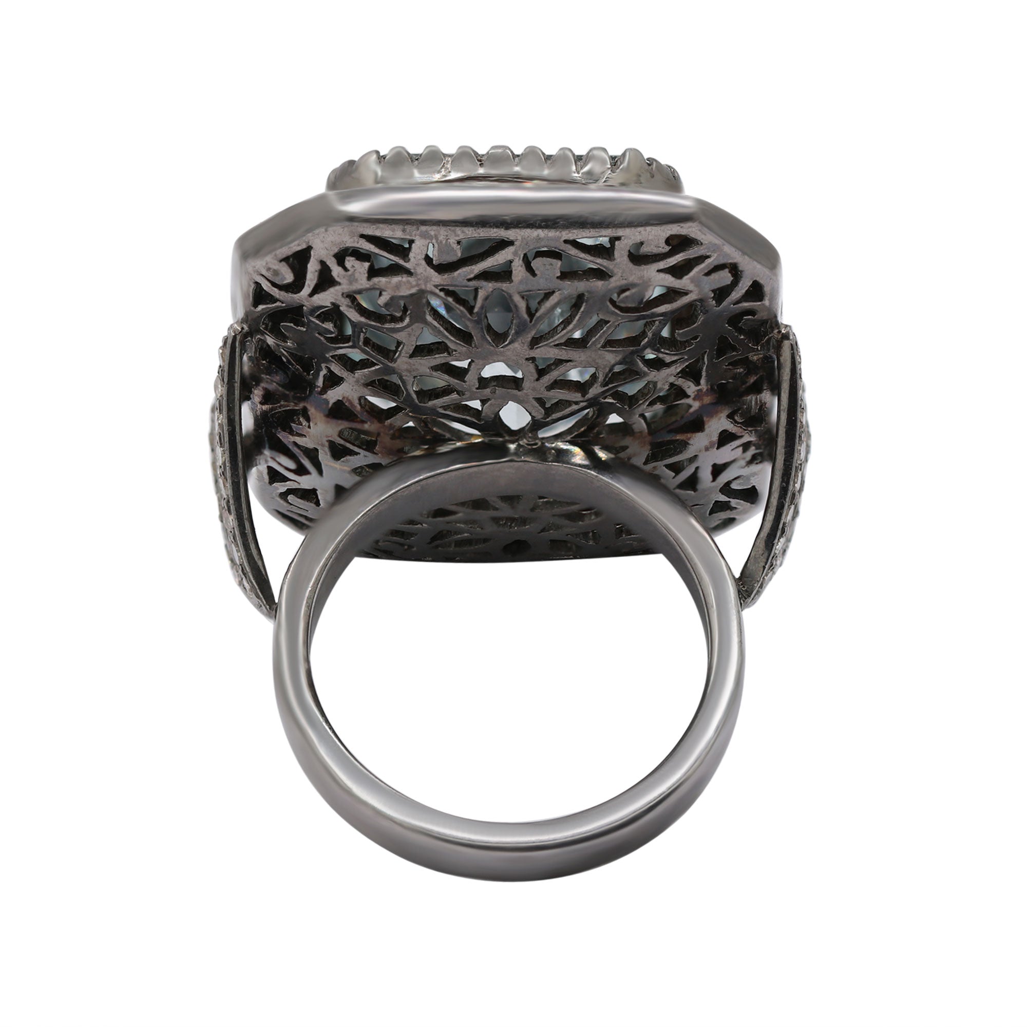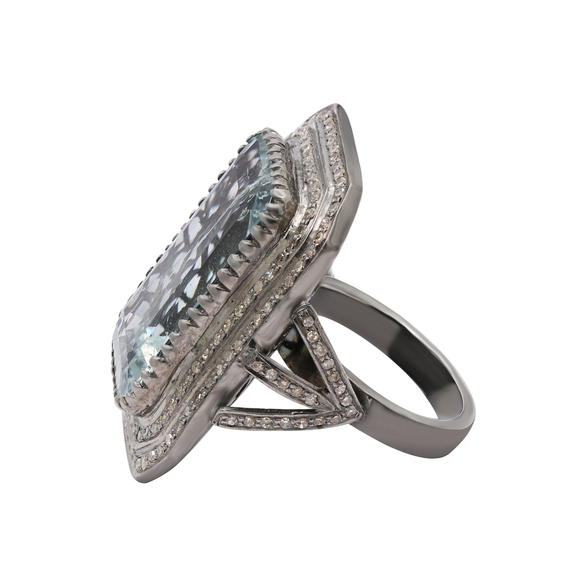 Natural Aquamarine Gemstone and Diamond 925 Sterling Silver Black Rhodium Ring