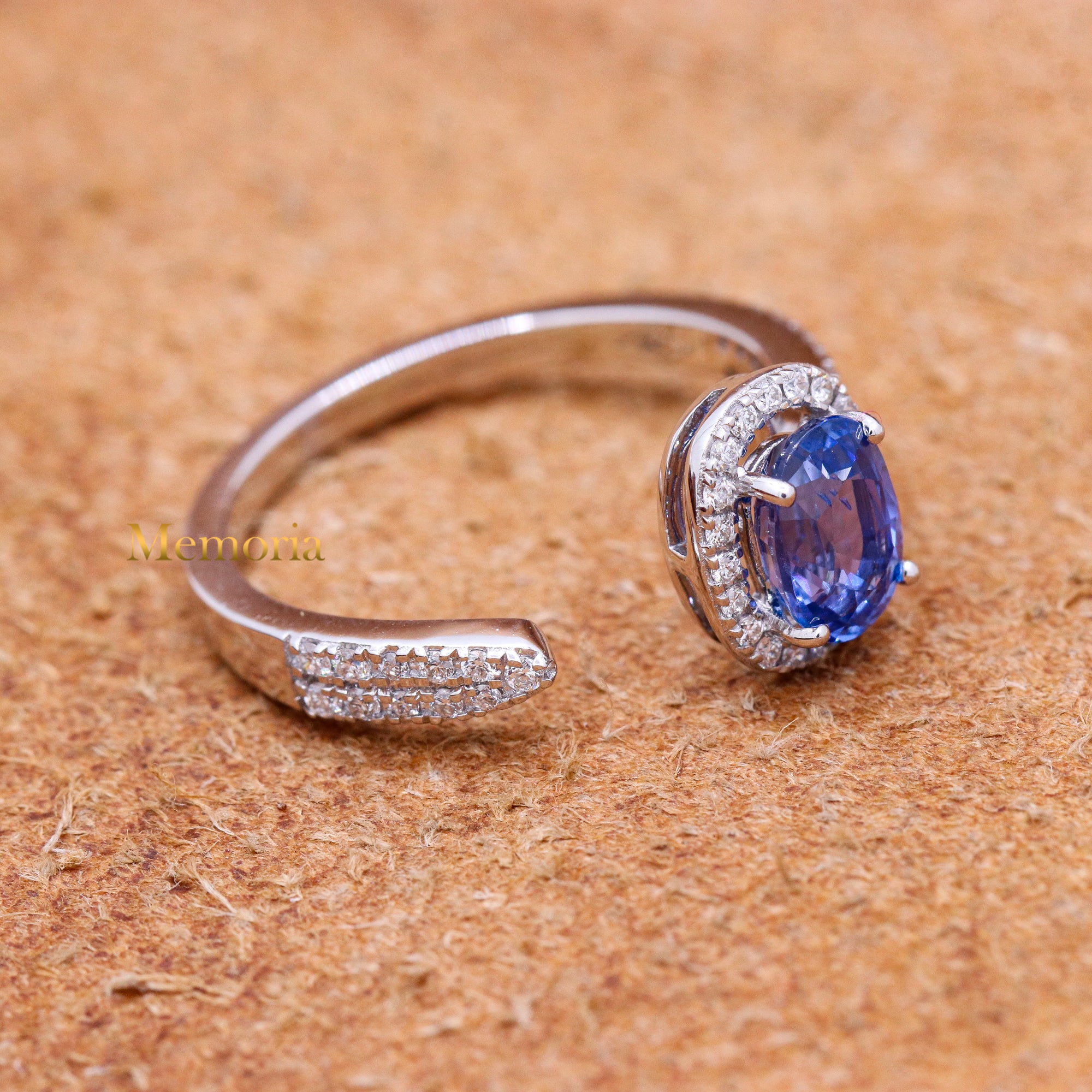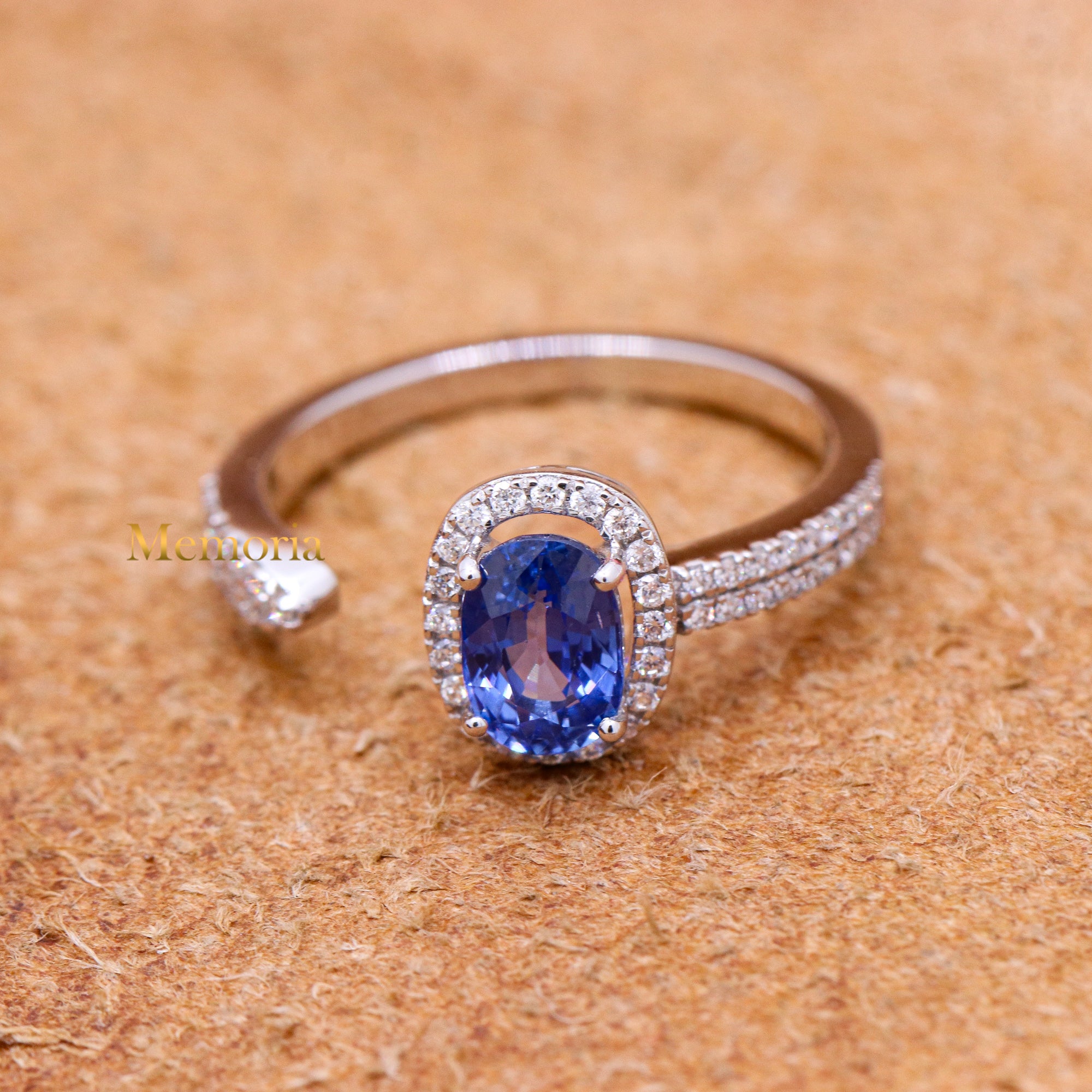 Buy Best Quality Certified Designer Natural Blue Sapphire Oval Shaped Faceted Cut Spiritual Chakra Healing Gemstone With Diamond Ring In 18k White Gold